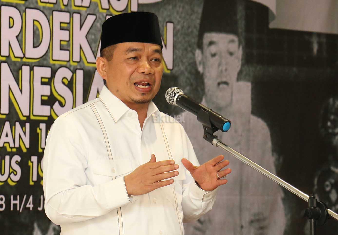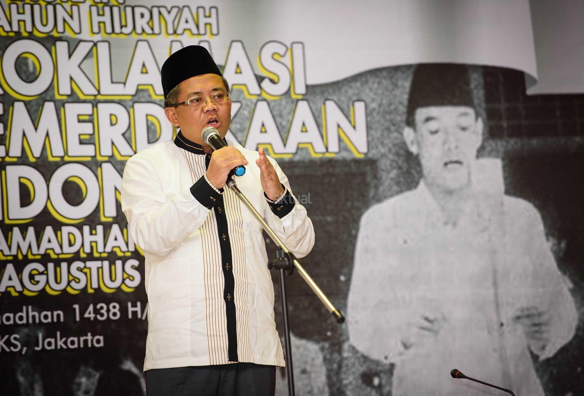 Ketua Fraksi PKS DPR RI Jazuli Juawaini memberikan sambutan saat acara Tasyakuran 74 Tahun Hijriah Proklamasi Kemerdekaan RI di Aula MD Building, Jakarta Selatan, Minggu (4/6/2017). Acara ini dihadiri oleh Presiden PKS M. Sohibul Iman, Sekjen DPP PKS Mustafa Kamal, Wasekjen DPP PKS Abdul Hakim, Kabid Humas DPP PKS Ledia Hanifah, Kabid PKK DPP PKS Wirianingsih, Wakil Ketua Komisi VIII DPR-RI Iskan Qolba Lubis, Ketua Badan Perencanaan DPP PKS Bukhori Yusuf, Legiun Veteran Republik Indonesia (LVRI) dan beberapa anak yatim. AKTUAL/HO