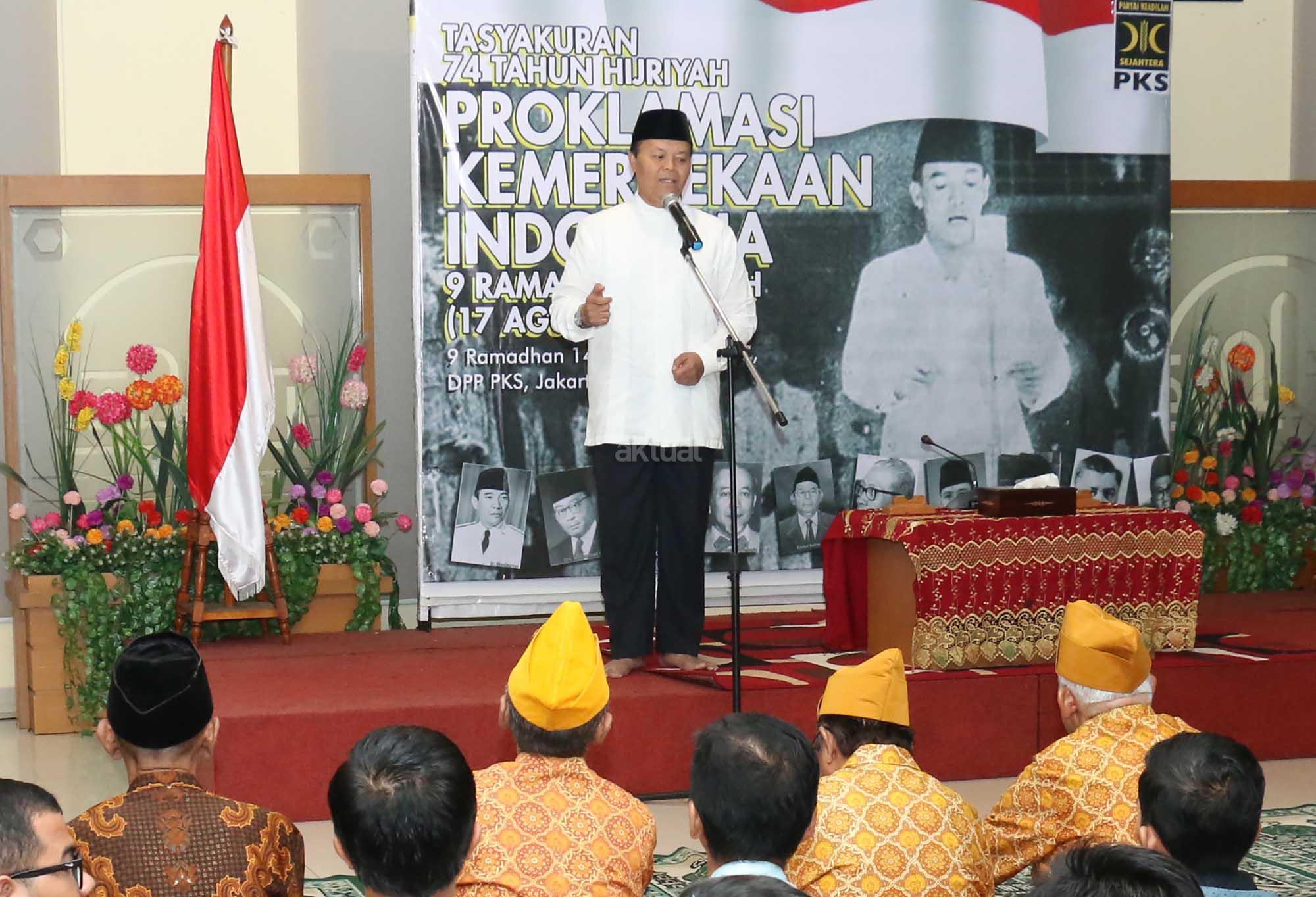 Presiden Partai Keadilan Sejahtera (PKS) Muhammad Sohibul Iman memberikan sambutan saat acara Tasyakuran 74 Tahun Hijriah Proklamasi Kemerdekaan RI di Aula MD Building, Jakarta Selatan, Minggu (4/6/2017). Acara ini dihadiri oleh Sekjen DPP PKS Mustafa Kamal, Wasekjen DPP PKS Abdul Hakim, Ketua FPKS DPR RI Jazuli Juwaini, Kabid Humas DPP PKS Ledia Hanifah, Kabid PKK DPP PKS Wirianingsih, Wakil Ketua Komisi VIII DPR-RI Iskan Qolba Lubis, Ketua Badan Perencanaan DPP PKS Bukhori Yusuf, Legiun Veteran Republik Indonesia (LVRI) dan beberapa anak yatim. AKTUAL/HO