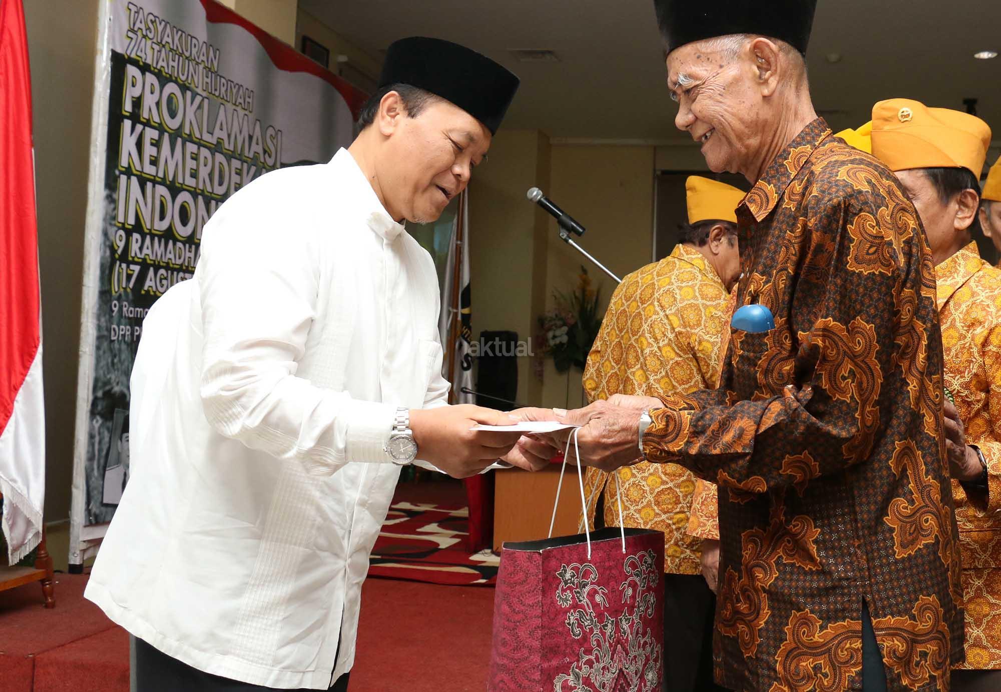Testimoni dari perwakilan LVRI Ghozi Idrus saat acara Tasyakuran 74 Tahun Hijriah Proklamasi Kemerdekaan RI di Aula MD Building, Jakarta Selatan, Minggu (4/6/2017). Acara ini dihadiri oleh Presiden PKS M. Sohibul Iman, Sekjen DPP PKS Mustafa Kamal, Wasekjen DPP PKS Abdul Hakim, Ketua FPKS DPR RI Jazuli Juwaini, Kabid Humas DPP PKS Ledia Hanifah, Kabid PKK DPP PKS Wirianingsih, Wakil Ketua Komisi VIII DPR-RI Iskan Qolba Lubis, Ketua Badan Perencanaan DPP PKS Bukhori Yusuf, Legiun Veteran Republik Indonesia (LVRI) dan beberapa anak yatim. AKTUAL/HO