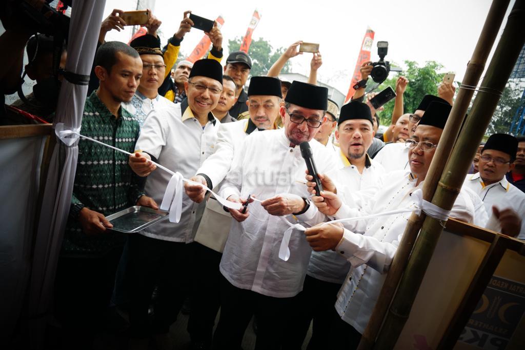 Pengguntingan pita sebagai simbolis Launching Posko Mudik PKS 2017 oleh Ketua Majelis Syuro Salim Segaf Al Jufri dan Presiden PKS M. Shohibul Iman yang bertempat di Jalan Inspeksi Kalimalang, Bekasi, Jawa Barat, Kamis (22/6). AKTUAL/HO