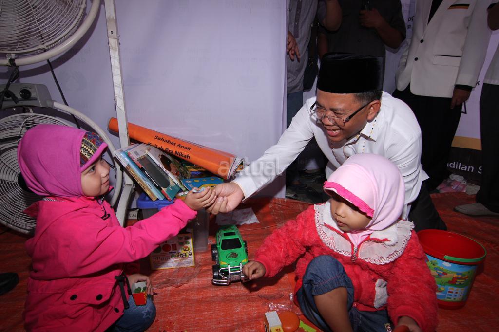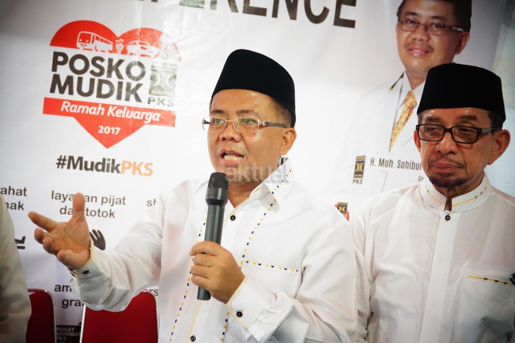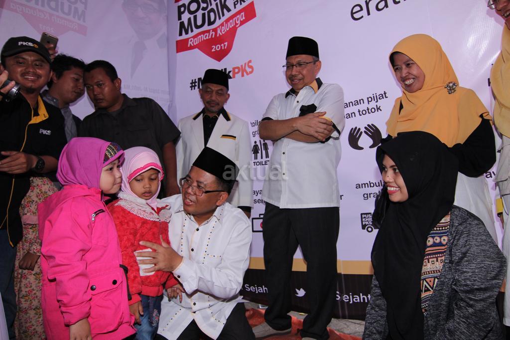 Presiden PKS tengah menyapa hangat anak-anak pemudik yang singgah yang sedang bermain di arena bermain yang disediakan Posko Mudik PKS Bekasi , di Jalan Inspeksi Kalimalang, Bekasi, Jawa Barat, Kamis (22/6). AKTUAL/HO