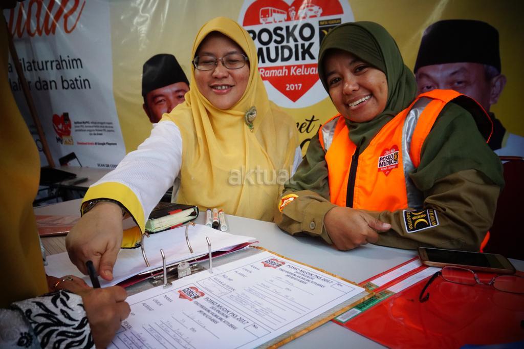 Kabid Humas DPP PKS Ledia Hanifah bersama petugas posko mudik bekasi ibu Gingin dan kader PKS Bekasi yang tengah mengisi buku tamu di Posko Mudik PKS Bekasi, Jawa Barat, Kamis (22/6). AKTUAL/HO