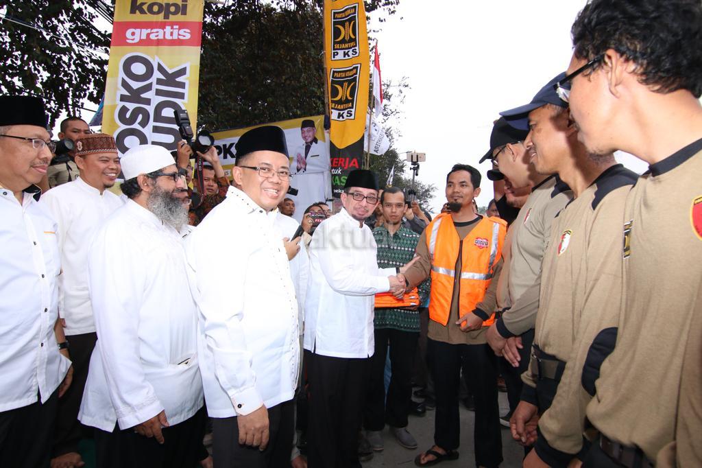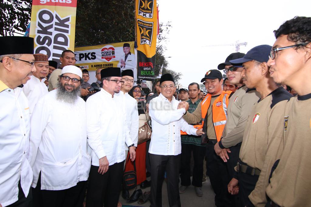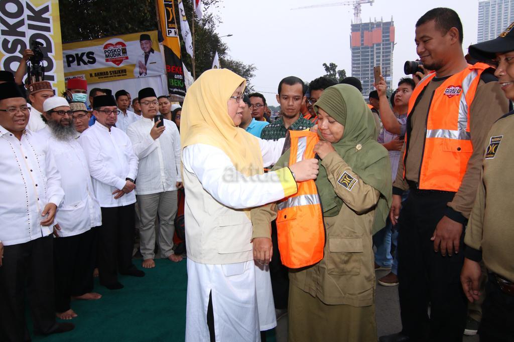 Simbolisasi pemberian rompi lapangan kepada petugas Posko Mudik PKS oleh Presiden PKS M. Sohibul Iman, Ketua Majelis Syuro Salim Segaf Al Jufri, Kabid Humas DPP PKS Ledia Hanifah, Bendum DPP PKS Mahfudz Abdurrahman dan Ketua DPW PKS JakBar Ahmad Syaikhu pada acara Launching Posko Mudik PKS, di Jalan Inspeksi Kalimalang, Bekasi, Jawa Barat, Kamis (22/6). AKTUAL/HO