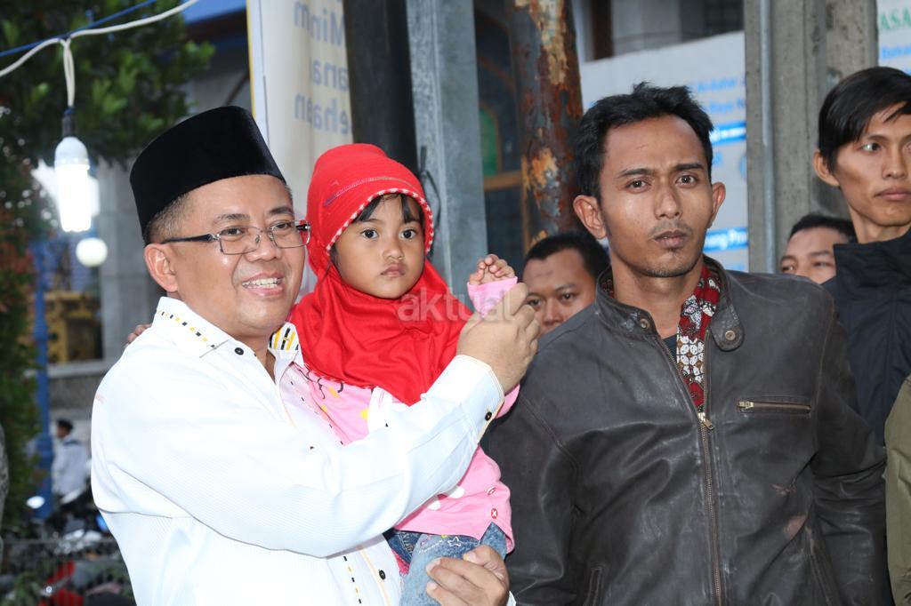 M. Sohibul Iman tengah menggendong seorang anak pemudik yang singgah di Posko Mudik PKS , di Jalan Inspeksi Kalimalang, Bekasi, Jawa Barat, Kamis (22/6). AKTUAL/HO