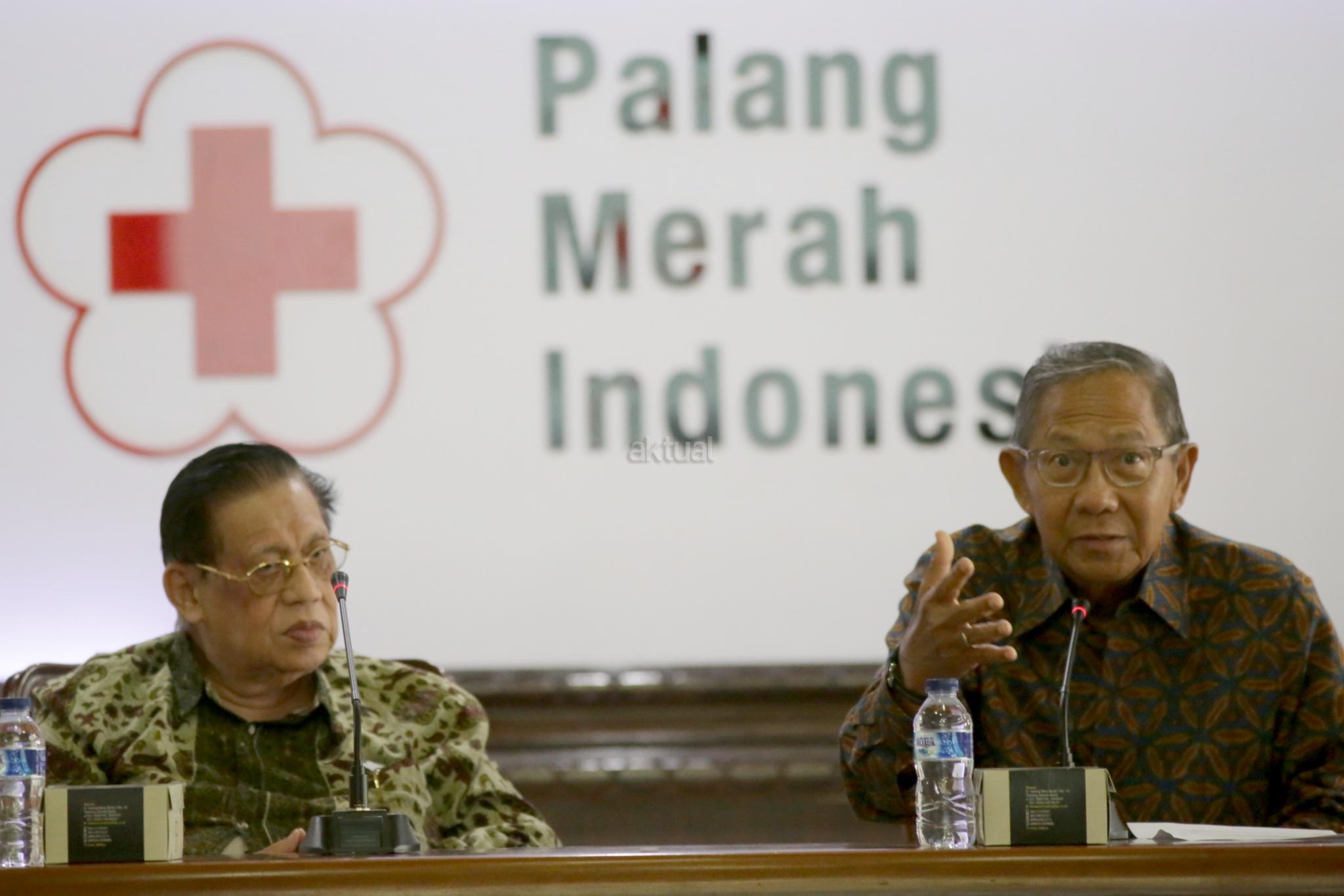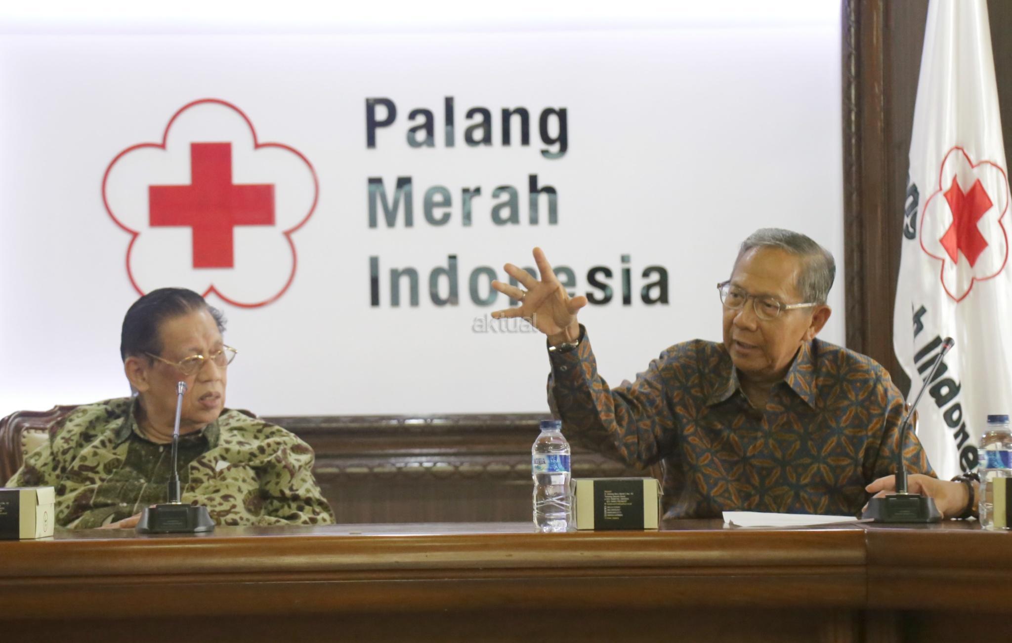 Pelaksana Harian Ketua Umum PMI Ginandjar Kartasasmita (kanan) dan Direktur Busana Group Slamet Nugroho (kiri) memberikan paparannya saat acara penyerahan donasi untuk korban gempa bumi dan tsunami Palu di Jakarta, Kamis (22/11/2018). Busana Apparel Group menyerahkan donasi sebesar Rp1,5 Milyar untuk korban bencana gempa bumi dan tsunami di Palu kepada PMI. AKTUAL/Tino Oktaviano