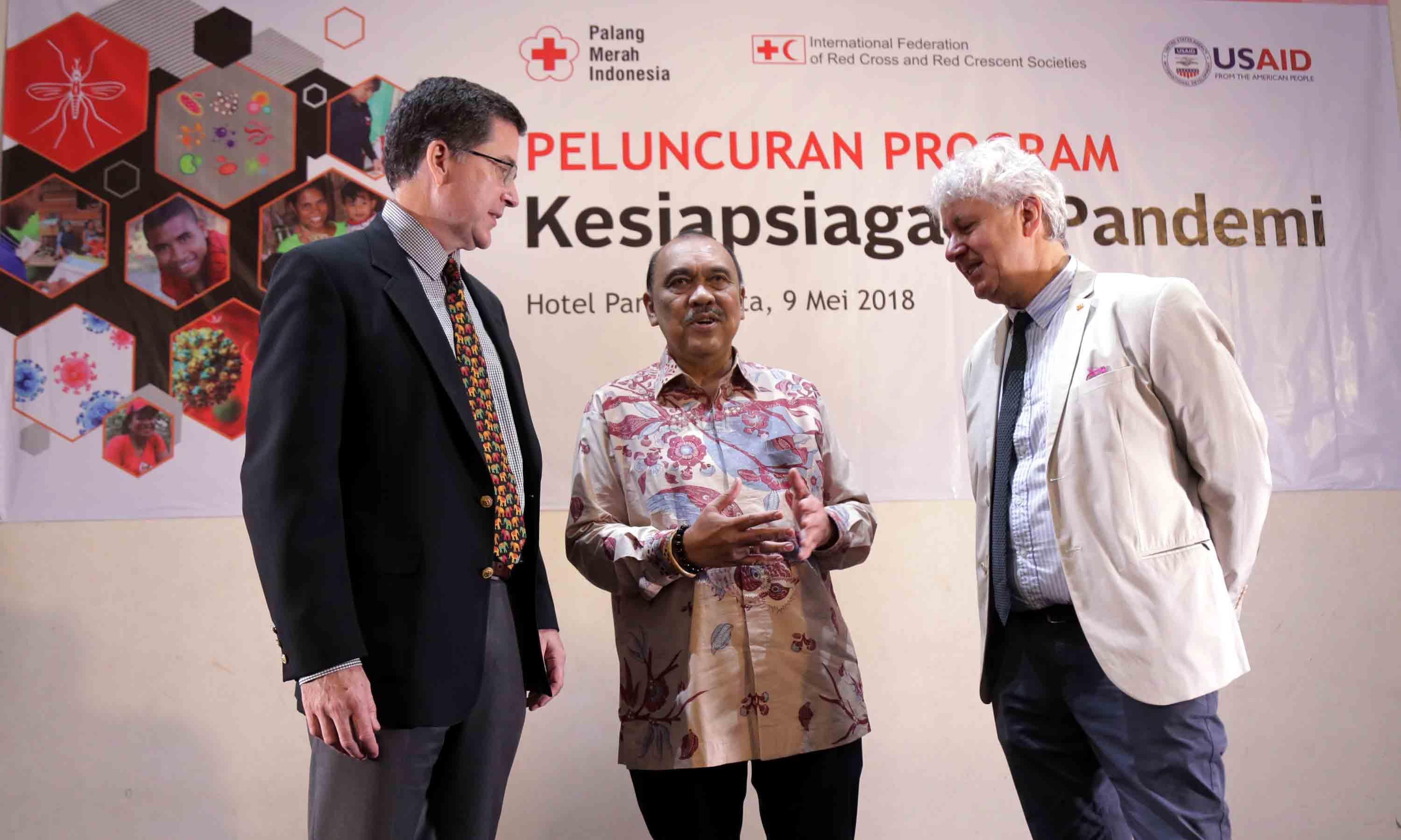 Sekjen Palang Merah Indonesia (PMI) Ritola Tasmaya (tengah), Director of USAID's Health Attache Jonathan Ross (kiri) dan Head of Country Cluster Support Team and Representative to ASEAN at IFRC Giargio Ferrario (kanan) berbincang usai membukan acara Peluncuran Program kesiapan Pandemi di Jakarta, Rabu (9/5/18). Indonesia merupakan salah satu negara dengan penyakit berpotensi KLB dan Wabah/Epidemi. Sejak tahun 2003 hingga saat ini, World Health Organization (WHO) mencatat kasus flu burung (A H5N1) sebanyak 859 kasus konfirmasi dengan 453 kematian yang tersebar di beberapa negara di antaranya adalah Azerbaijan, Bangladesh, China, Djibouti, Indonesia, India, Iraq, Kamboja, Nigeria, Pakistan, Thailand, Turki, Vietnam, Laos dan Myanmar. AKTUAL/Tino Oktaviano
