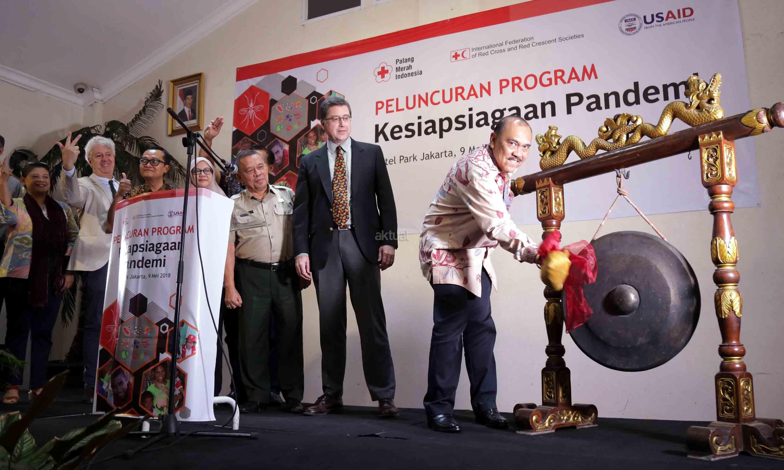 Sekjen Palang Merah Indonesia (PMI) Ritola Tasmaya (kanan), memukul gong didampingi Director of USAID’s Health Attache Jonathan Ross dan Head of Country Cluster Support Team and Representative to ASEAN at IFRC Giargio Ferrario saat membuka acara Peluncuran Program kesiapan Pandemi di Jakarta, Rabu (9/5/18). Indonesia merupakan salah satu negara dengan penyakit berpotensi KLB dan Wabah/Epidemi. Sejak tahun 2003 hingga saat ini, World Health Organization (WHO) mencatat kasus flu burung (A H5N1) sebanyak 859 kasus konfirmasi dengan 453 kematian yang tersebar di beberapa negara di antaranya adalah Azerbaijan, Bangladesh, China, Djibouti, Indonesia, India, Iraq, Kamboja, Nigeria, Pakistan, Thailand, Turki, Vietnam, Laos dan Myanmar.AKTUAL/Tino Oktaviano