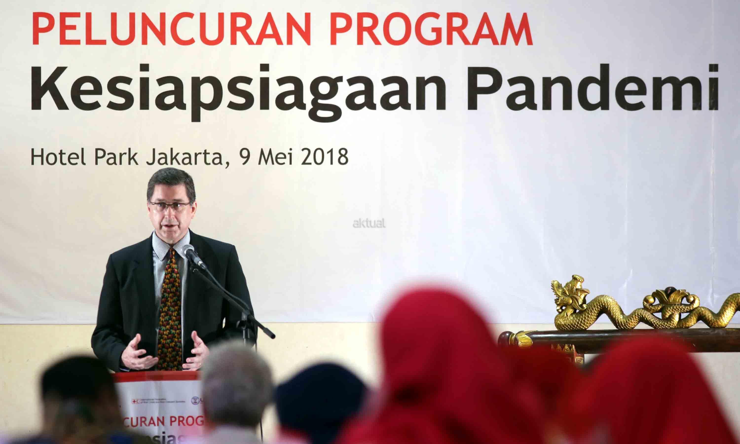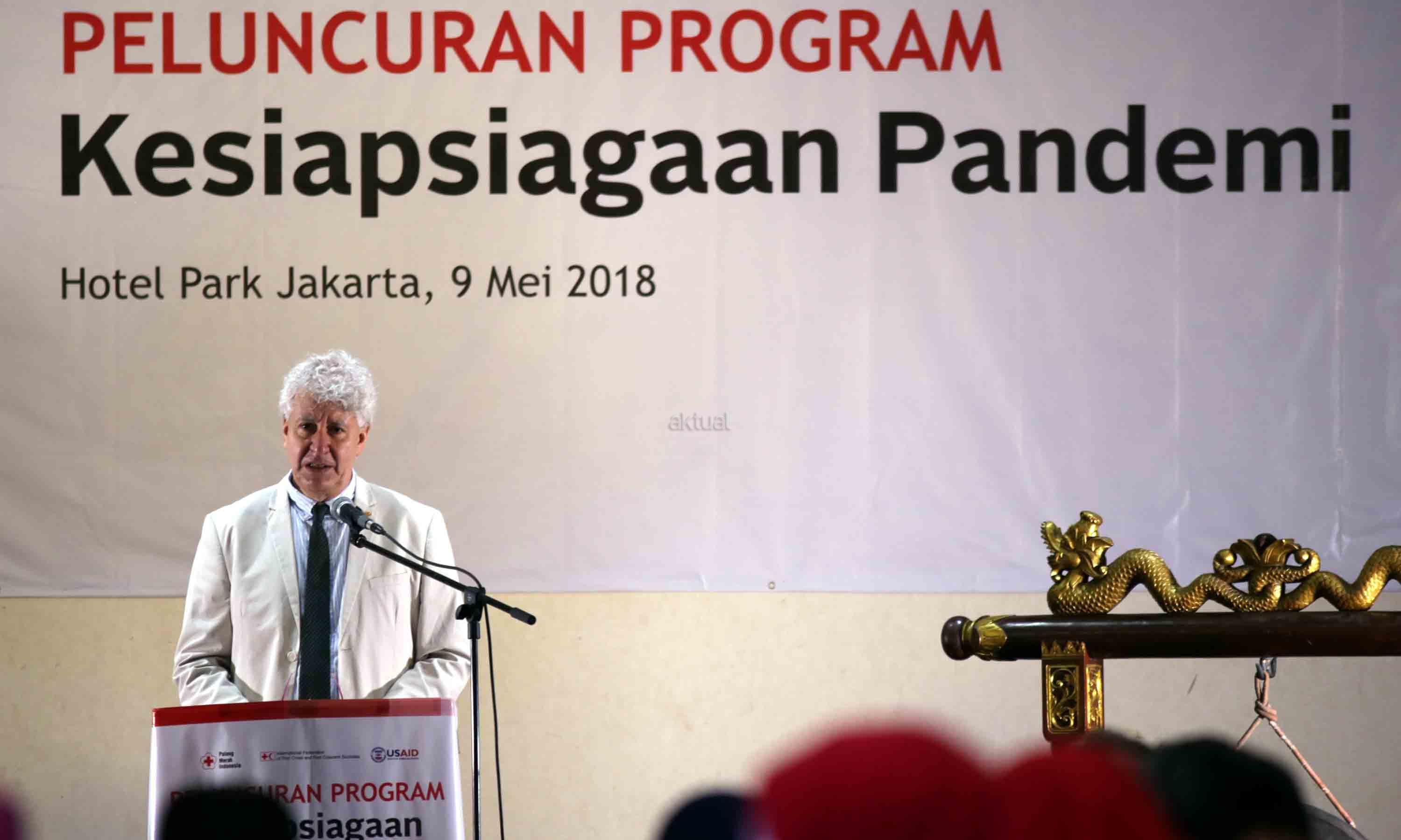 Head of Country Cluster Support Team and Representative to ASEAN at IFRC Giargio Ferrario memberikan sambutan saat acara Peluncuran Program kesiapan Pandemi di Jakarta, Rabu (9/5/18). Indonesia merupakan salah satu negara dengan penyakit berpotensi KLB dan Wabah/Epidemi. Sejak tahun 2003 hingga saat ini, World Health Organization (WHO) mencatat kasus flu burung (A H5N1) sebanyak 859 kasus konfirmasi dengan 453 kematian yang tersebar di beberapa negara di antaranya adalah Azerbaijan, Bangladesh, China, Djibouti, Indonesia, India, Iraq, Kamboja, Nigeria, Pakistan, Thailand, Turki, Vietnam, Laos dan Myanmar. AKTUAL/Tino Oktaviano