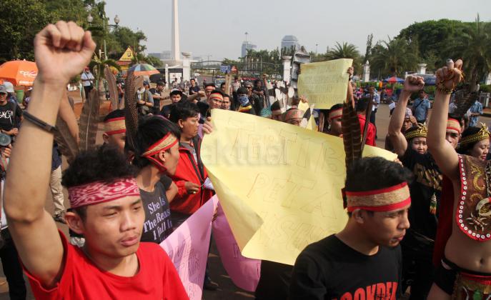 Ratusan mahasiswa yang tergabung dalam Perhimpunan Mahasiswa Katolik Republik Indonesia (PMKRI) melakukan aksi didepan Istana Negara, Jakarta, Selasa (20/10/2015). Dalam aksinya PMKRI melihat belum genap satu tahun pemerintahan Jokowi/JK hanya memberikan halayan palsu kepada rakyat Indonesia yang dimana kemiskinan, korupsi yang merajalela dan situasi sosial, ekonomi, politik dan lingkungan yang tidak menjadi lebih baik.