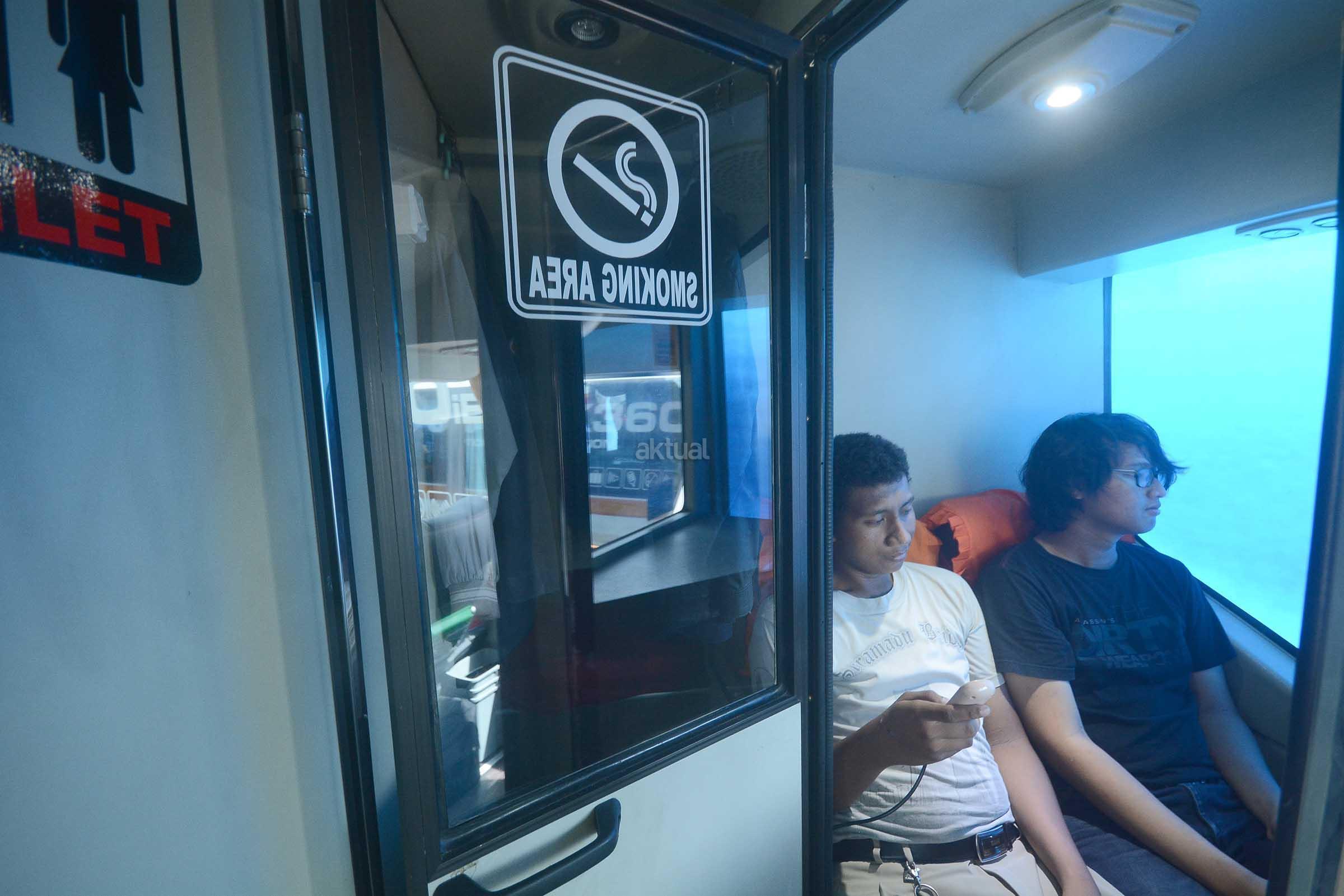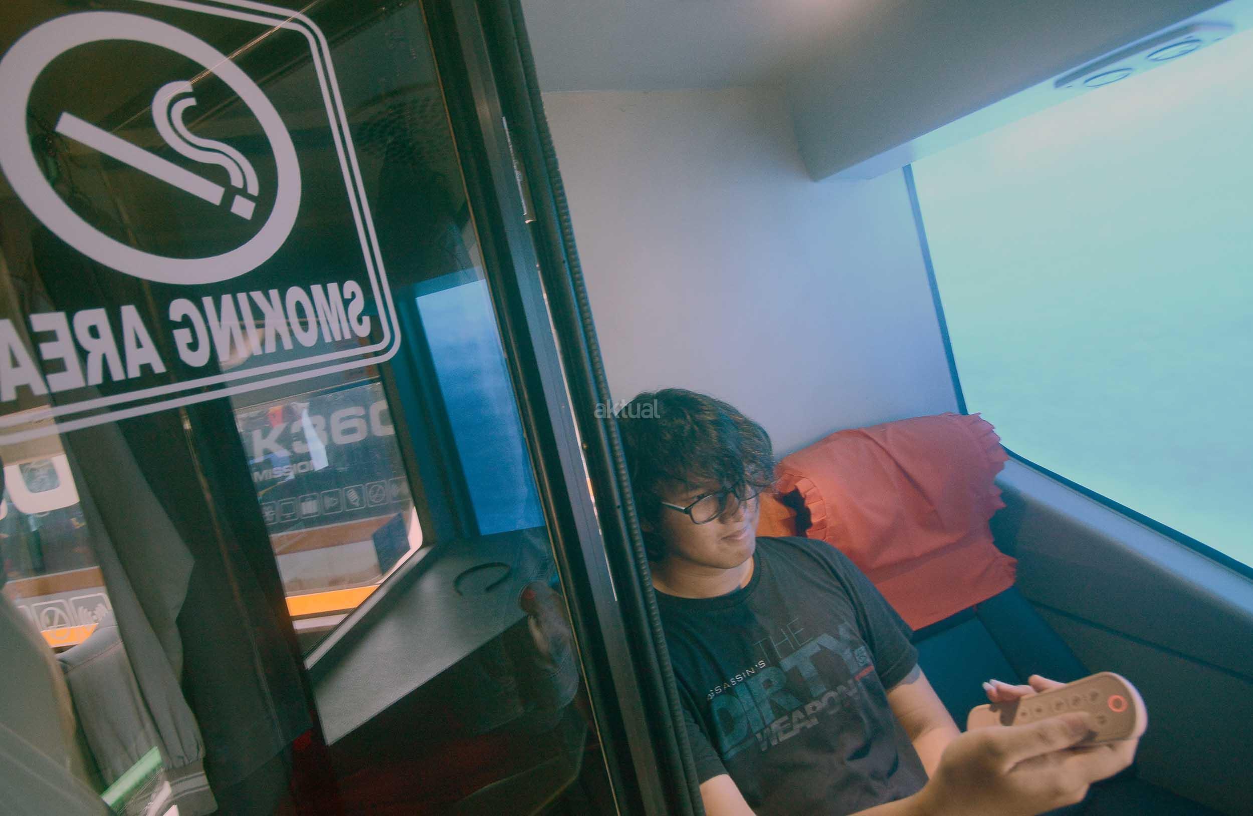 Penumpang bus saat menikmati fasilitas kursi pijat dan ruang merokok di ruang khusus diatas Bus Scania K3601B saat peluncuran armada baru untuk PO Harapan Jaya di Jakarta,Minggu (22/1).PO Harapan Jaya mengajak para pelanggan untuk melihat dan merasakan secara langsung keunggulan armada baru yang memiliki teknologi terkini dari segi kenyamanan dan keamanan. Bus Scania K360IB-4×2 opticruise transmission sebagai armada terbaru kelas super luxury dengan rute pengoperasian Jakarta-Jawa Tengah-Jawa Timur ini memiliki kapasitas mesin 13.000 cc dan 360 horse power (hp) dengan dilengkapi antara lain ruang untuk kursi refleksi, serta ekstra hot drink water, wifi ,toilet serta 1 ruangan smoking room. AKTUAL/Eko S Hilman