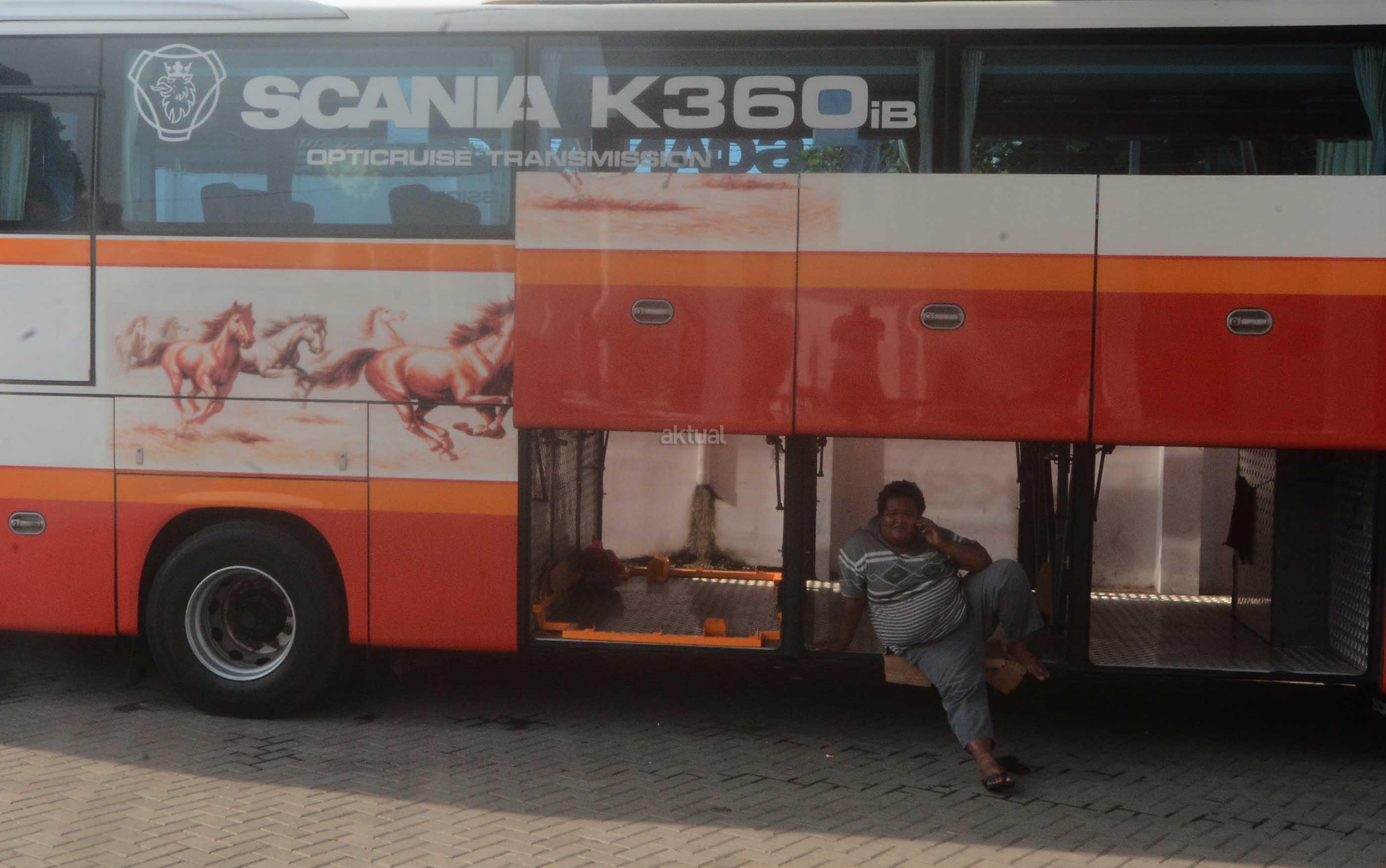 Awak Bus Scania K3601B beristirahat disela peluncuran armada baru untuk PO Harapan Jaya di Jakarta,Minggu (22/1).PO Harapan Jaya mengajak para pelanggan untuk melihat dan merasakan secara langsung keunggulan armada baru yang memiliki teknologi terkini dari segi kenyamanan dan keamanan. Bus Scania K360IB-4×2 opticruise transmission sebagai armada terbaru kelas super luxury dengan rute pengoperasian Jakarta-Jawa Tengah-Jawa Timur ini memiliki kapasitas mesin 13.000 cc dan 360 horse power (hp) dengan dilengkapi antara lain ruang untuk kursi refleksi, serta ekstra hot drink water, wifi ,toilet serta 1 ruangan smoking room. AKTUAL/Eko S Hilman