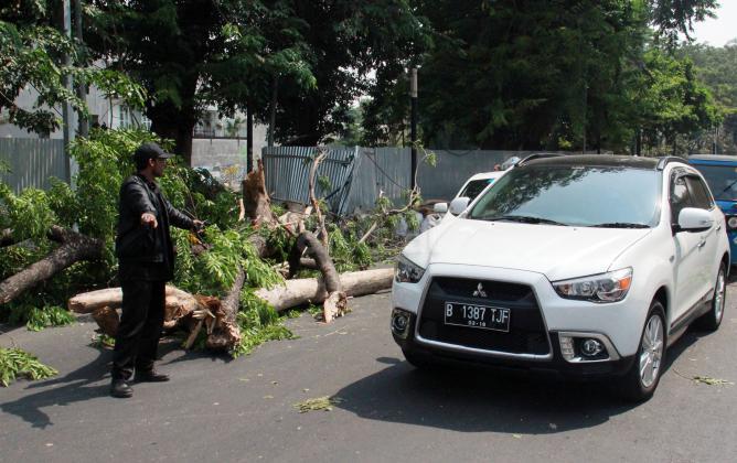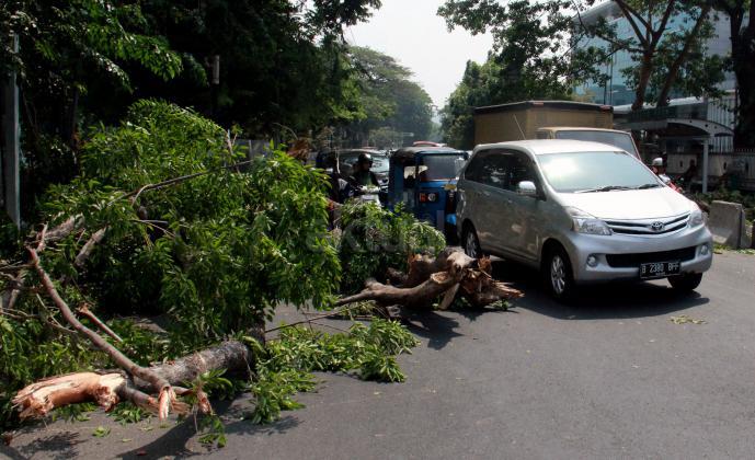 Sebuah pohon besar tumbang menutup jalan di depan Rumah Sakit Cipto Mangunkusumo (RSCM), Jakarta, Selasa (27/10/2015). Selain menyebabkan kemacetan panjang, pohon tumbang tersebut juga sempat menimpa sebuah bus metromini dan beberapa mobil.