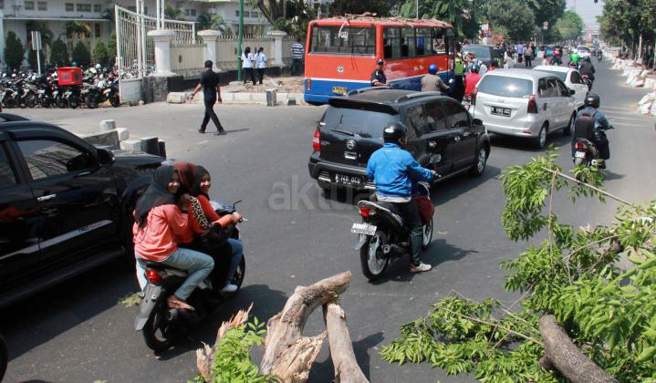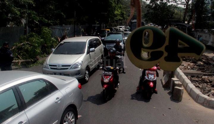 Pengendara bermotor melintas di samping pohon tumbang di depan RSCM, Jakarta Pusat, Selasa (27/10/2015). Pohon tumbang tersebut menimpa bus metromini dan mengganggu lalu lintas di jalan tersebut.