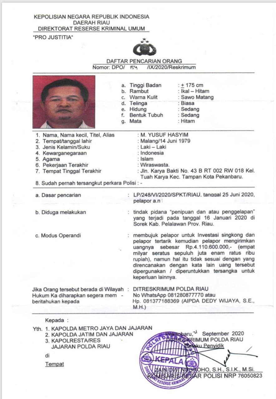 Pekanbaru, Aktual.com – Kepolisian Daerah Riau telah resmi menerbitkan Datar Pencarian Orang (DPO) terhadap Direktur Utama PT Sumatera Tani Mandiri, M Yusuf Hasyim tersangka penipuan dan penggelapan di Sorek, Pelalawan, Riau.
