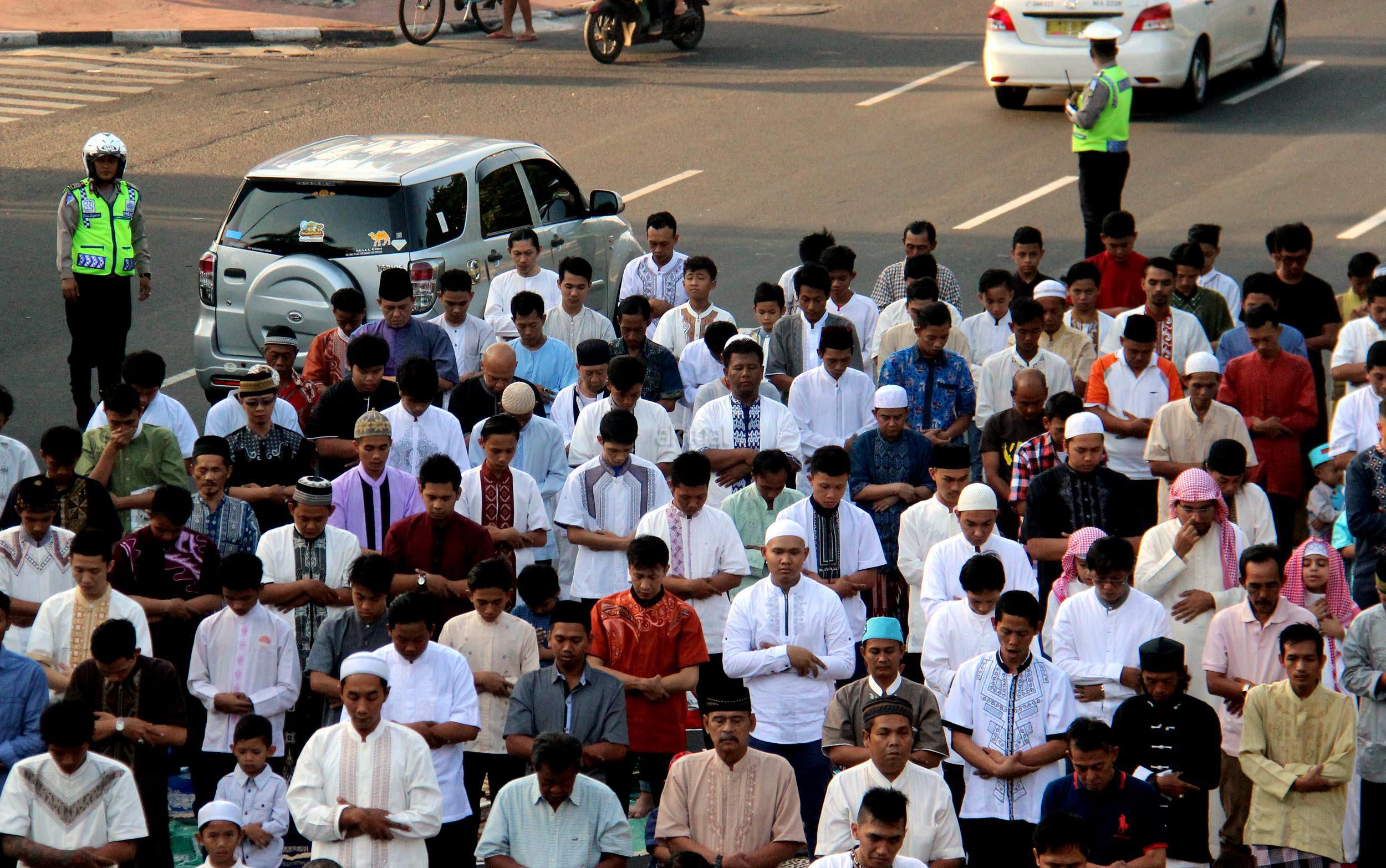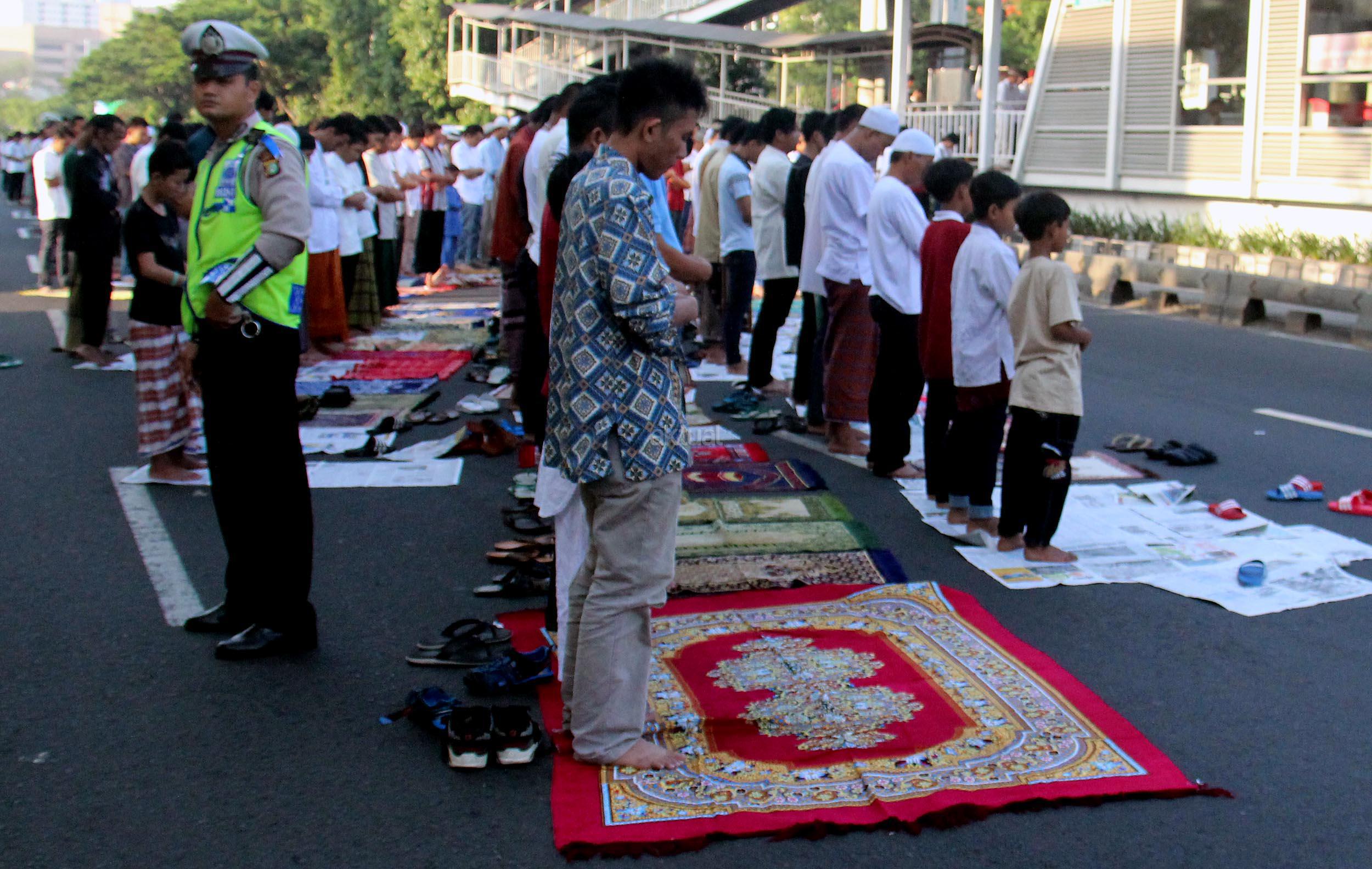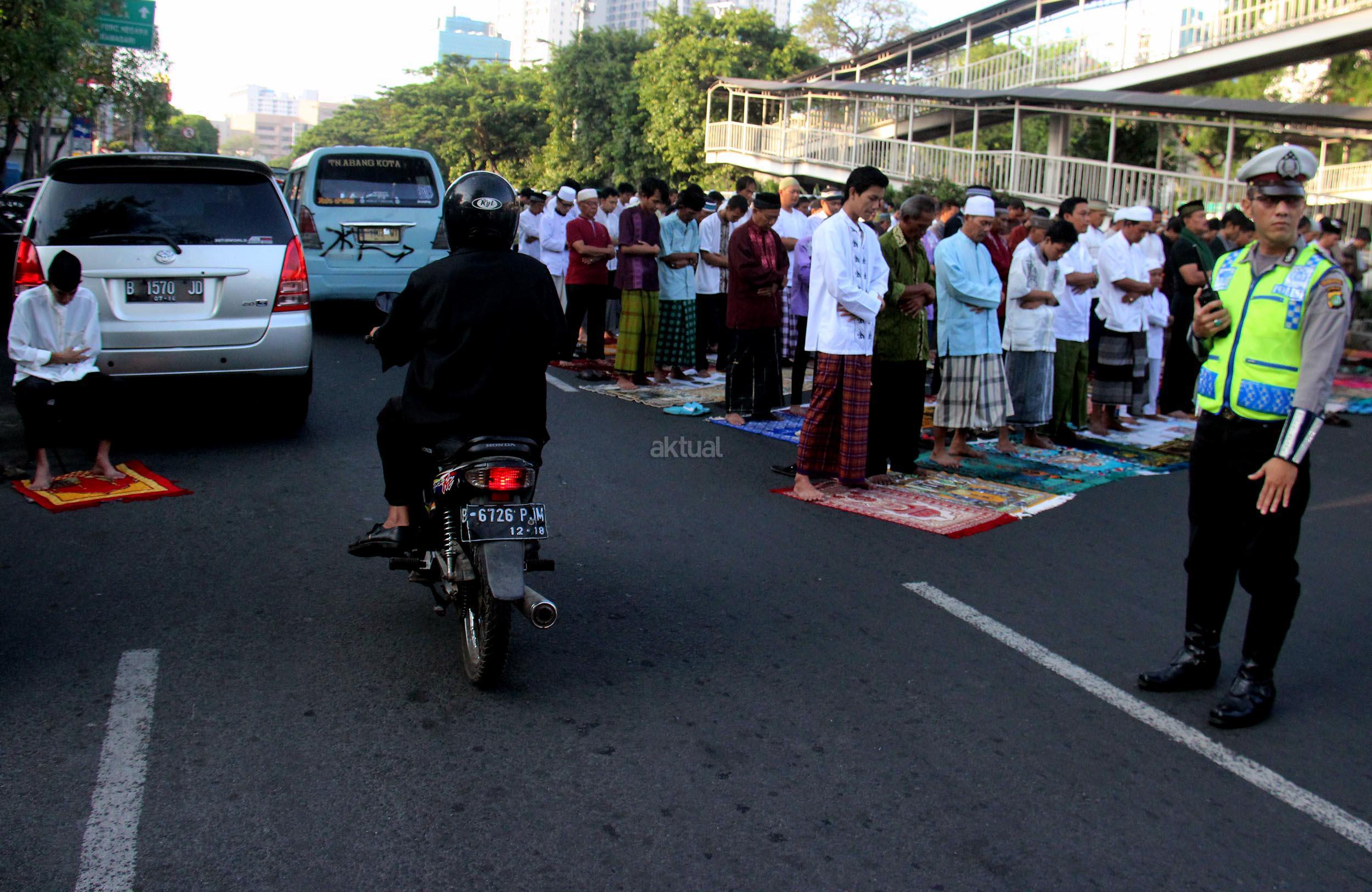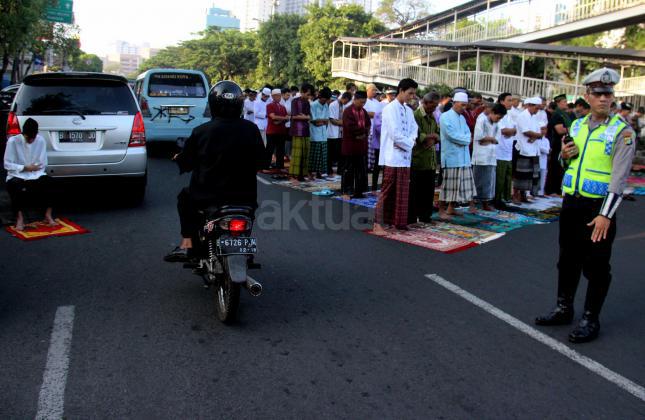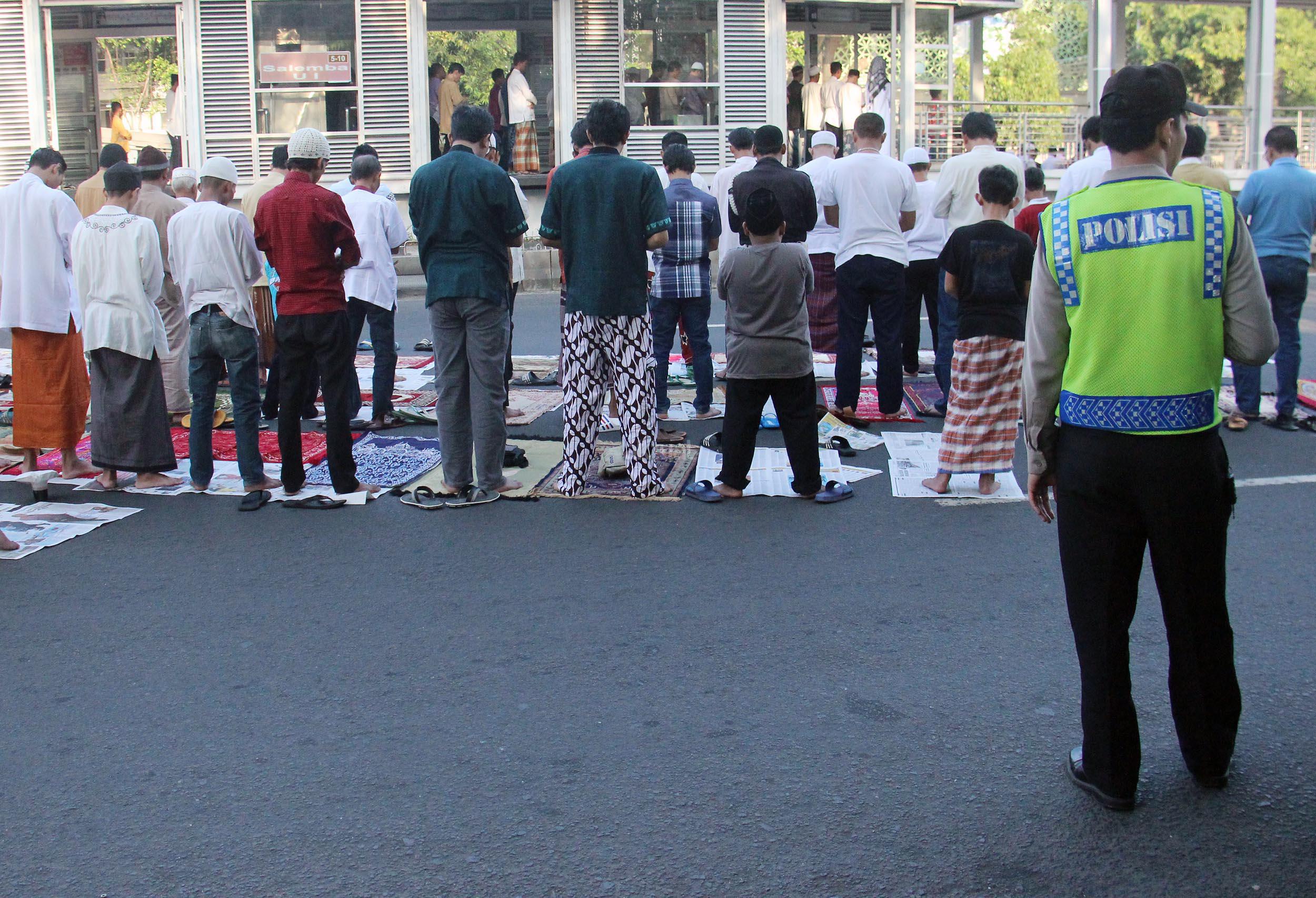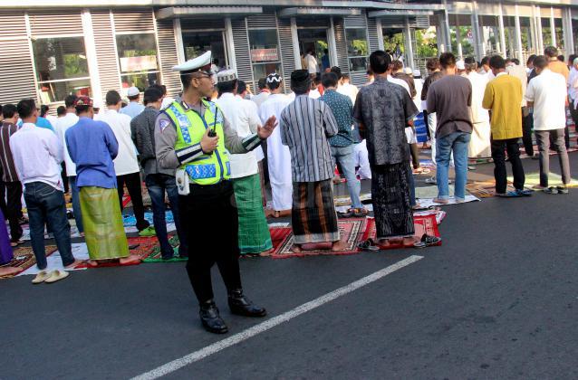 Anggota polisi mengatur lalulintas dan berjaga saat salat Idul Fitri 1436 H di Jalan Raya Salemba, Jakarta Pusat, Jumat (17/7/2015). Pengaman Hari Raya Idul Fitri sudah dimulai Polda Metro Jaya. Melalui Operasi Ketupat Jaya 2015, Polda Metro Jaya menerjukan 6.600 personil kepolisian.
