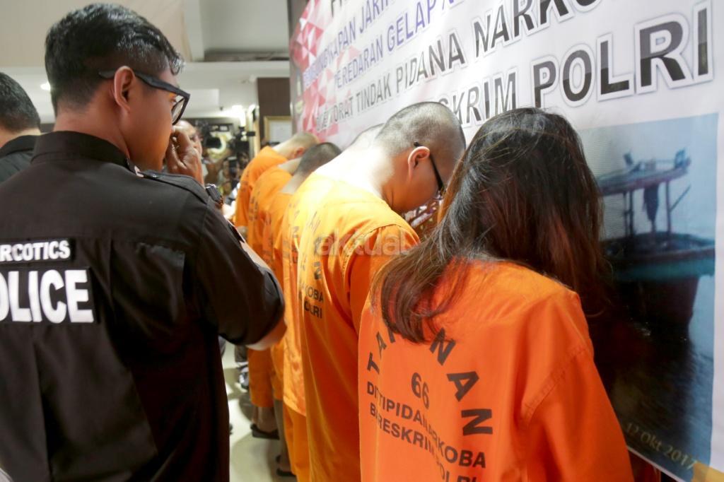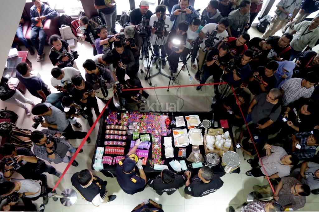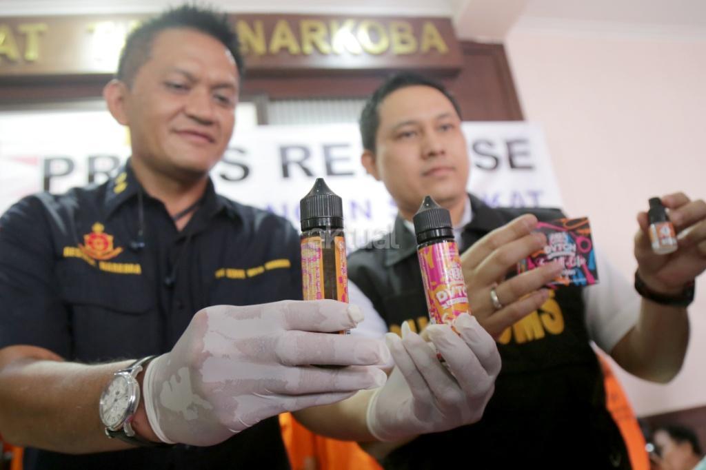 Polisi mengamankan puluhan liquid atau cairan untuk rokok elektronik (vape) yang didatangkan dari Belanda saat jumpa pers di Direktorat Narkoba Bareskrim Polri, Jakarta, Rabu (1/11/2017). Liquid bermerk Dvtch Amsterdam tersebut mengandung narkoba jenis canabinoid. Tersangka melanggar pasal 114 ayat (2) subsider pasal 113 ayat (2) subsider pasal 112 (2) UU RI Nomor 35 Tahun 2009 tentang Narkotika. AKTUAL/Tino Oktaviano