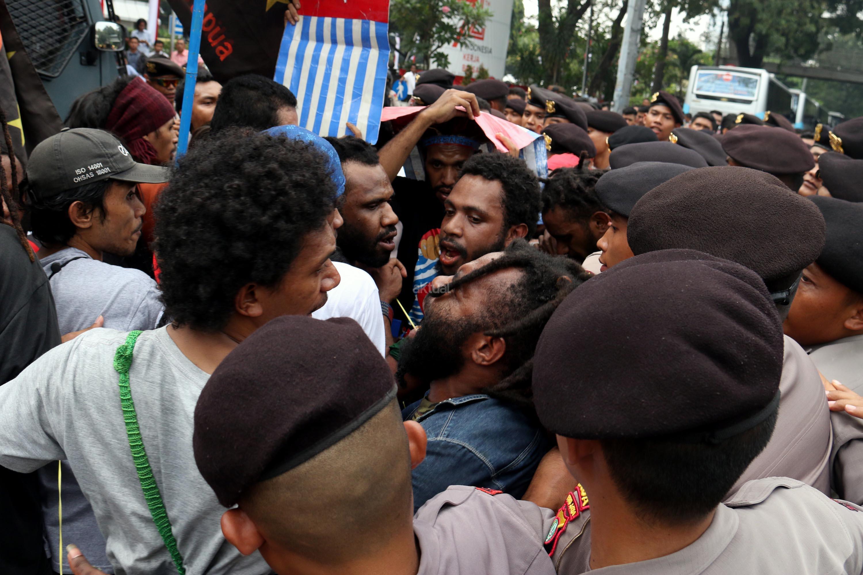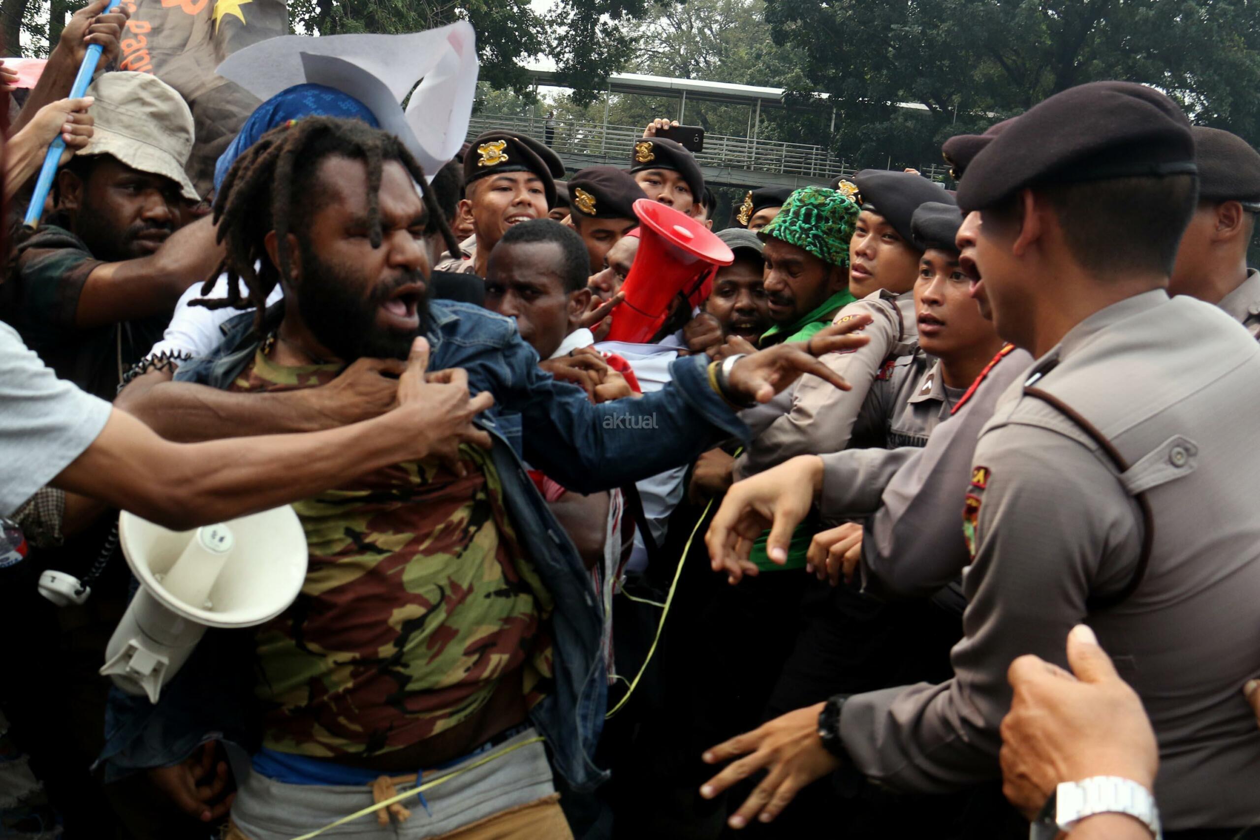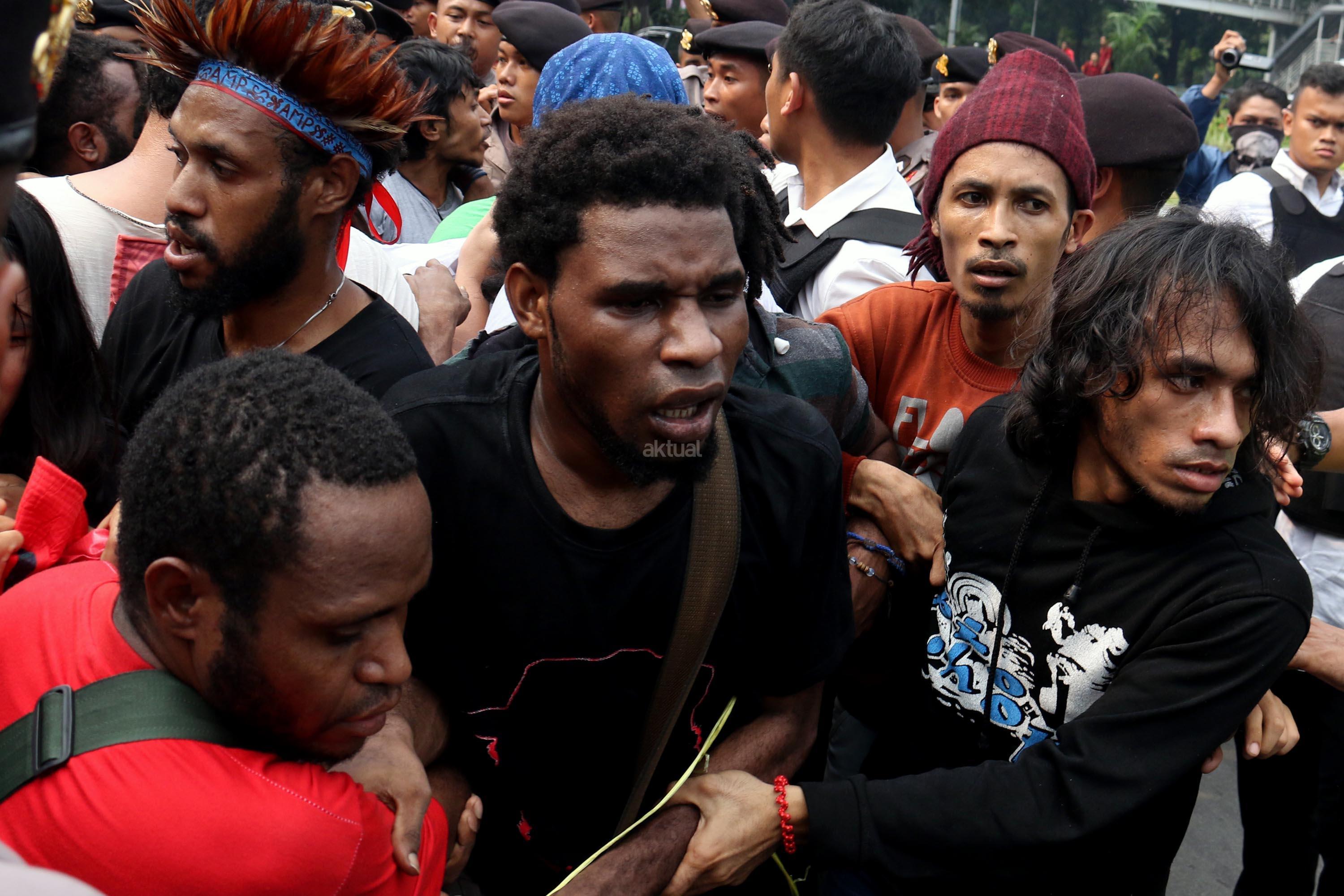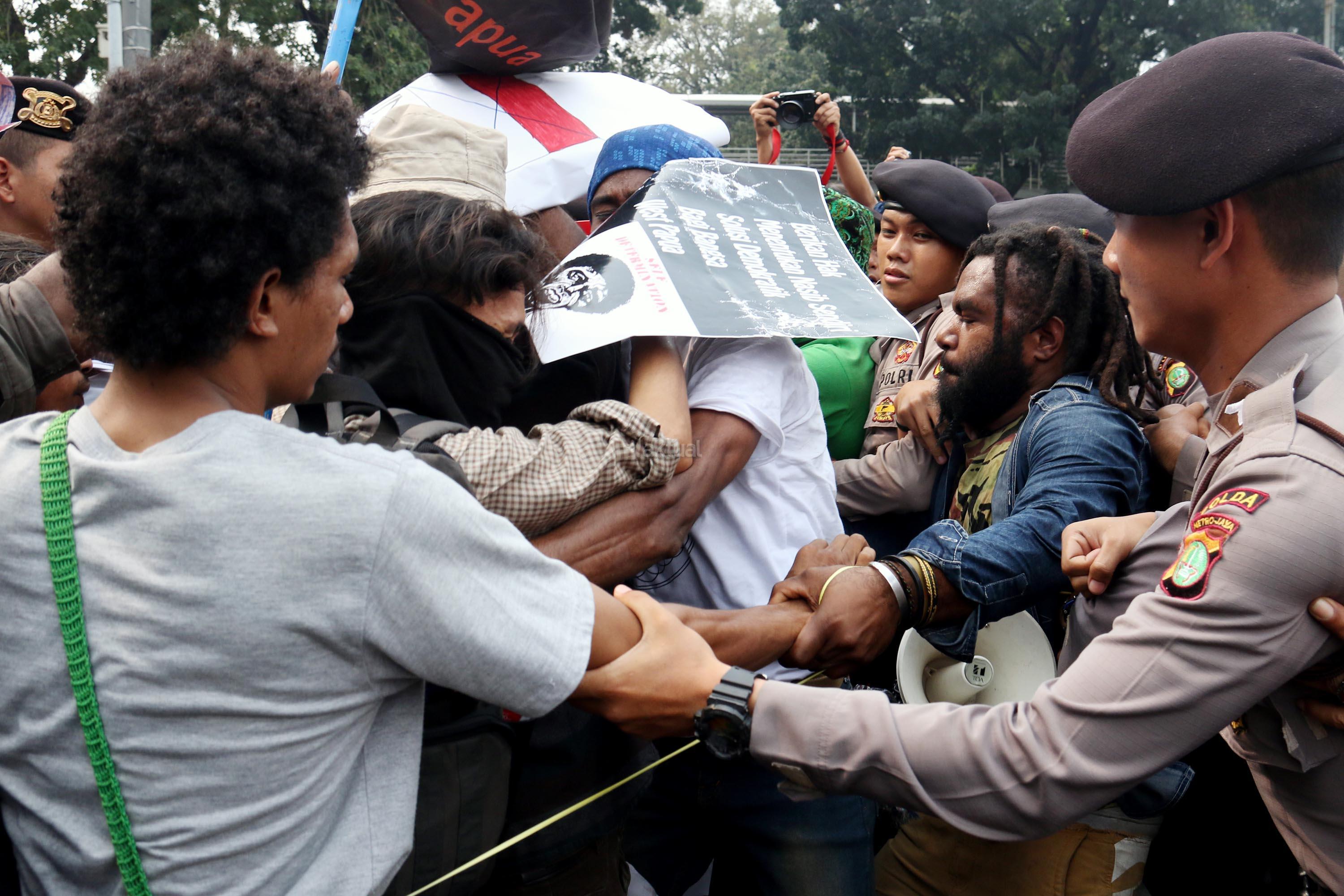 Ratusan anggota kepolisian membubarkan paksa aksi demontrasi mahasiswa Papua di ?Jl. Medan Merdeka Bara , Jakarta, Selasa (15/8/2017). Sebelumya para mahasiswa yang tergabung dalam Aliansi Mahasiswa Papua (AMP) ingin melakukan aksi unjuk rasa di depan Istana Merdeka, tapi tidak diperbolehkan oleh pihak Kepolisian. AKTUAL/Munzir