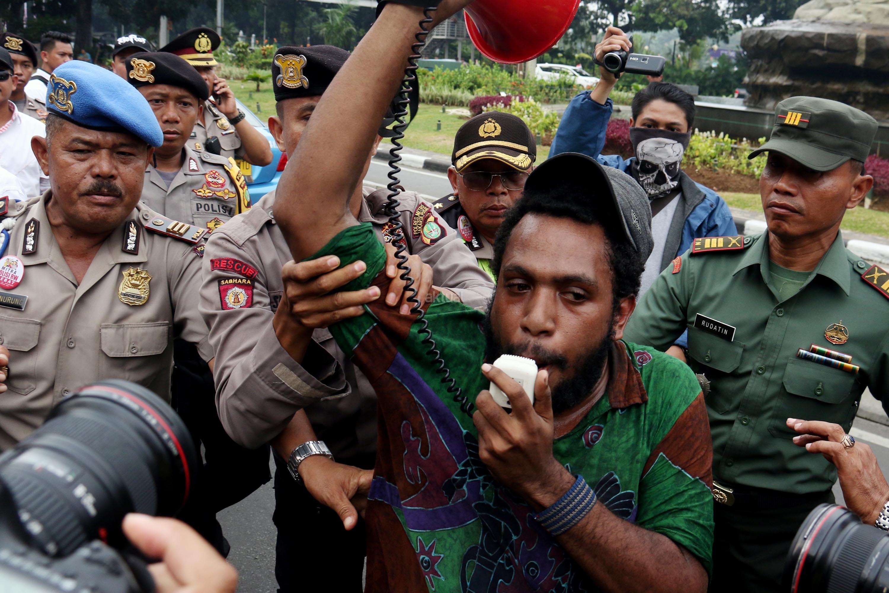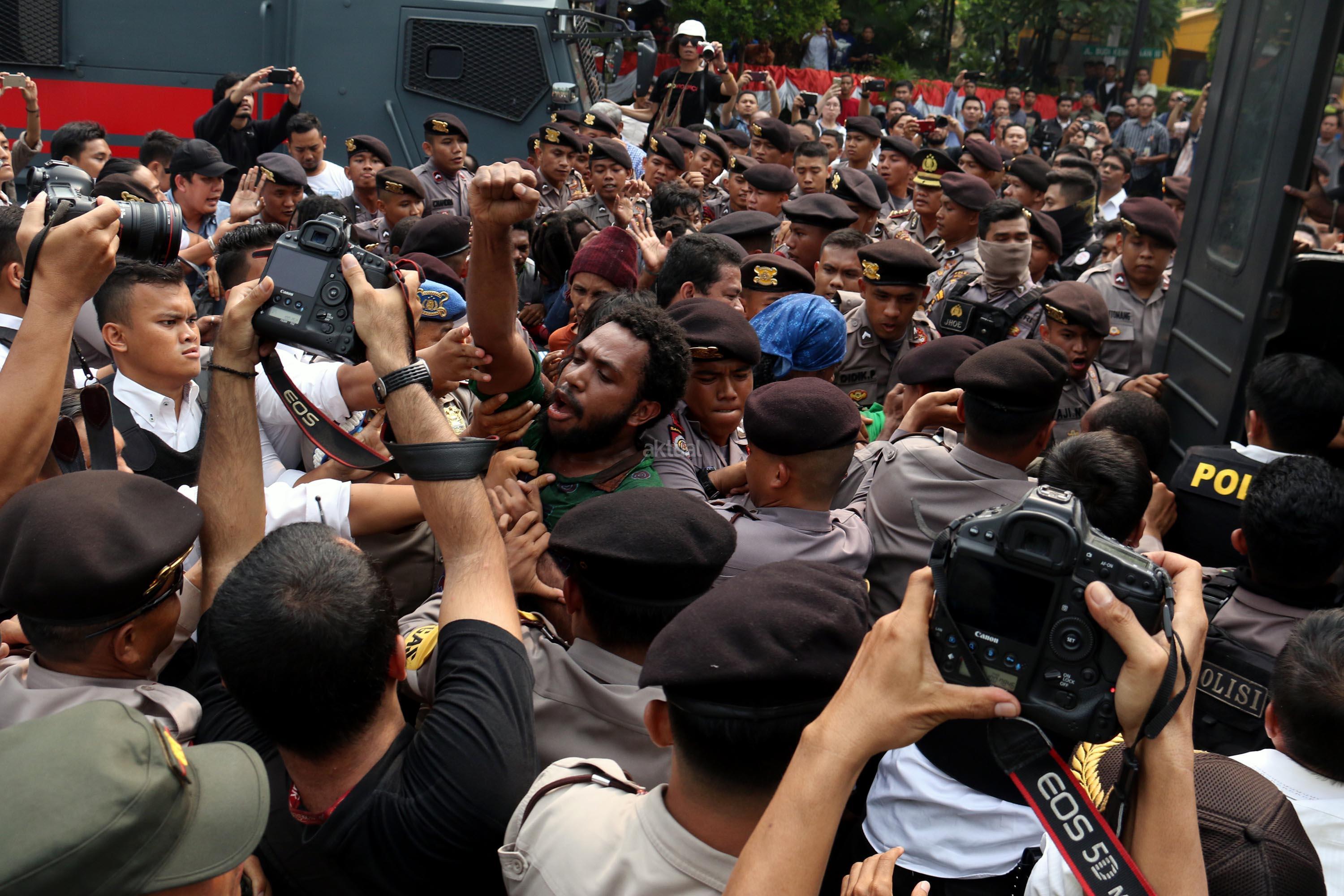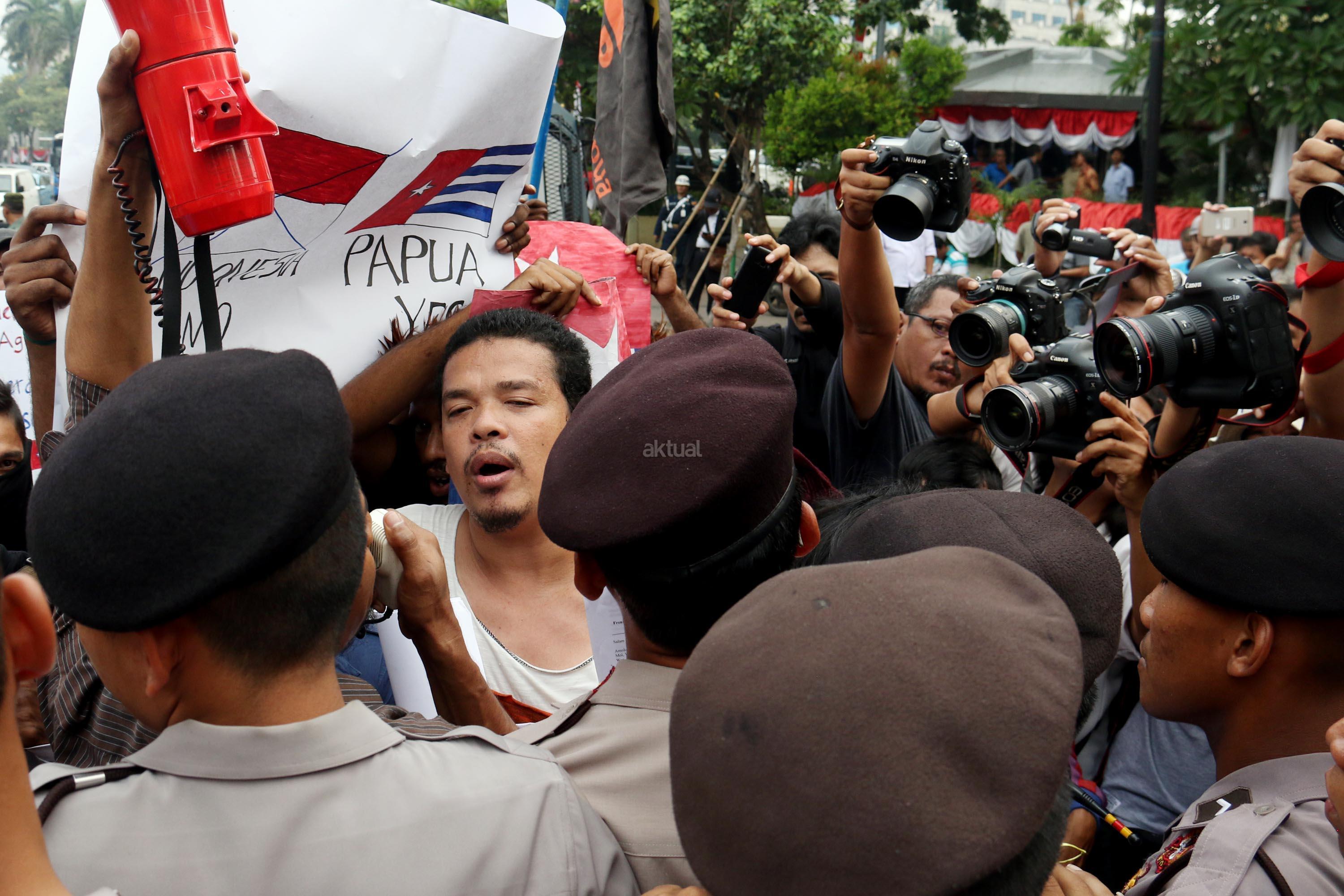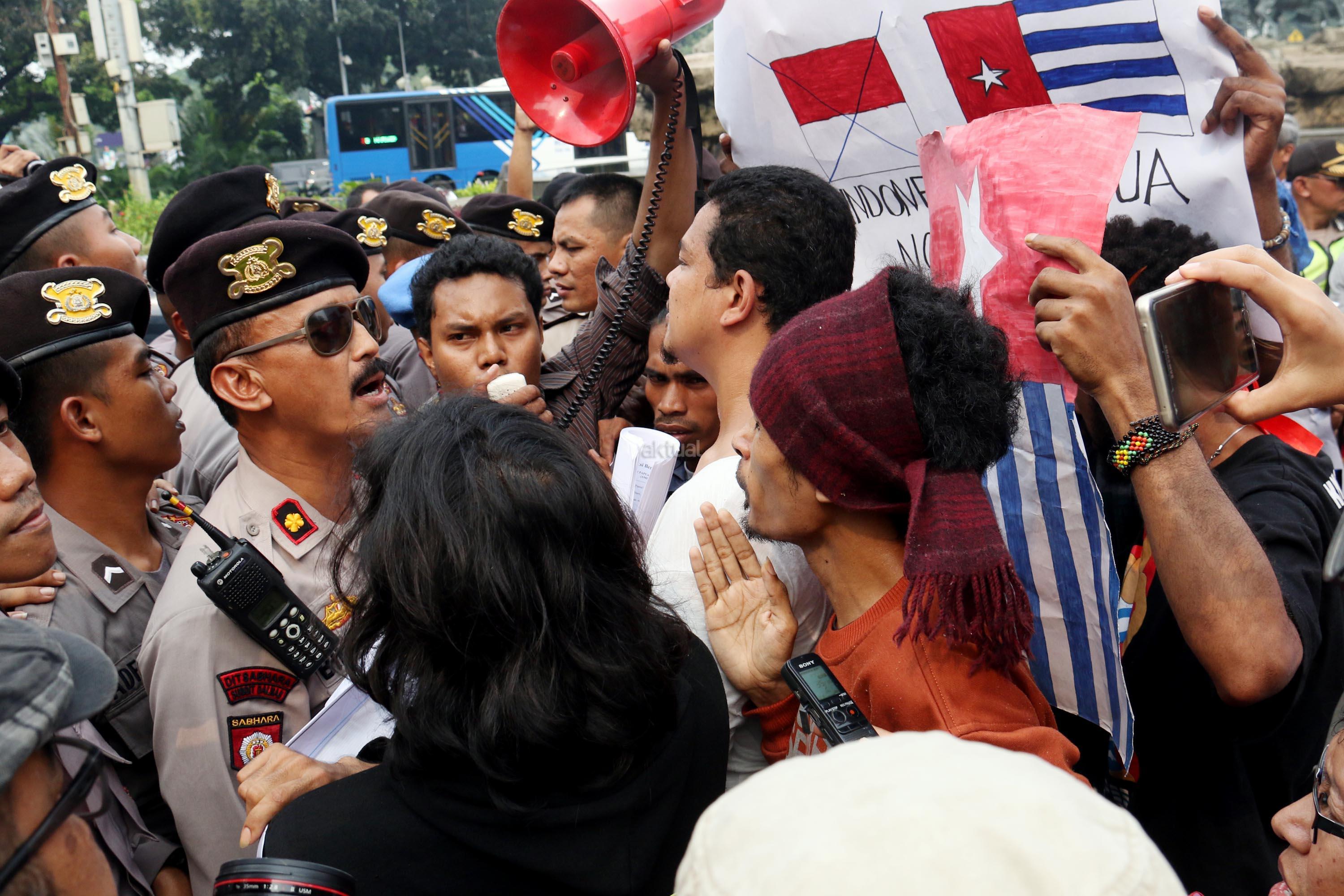 Ratusan anggota kepolisian membubarkan paksa aksi demontrasi mahasiswa Papua di ?Jl. Medan Merdeka Bara , Jakarta, Selasa (15/8/2017). Sebelumya para mahasiswa yang tergabung dalam Aliansi Mahasiswa Papua (AMP) ingin melakukan aksi unjuk rasa di depan Istana Merdeka, tapi tidak diperbolehkan oleh pihak Kepolisian. AKTUAL/Munzir