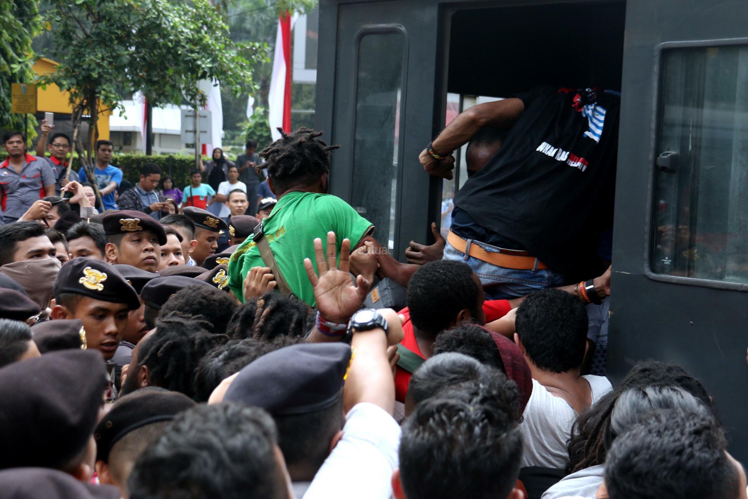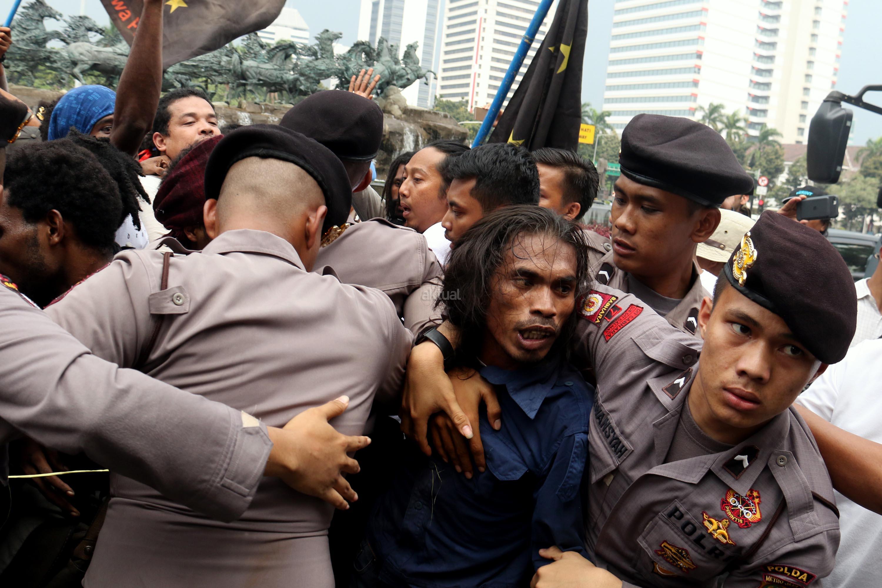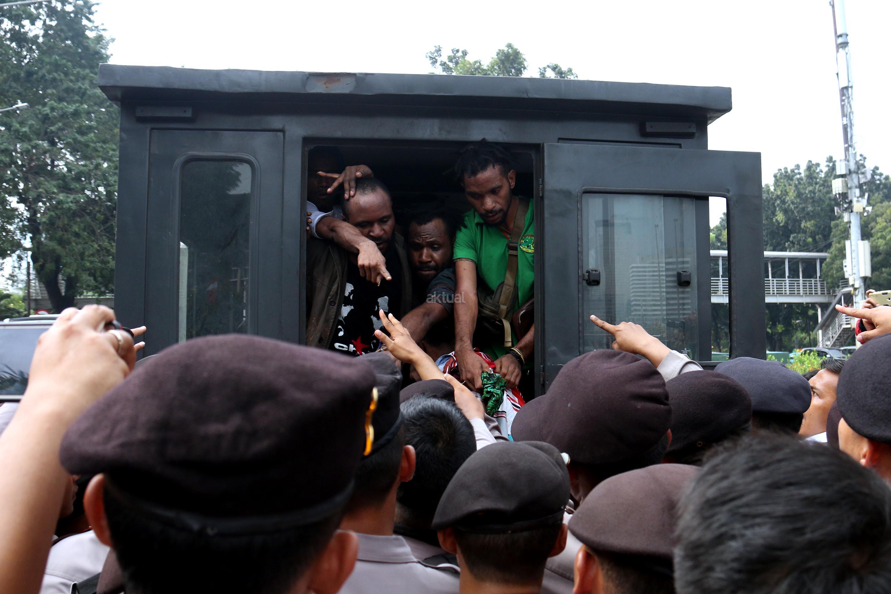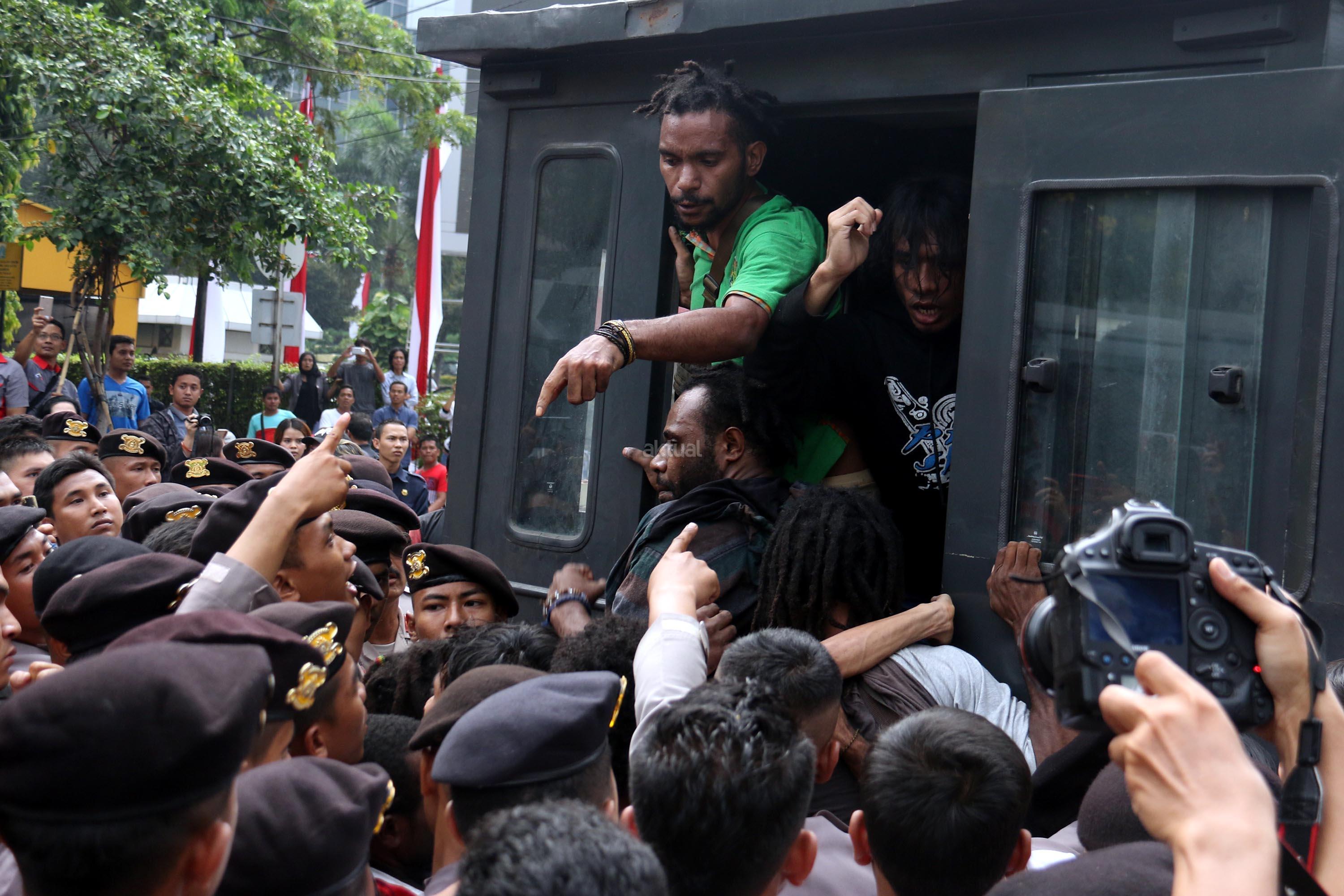Puluhan demontrans dipaksa masuk kedalam mobil tahanan kepolisian di ?Jl. Medan Merdeka Bara , Jakarta, Selasa (15/8/2017). Sebelumya para mahasiswa yang tergabung dalam Aliansi Mahasiswa Papua (AMP) ingin melakukan aksi unjuk rasa di depan Istana Merdeka, tapi tidak diperbolehkan oleh pihak Kepolisian. AKTUAL/Munzir