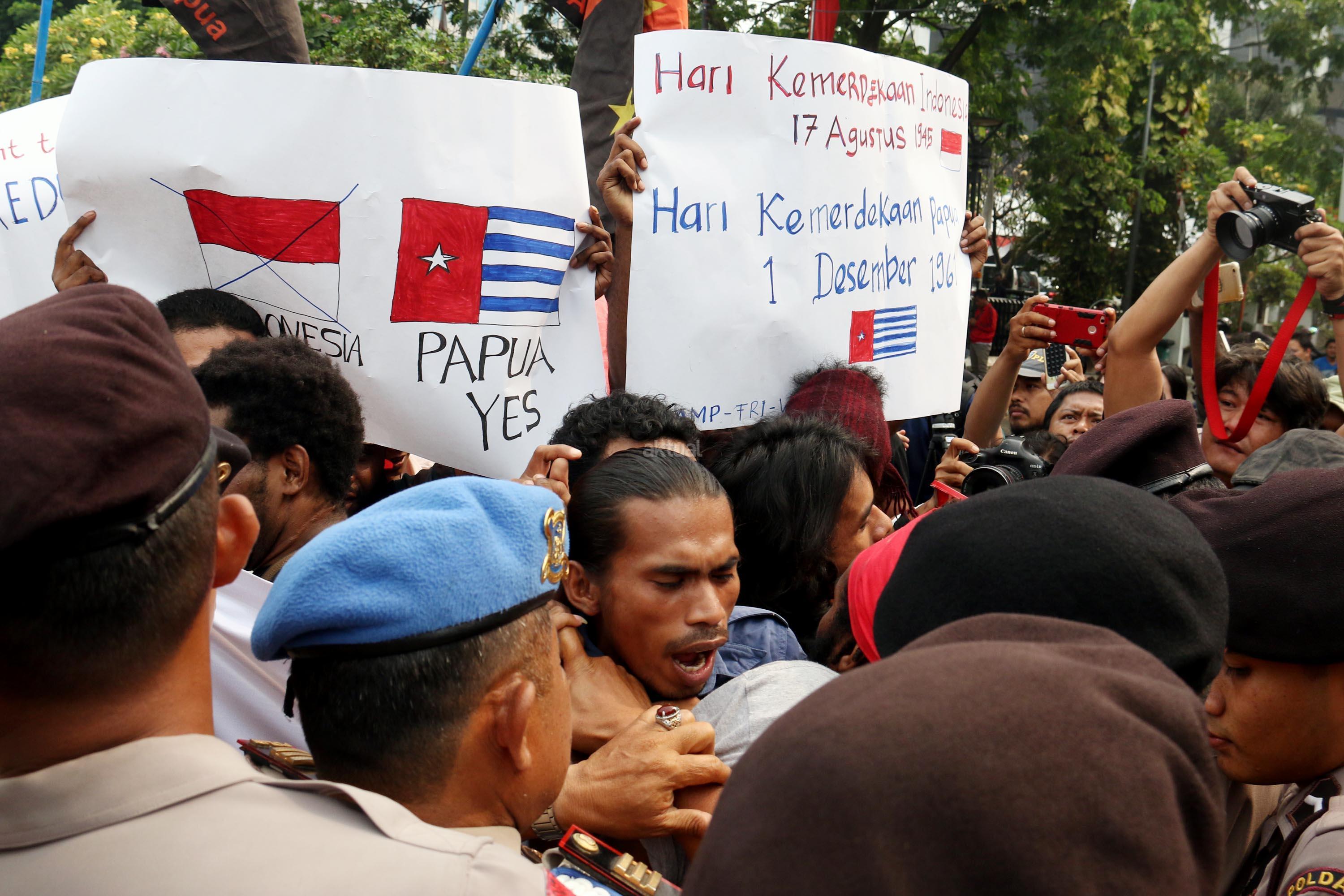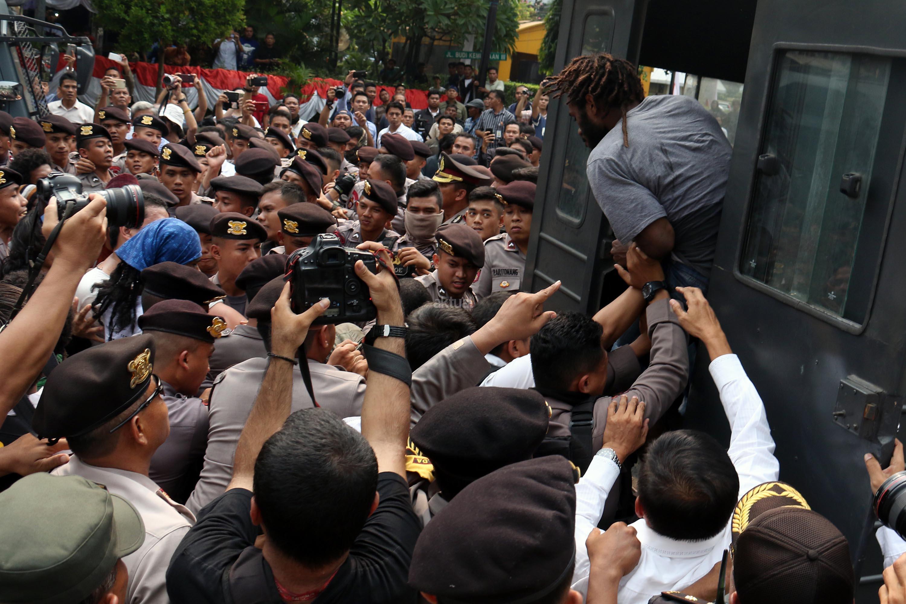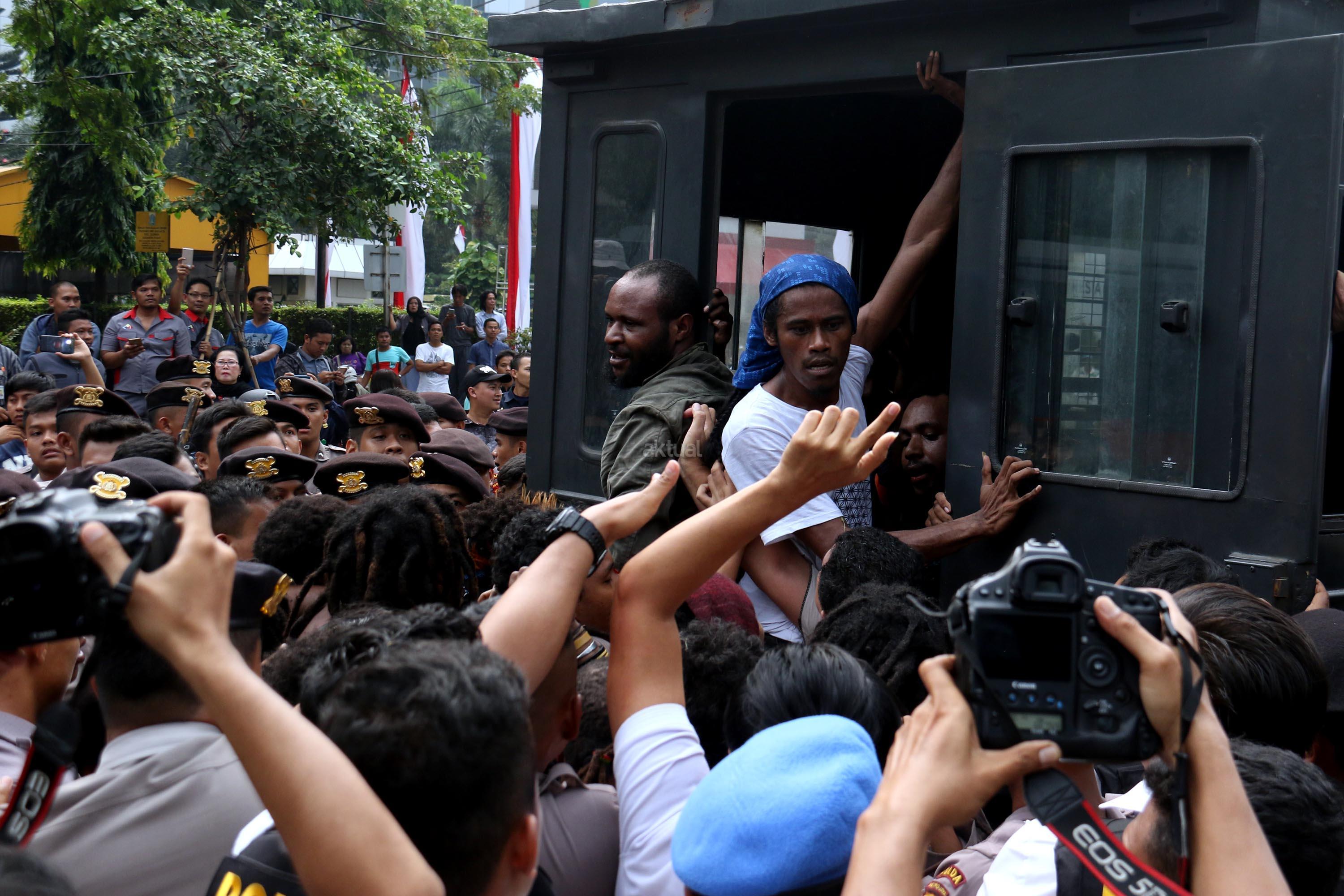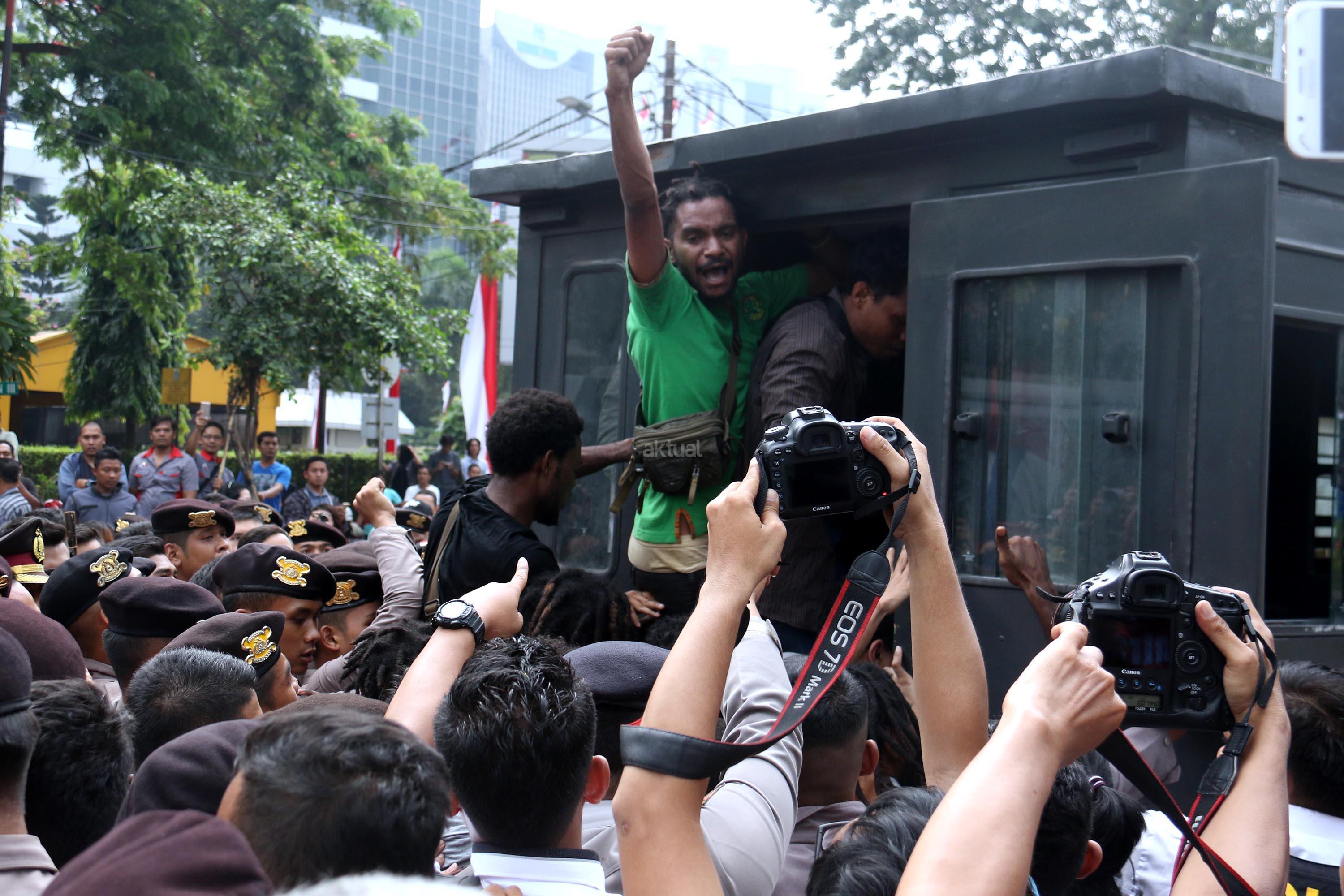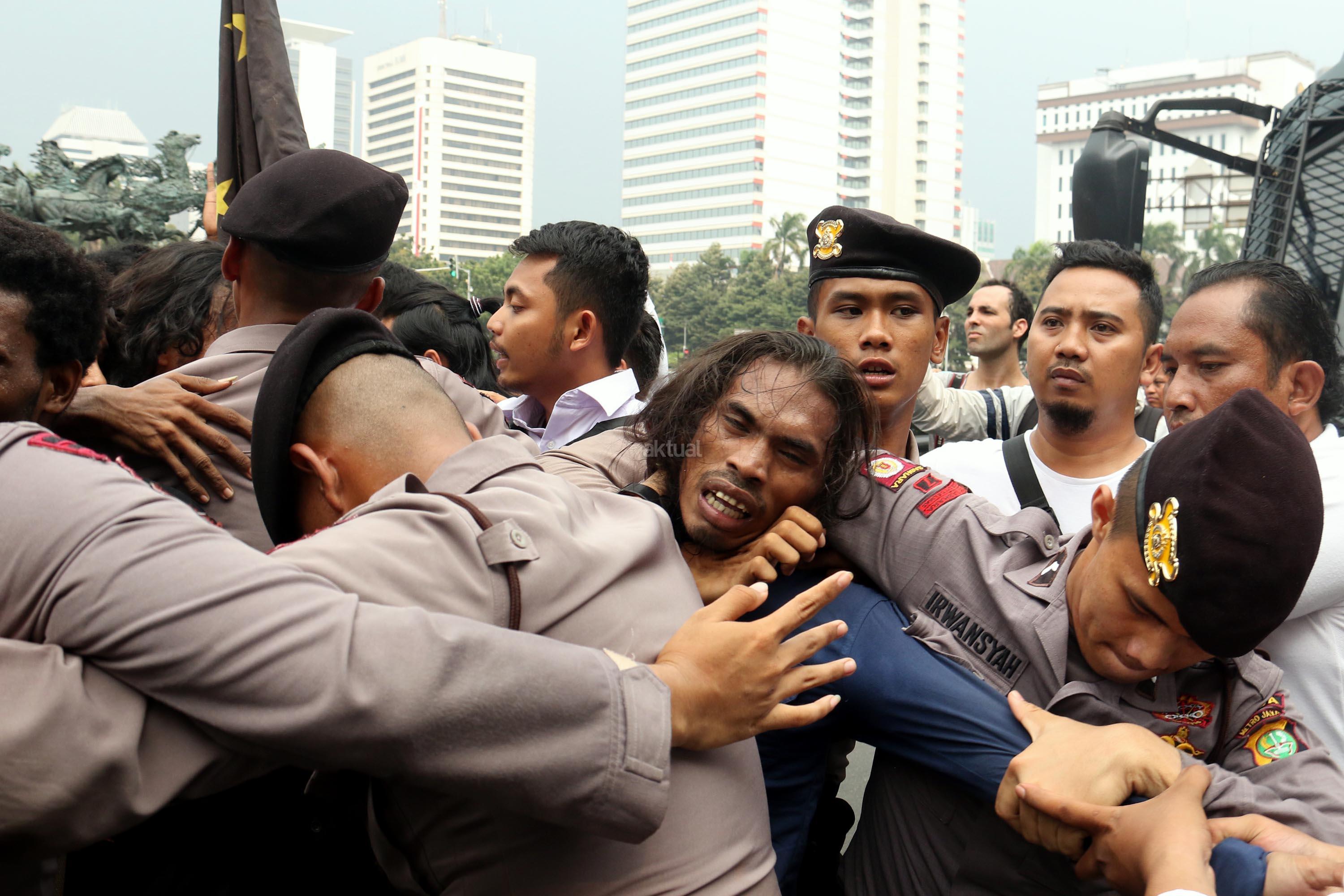 Puluhan demontrans dipaksa masuk kedalam mobil tahanan kepolisian di ?Jl. Medan Merdeka Bara , Jakarta, Selasa (15/8/2017). Sebelumya para mahasiswa yang tergabung dalam Aliansi Mahasiswa Papua (AMP) ingin melakukan aksi unjuk rasa di depan Istana Merdeka, tapi tidak diperbolehkan oleh pihak Kepolisian. AKTUAL/Munzir