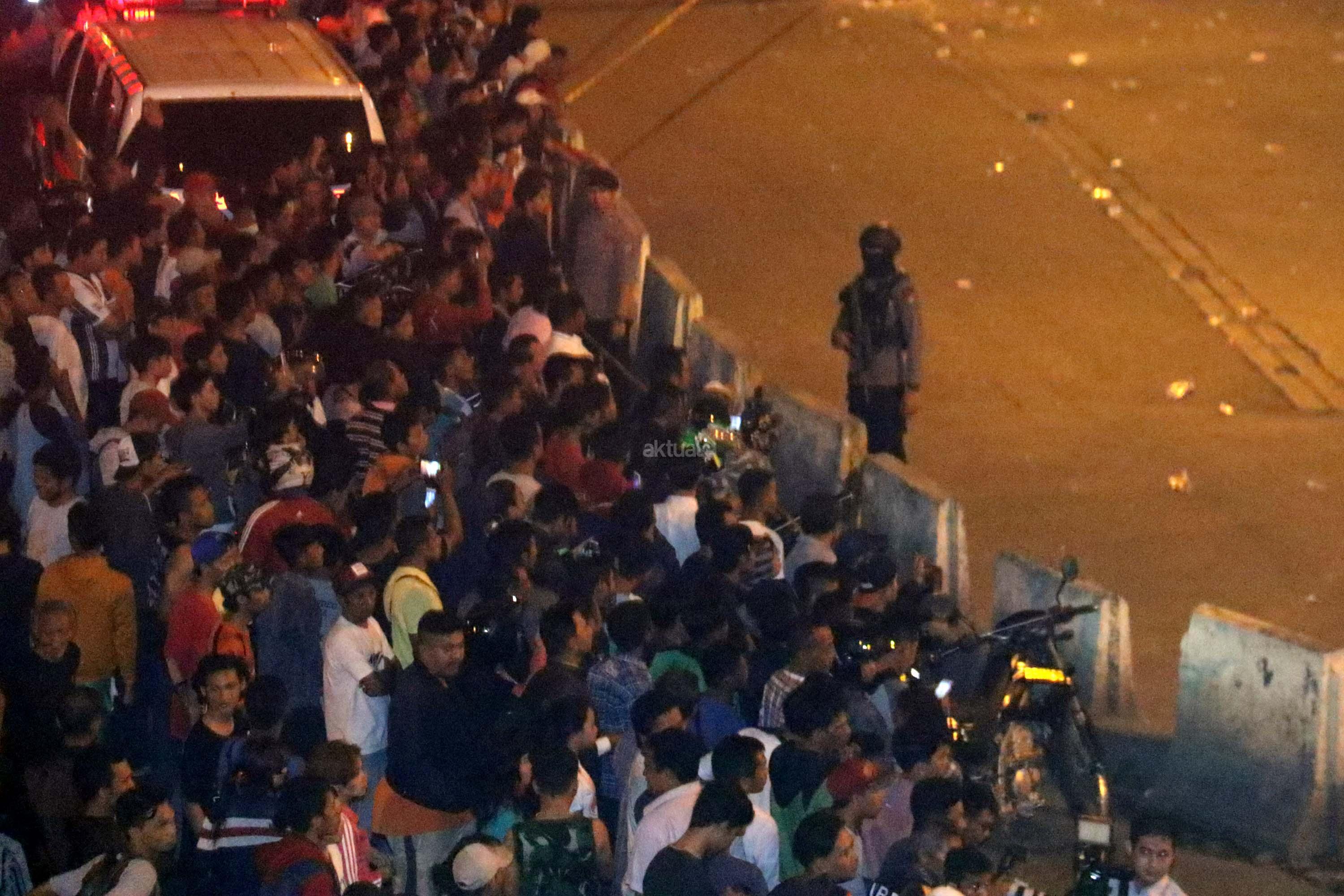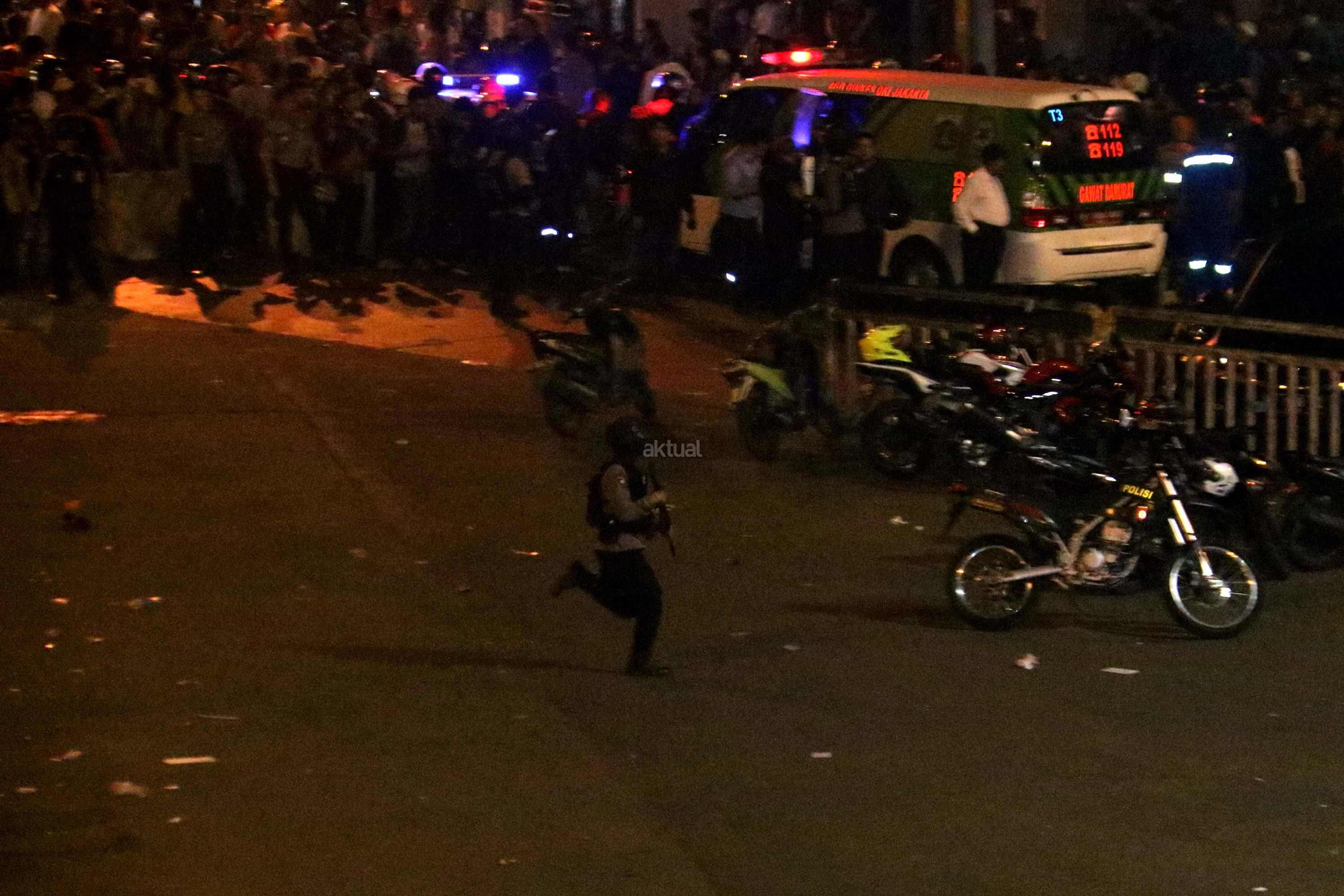 Terlihat personila anggota Kepolisian bersenjatakan lengkap melakukan pengamanan di sekitar lokasi bom di Terminal Kampung Melayu, Jakarta Timur, Rabu (24/5/2017), malam. Dalam ledakan bom yang berada di Terminal Kampung Melayu mengakibatkan orang tewas akibat bom di Kampung Melayu sebanyak 5 orang. Dua orang yang tewas diduga pelaku, 3 orang lainnya adalah personel Polri.