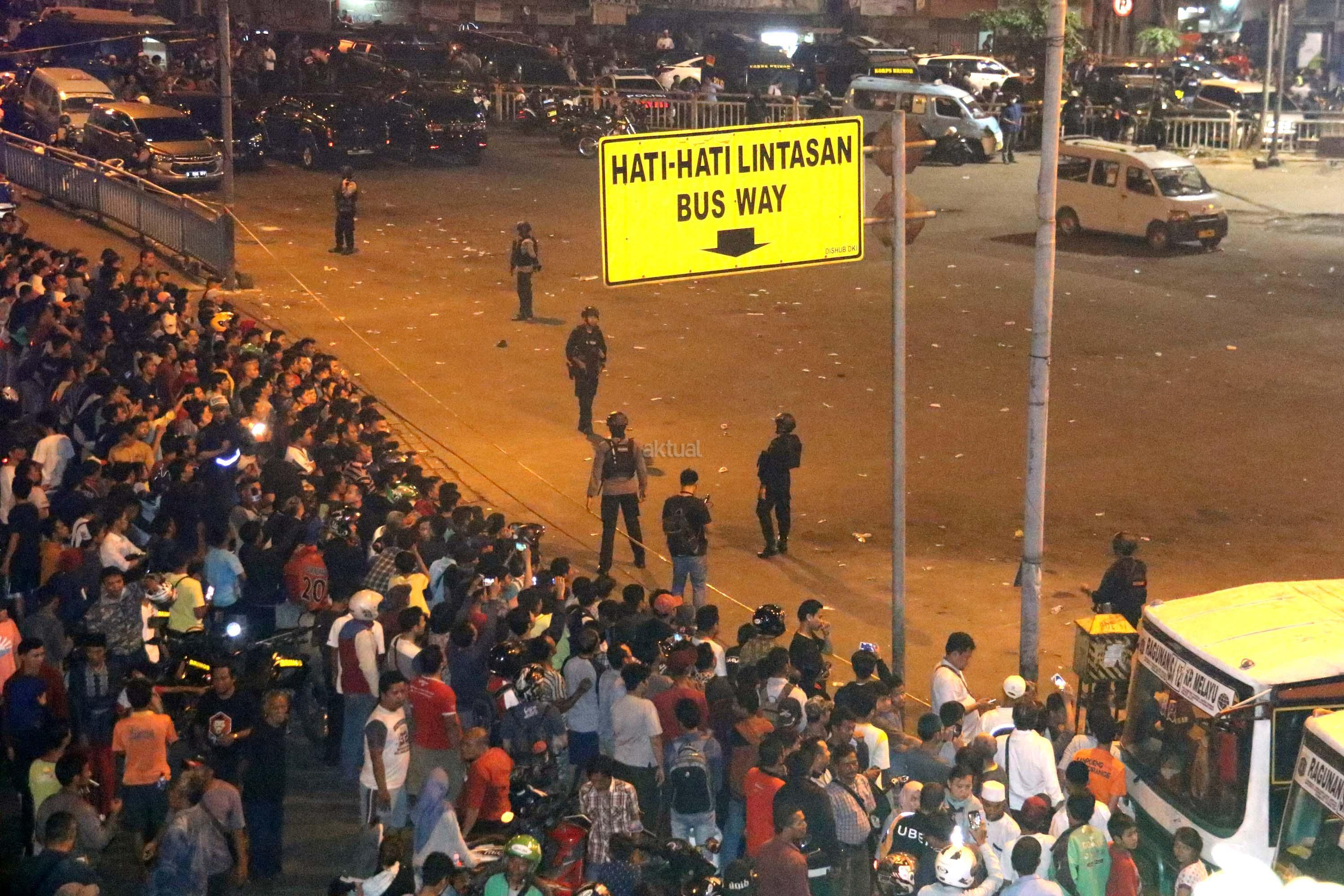 Terlihat personel anggota Kepolisian bersenjatakan lengkap melakukan pengamanan di sekitar lokasi bom di Terminal Kampung Melayu, Jakarta Timur, Rabu (24/5/2017), malam. Dalam ledakan bom yang berada di Terminal Kampung Melayu mengakibatkan korban tewas akibat bom di Kampung Melayu sebanyak 5 orang. Dua orang yang tewas diduga pelaku, 3 orang lainnya adalah personel Polri. AKTUAL/Munzir