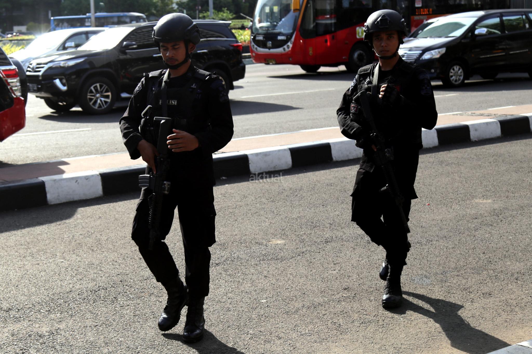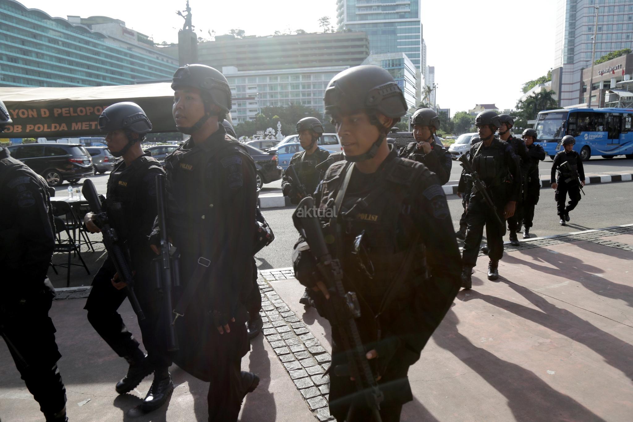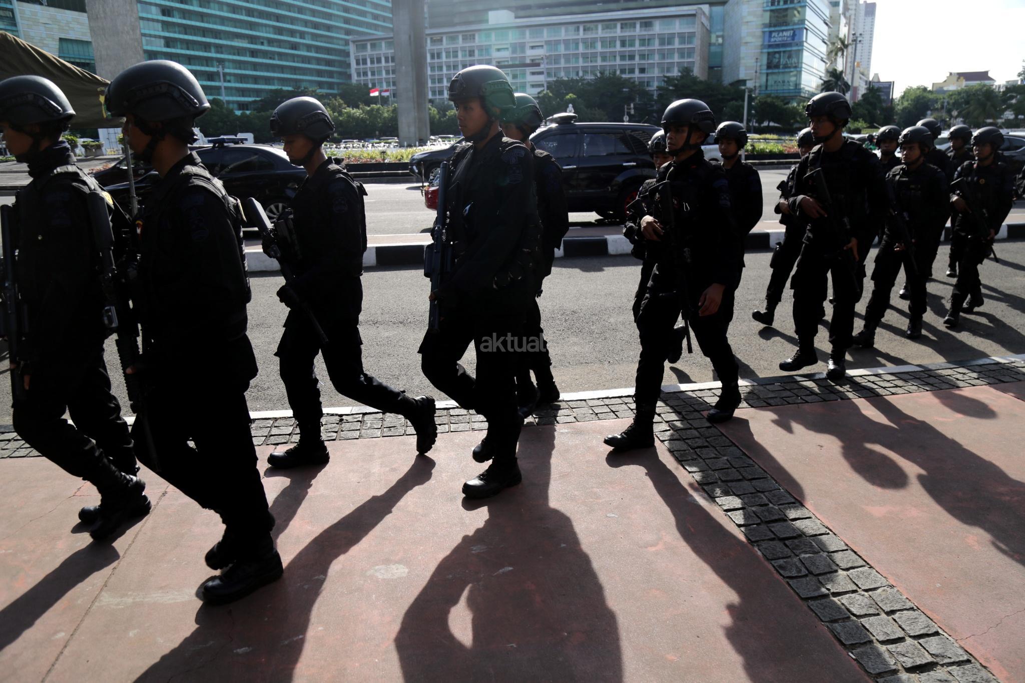 Sejumlah polisi siap berjaga melakukan pengamanan Natal 2017 dan Tahun 2018 di kawasan Bundaran Hotel Indonesia, Jakarta Pusat, Minggu (24/12/2017). Fokus pengamanan adalah tempat-tempat hiburan dan tempat-tempat vital serta gereja kemudian jalur baik kereta, darat, udara, stasiun-stasiun di seluruh Tanah Air. AKTUAL/Tino Oktaviano