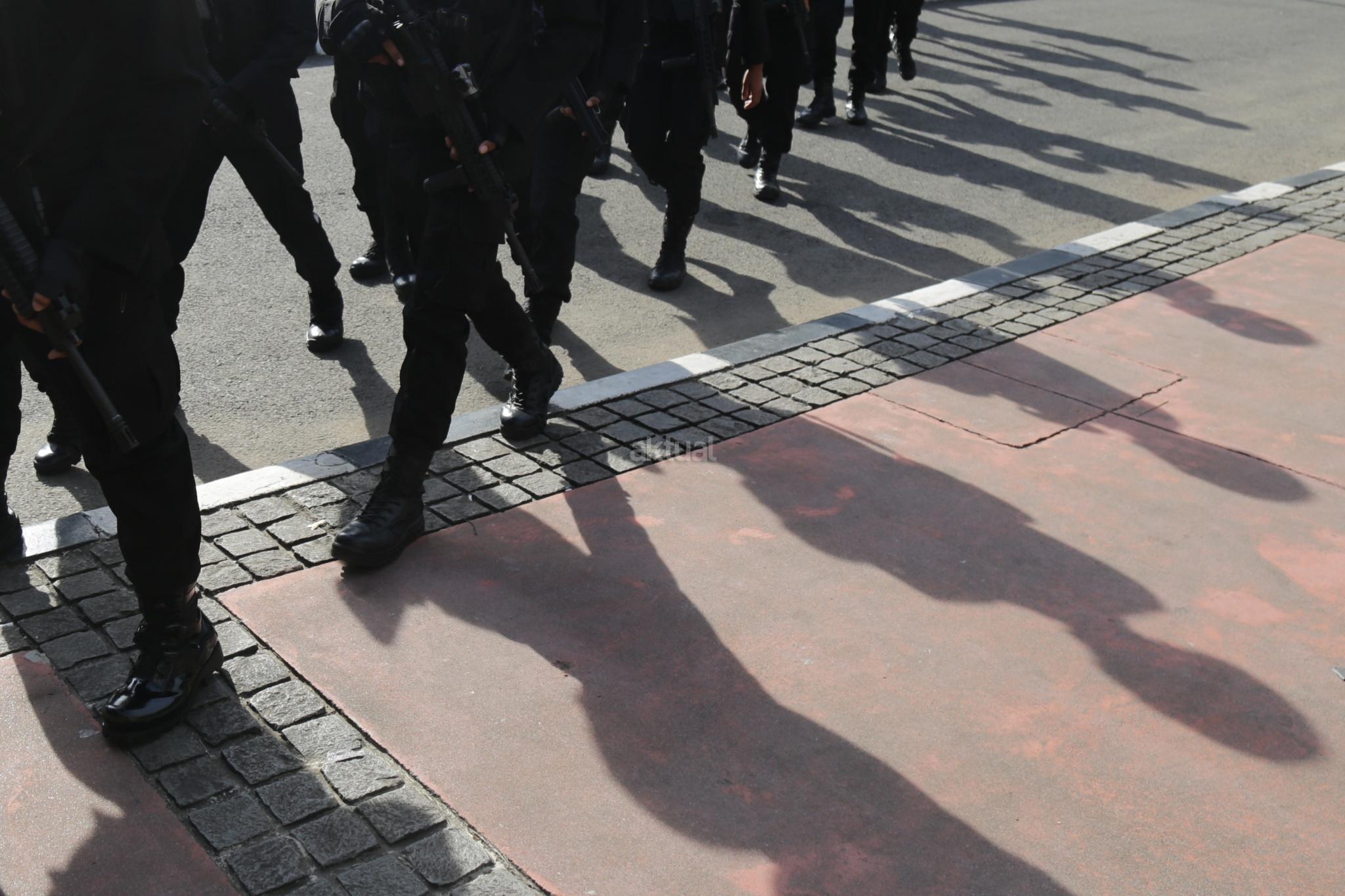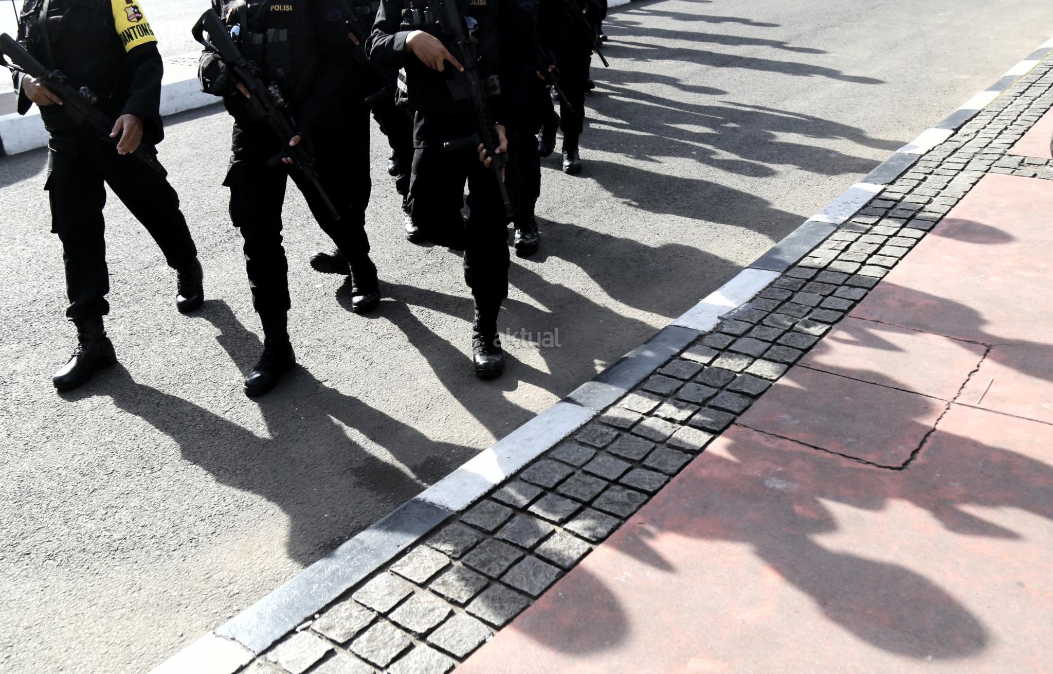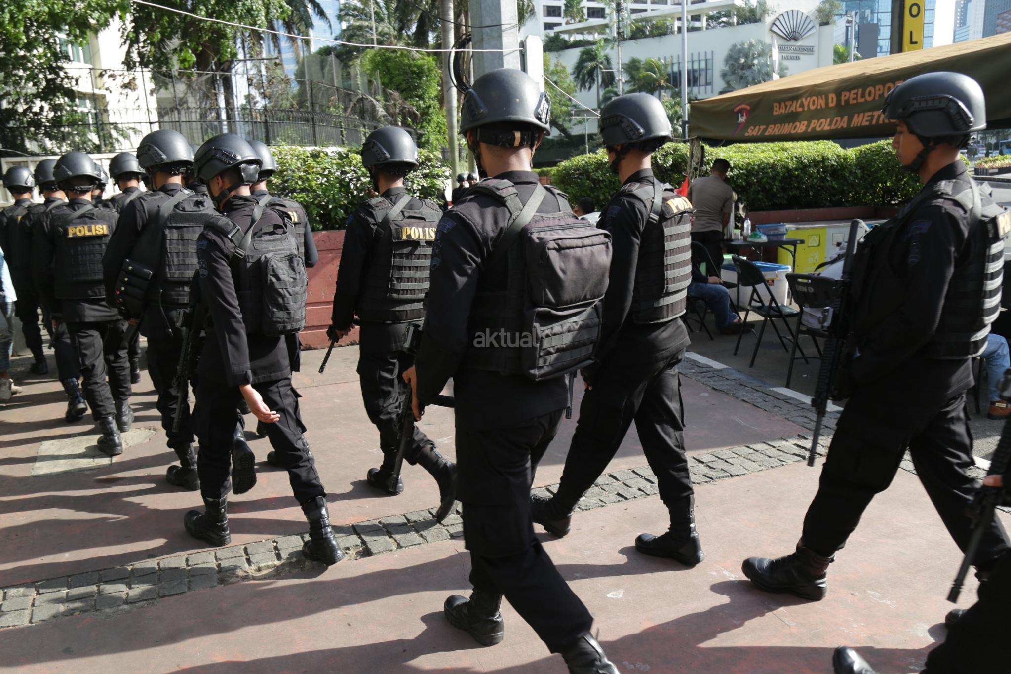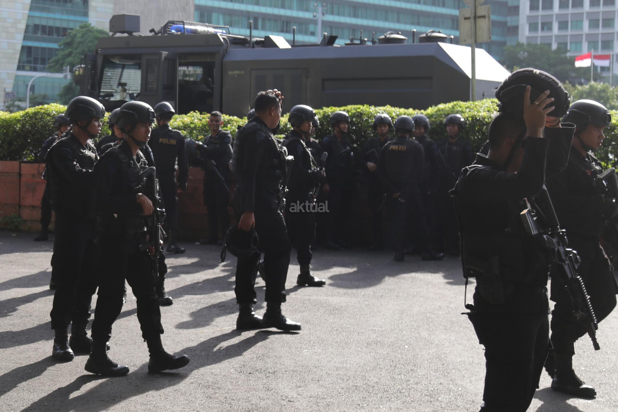 Sejumlah polisi siap berjaga melakukan pengamanan Natal 2017 dan Tahun 2018 di kawasan Bundaran Hotel Indonesia, Jakarta Pusat, Minggu (24/12/2017). Fokus pengamanan adalah tempat-tempat hiburan dan tempat-tempat vital serta gereja kemudian jalur baik kereta, darat, udara, stasiun-stasiun di seluruh Tanah Air. AKTUAL/Tino Oktaviano