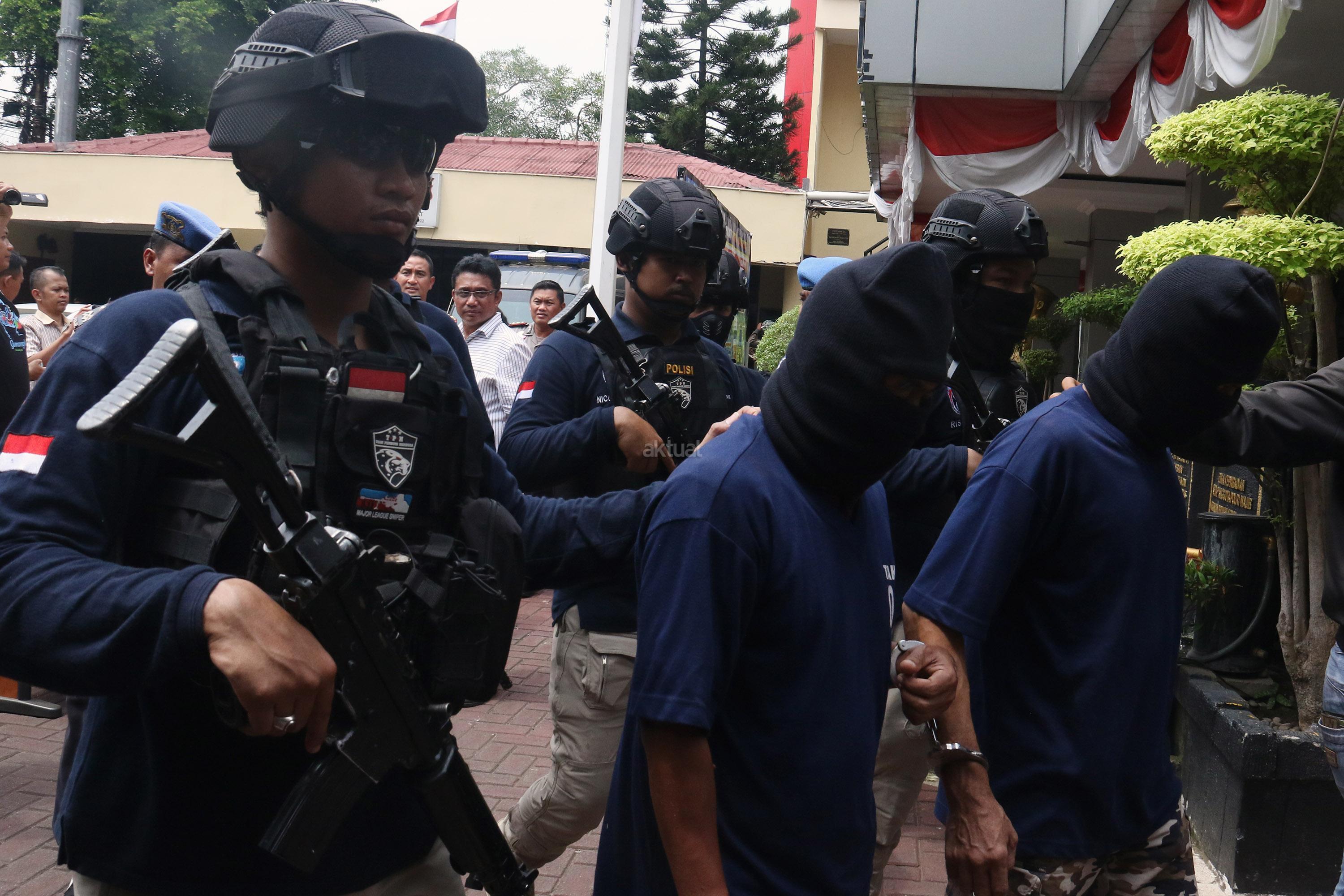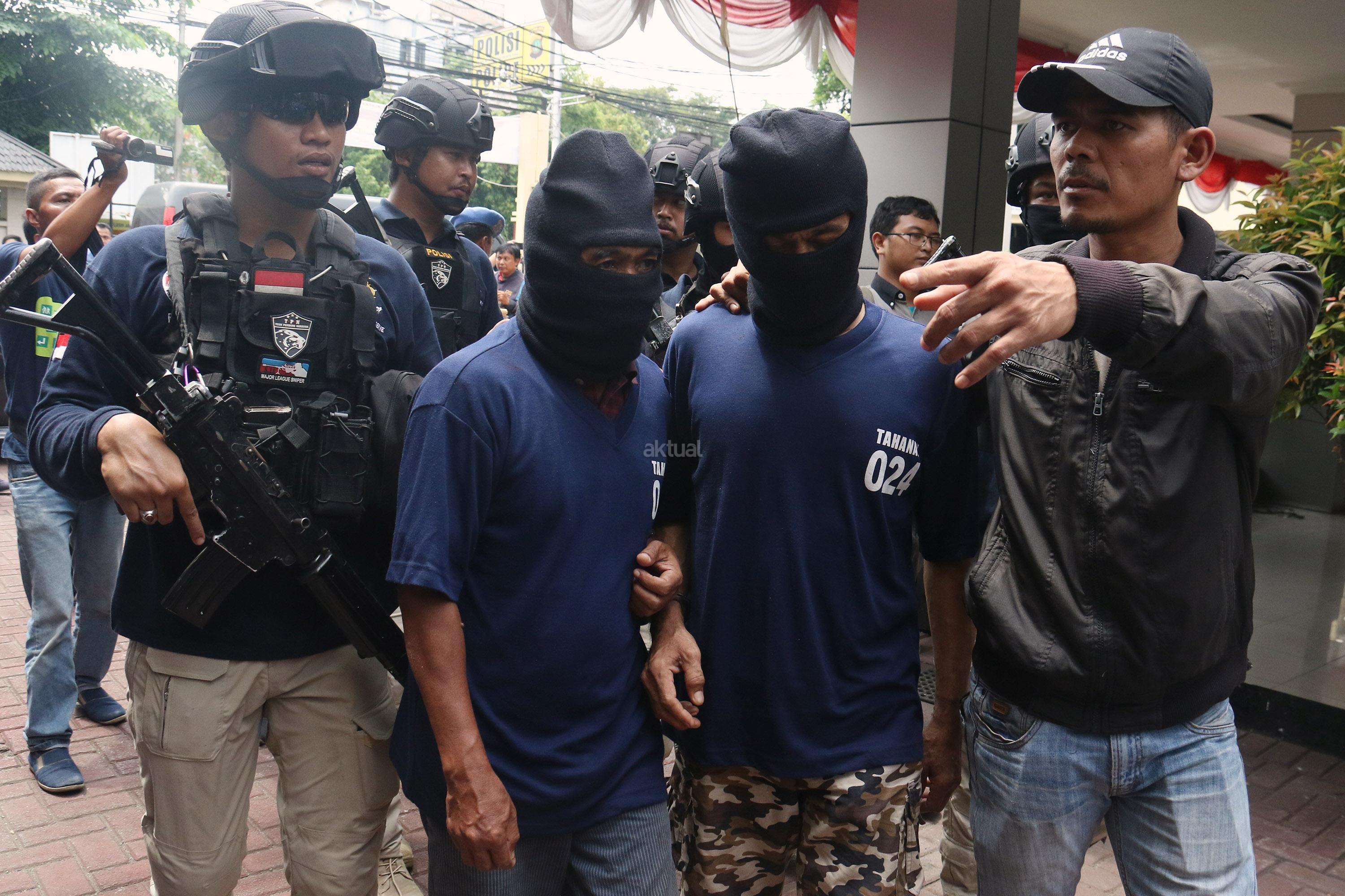 Petugas Kepolisian membawa dua orang tersangka usai jumpa pers di kantor Polres Jakarta Pusat, Selasa (21/11/2017). Dalam jumpa persnya Polres Metro Jakarta Pusat mengungkap penyelundupan narkotika jenis ganja seberat 66,6 Kilogram (Kg) dan berhasil menangkap dua bandar ganja yang merupakan jaringan Aceh – Jakarta. AKTUAL/Munzir