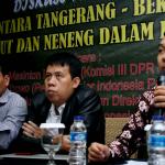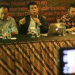 Kiri- kanan. Peneliti Senior Indonesia Public Institute Karyono Wibowo, Direktur Center For Budget Analysis Ucok Sky Khadafi, Wakil Direktur Lembaga Pemilih Indonesia Ilham Sani memberi pemaparan dalam diskusi nasional bertema Antara Tangerang – Bekasi : Dinasti Atut dan Neneng Dalam Komparasi, di Jakarta, Minggu (23/9/2016). Para pembicara menilai adanya praktik politik dinasti membuat suatu daerah sulit berkembang.