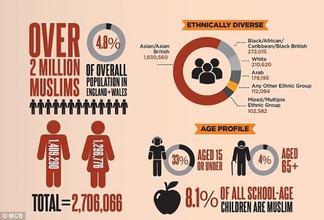 Pada tahun 2011, ada 2,71 juta Muslim yang tinggal di Inggris dan Wales, dibandingkan dengan hanya 1,55 juta pada tahun 2001. Sementara di Skotlandia dan Irlandia Utara ada 77.000 dan 3.800 Muslim. Laporan berjudul “British Muslims in Numbers” (Muslim Inggris dalam Bilangan) menunjukkan bahwa lebih dari setengah Muslim lahir di luar Inggris.