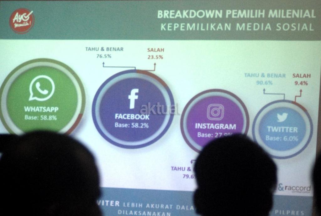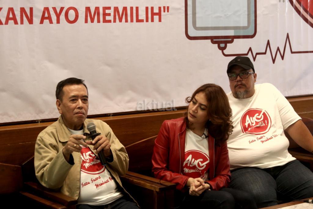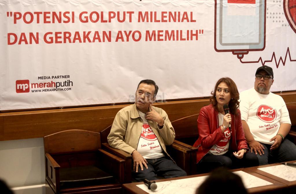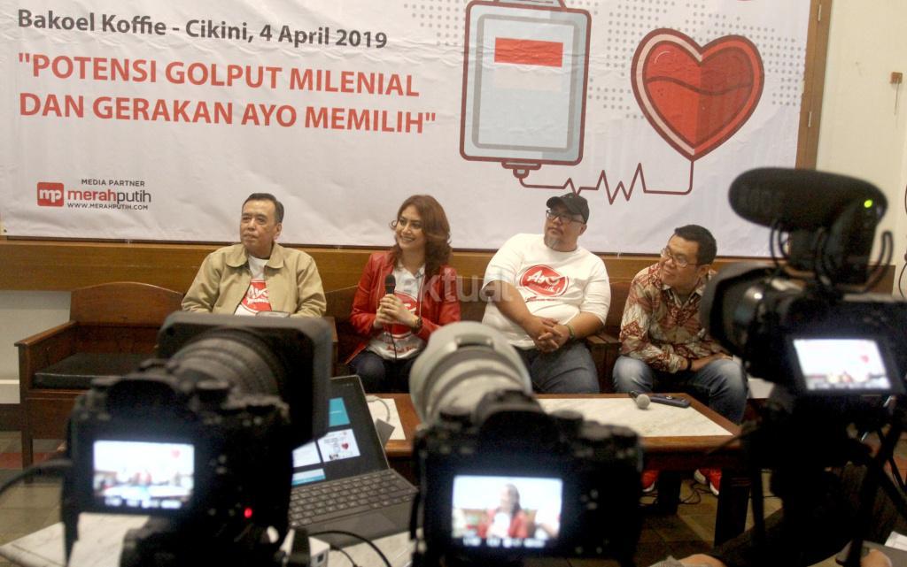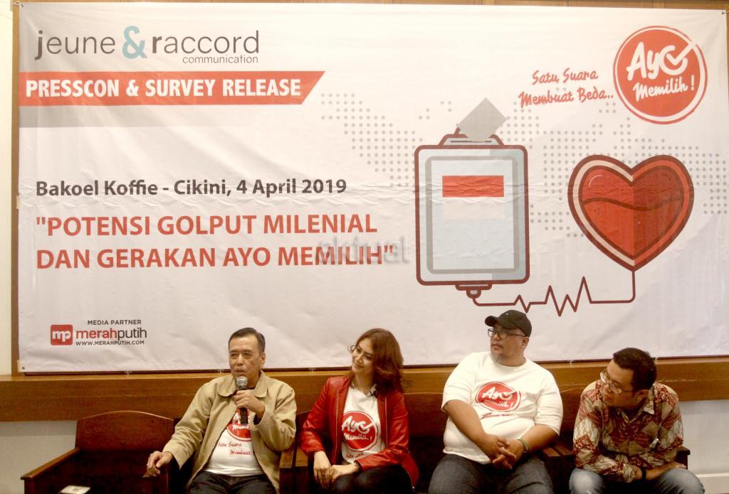 Kiri ke kanan, Pemerhati Sosial Paul Bernadhi, bersama CEO Jeune & Raccord Monica JR dan Creative Director Jeune & Raccord Ari Prijono Setiawan, menyampaikan survey Potensi Golput Milenial dan Gerakan Ayo Memilih di Jakarta. Kamis (4/4). Potensi golput di kalangan Milenial cukup tinggi yakni di atas angka 40 persen, dua alasan yang menonjol sebagai penyebab yaitu mereka apatis dan tak perduli politik (65.4 persen), kurang terinformasi/tak mengetahui dengan benar kapan hari pencoblosan pilpres itu (25.3 persen). Perlu dilakukan gerakan nasional untuk mengurangi potensi golput di kalangan milenial salahsatunya memulai kampanye Gerakan Ayo Memilih, dengan menggelar kegiatan-kegiatan milenial. AKTUAL/Tino Oktaviano