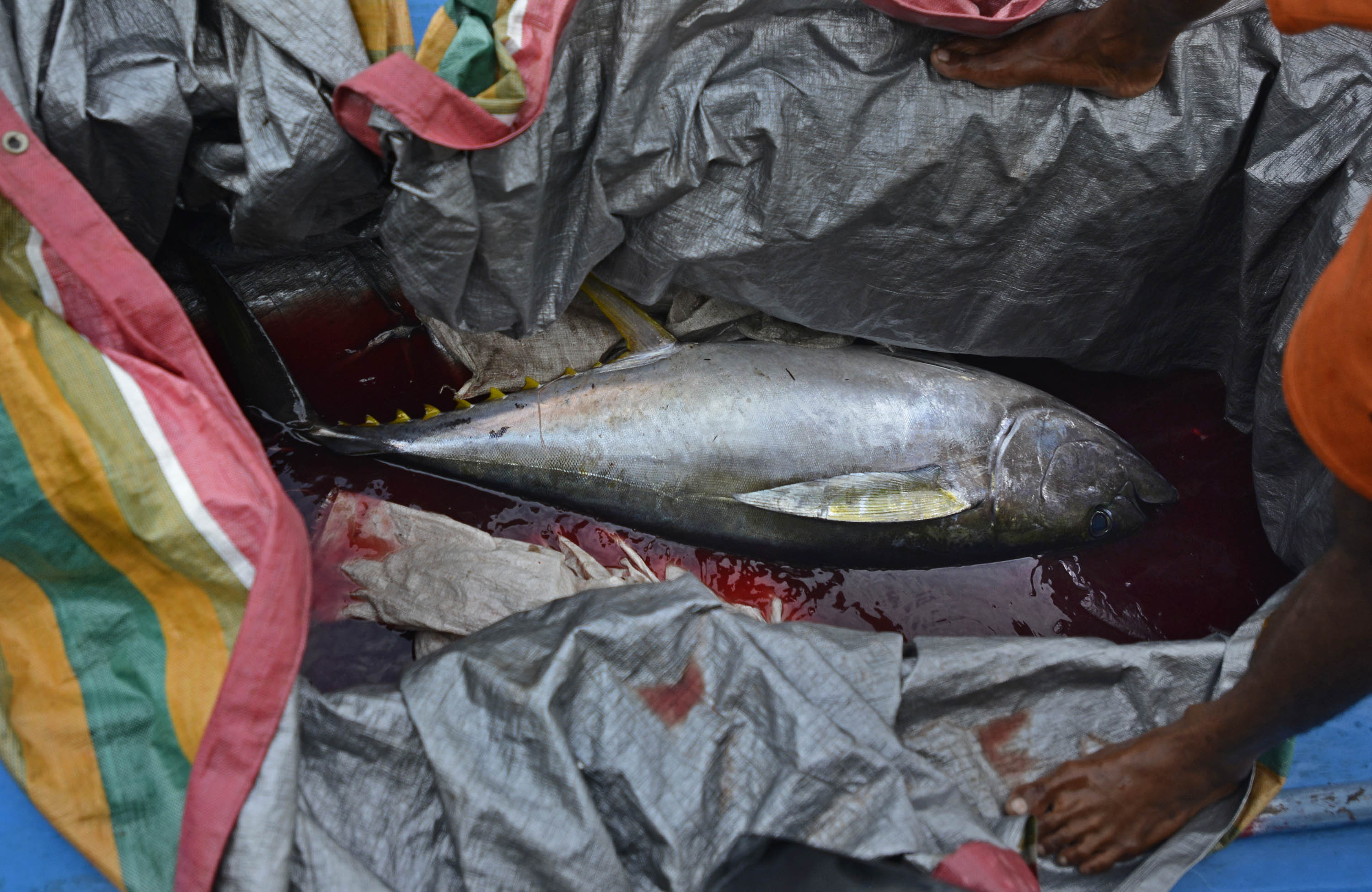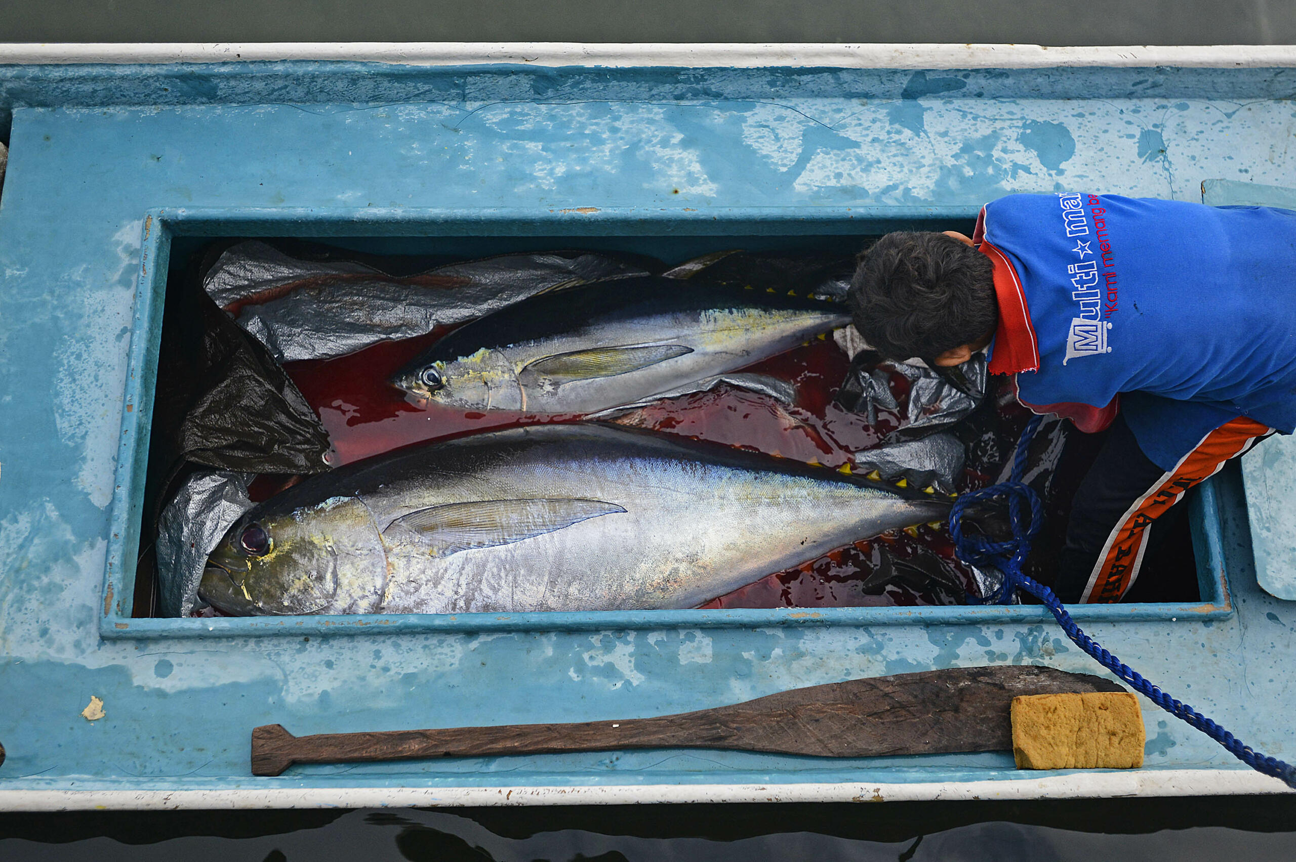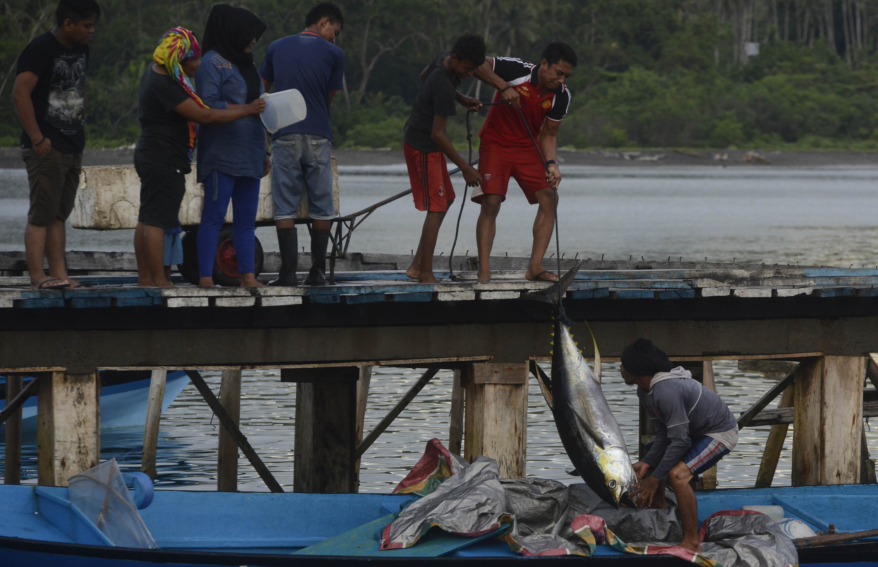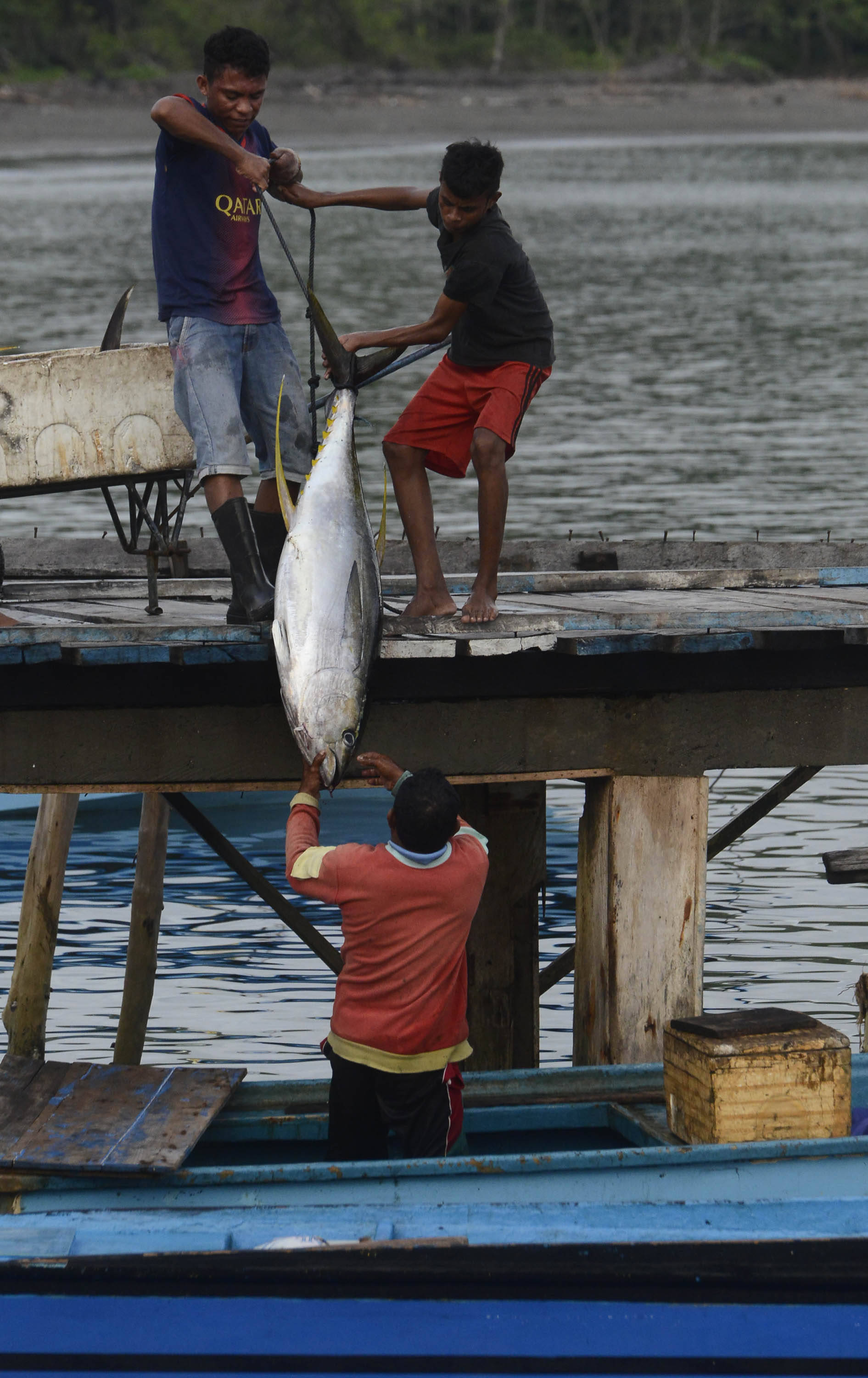Nelayan membongkar tangkapan ikan tuna di dermaga desa Daeo, Pulau Morotai, Minggu (15/11). Potensi produksi ikan tuna di perairan Pulau Morotai diperkirakan mencapai 60 ribu ton per tahun namun yang dimanfaatkan selama ini masih di bawah 10 ribu ton per tahun itu pun sebagian besar dinikmati nelayan luar Morotai, seperti dari Sulawesi Utara. ANTARA FOTO/Fanny Octavianus/pras/15.