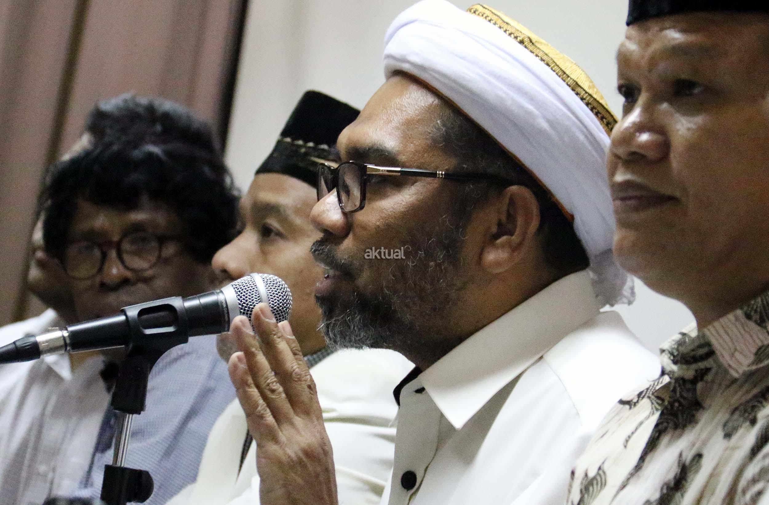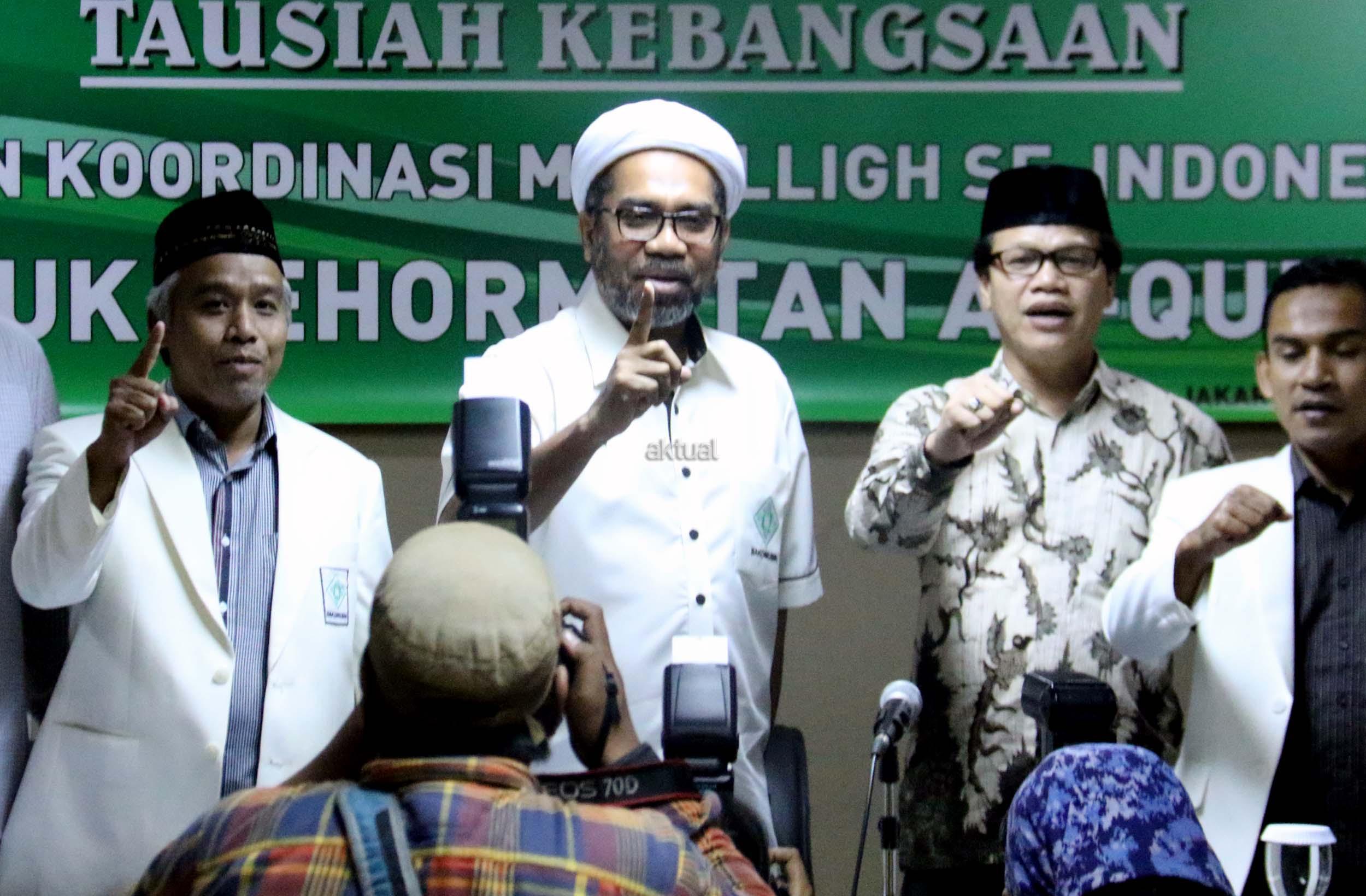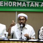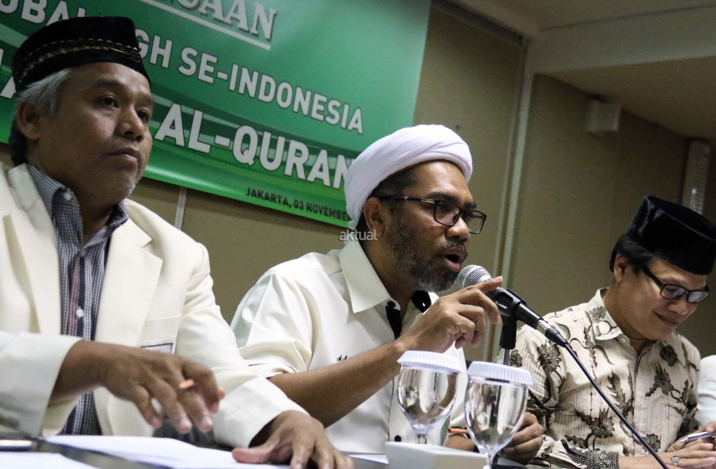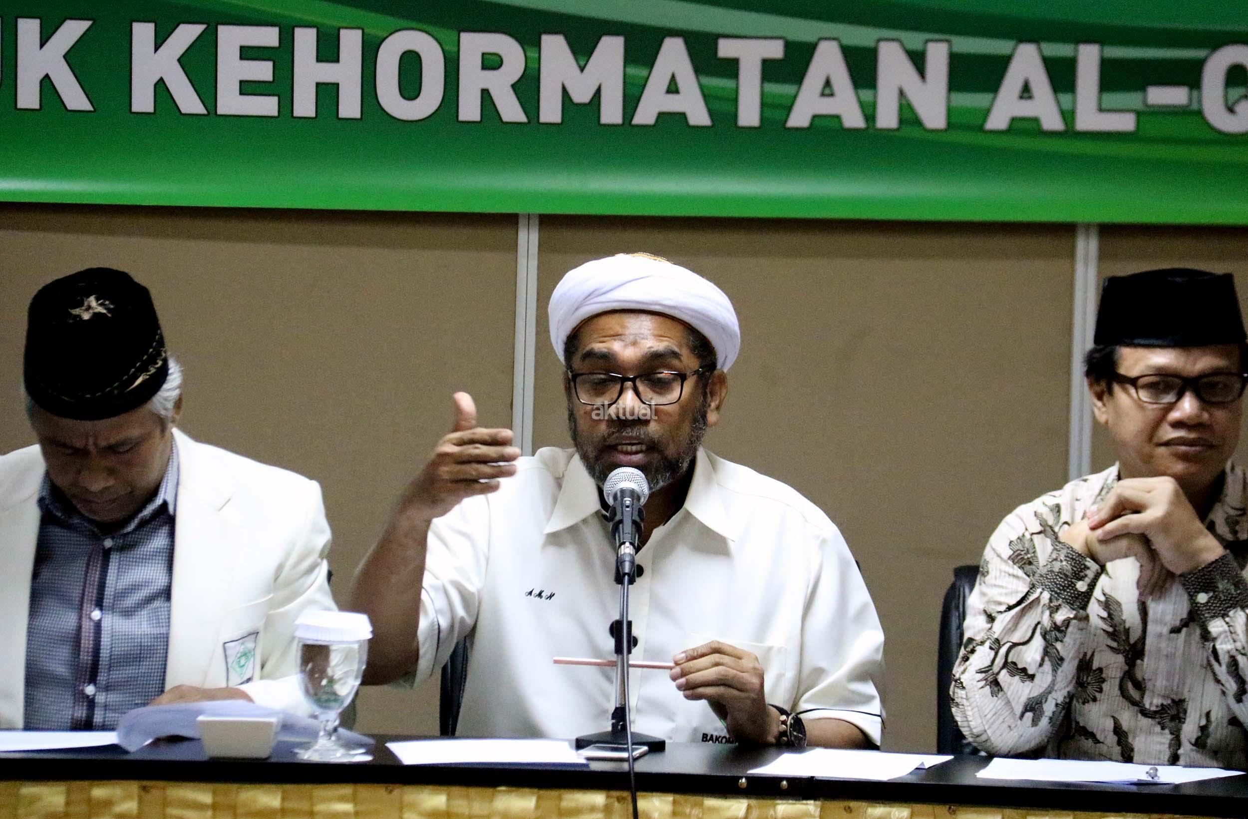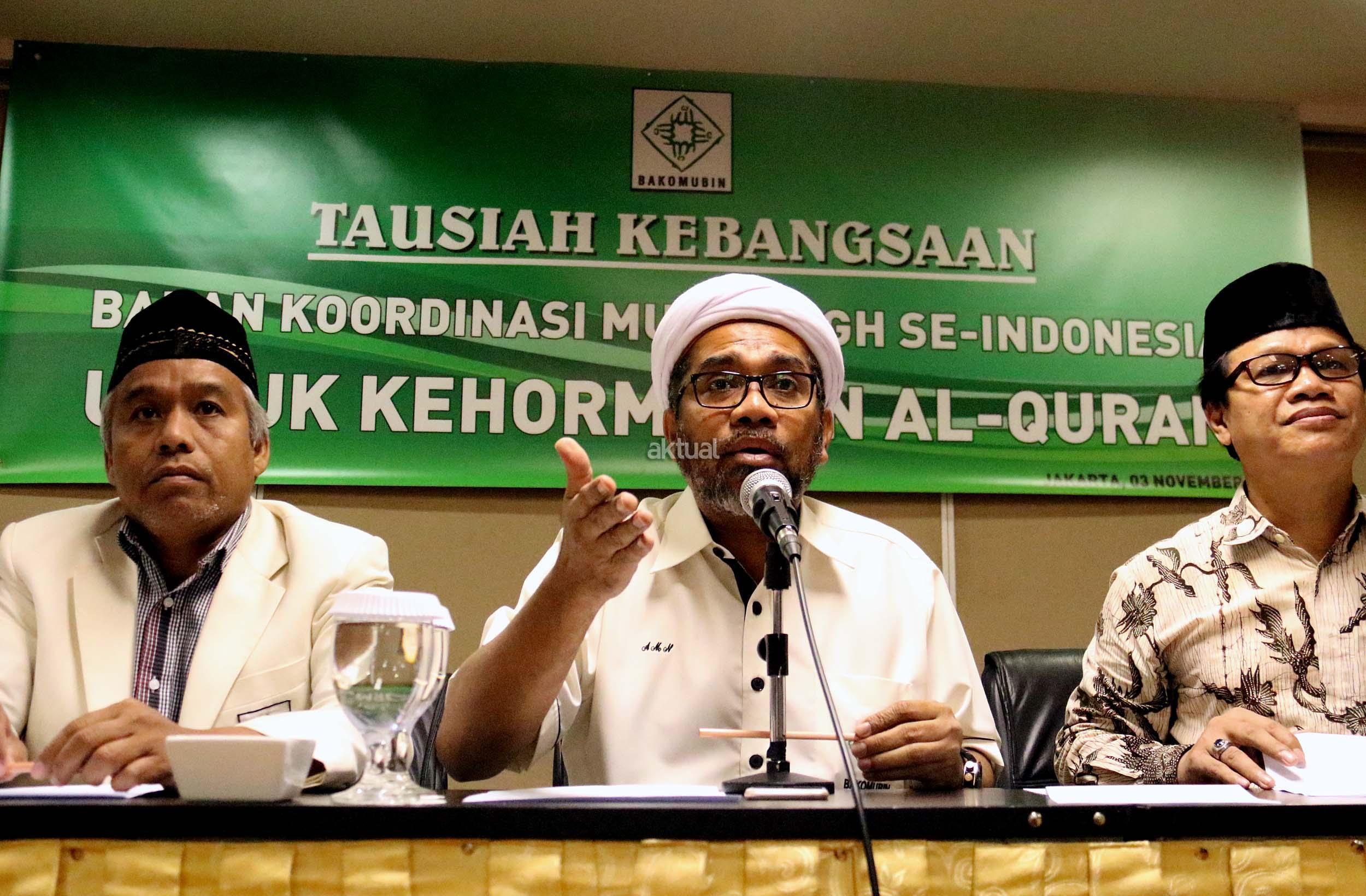 Ketua Umum PP Badan Koordinasi Muballigh se-Indonesia (Bakomubin) Ali Mochtar Ngabalin (tengah) didampingi sejumlah pengurus memberikan keterangan pers mengenai Aksi Damai pada tanggal 4 November 2016 di Jakarta, Kamis (3/11/2016). Dalam keterangannya PP Bakomubin mendesak pihak kepolisian untuk segera memeriksa Basuki Tjahaja Purnama terkait pernyataannya yang dinilai telah menyinggung umat muslim. AKTUAL/Munzir