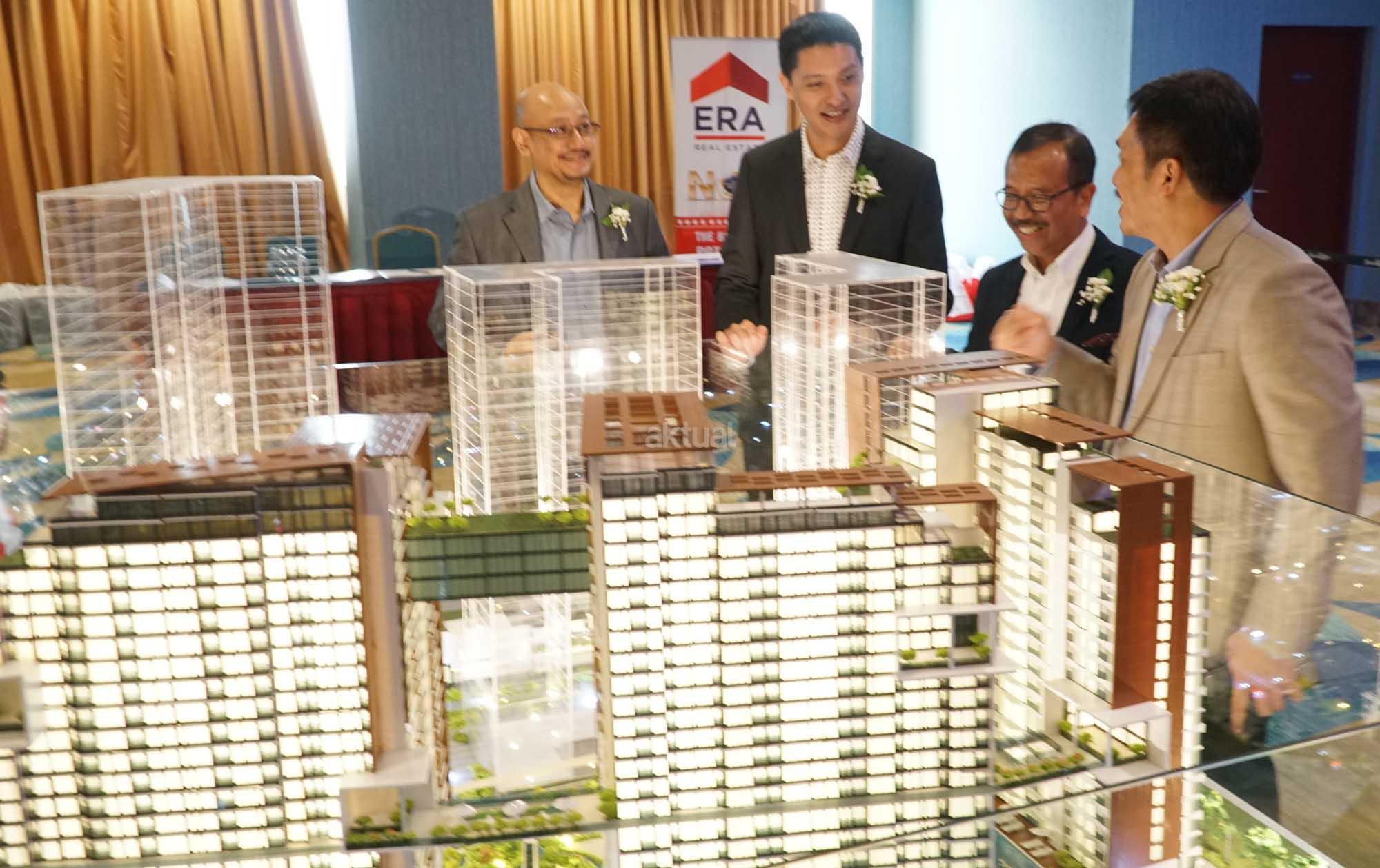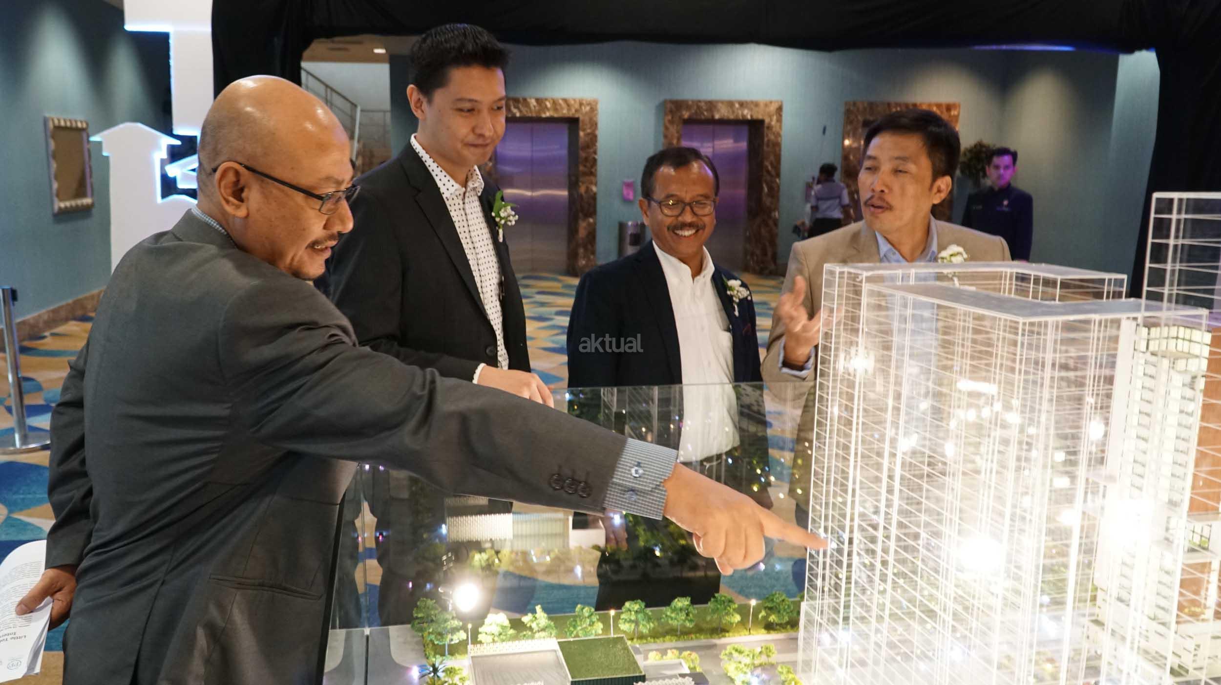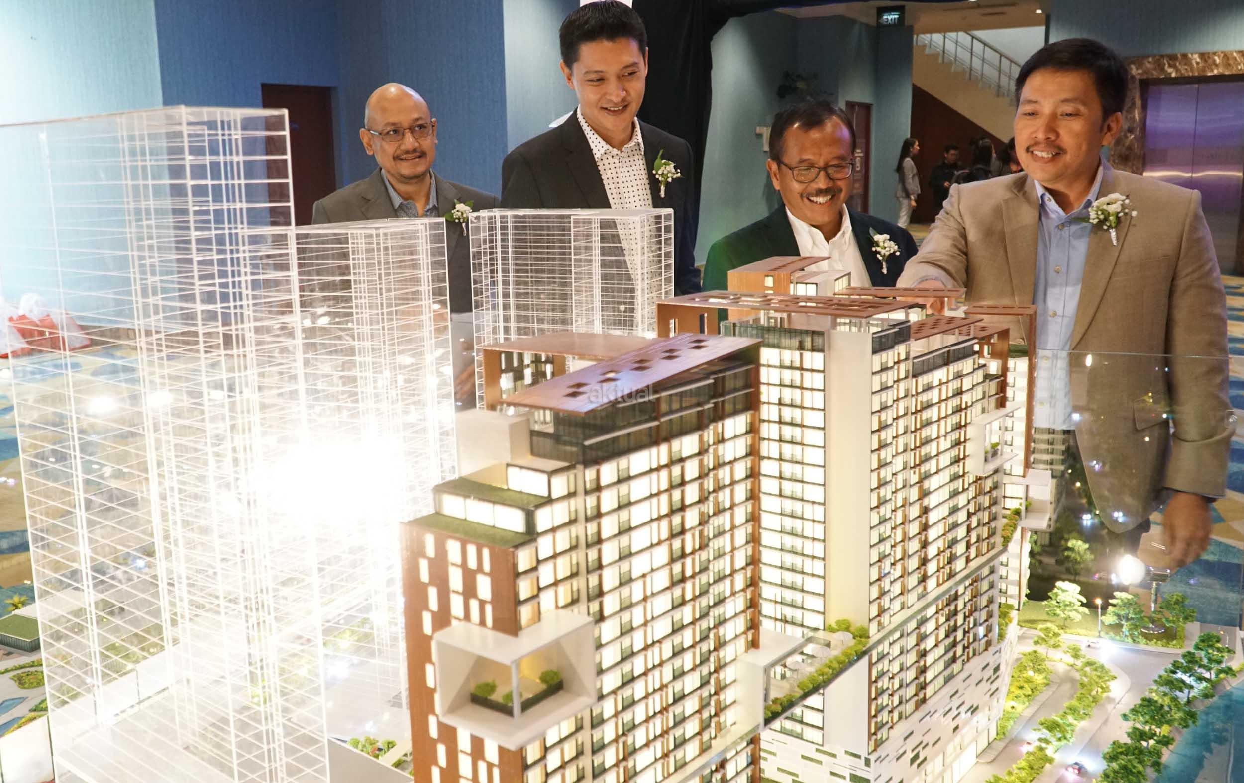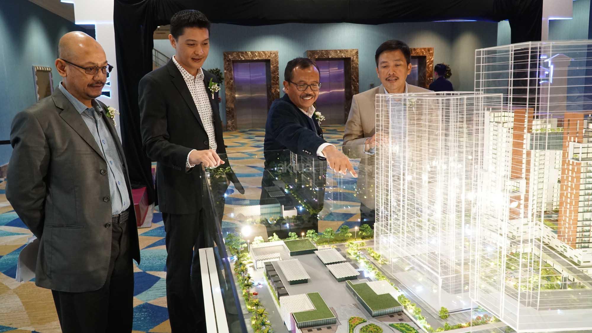 Direktur Operasi PT PP Properti Jababeka Residence Awanu Alfan (dari kiri) bersama Dirut PT Grahabuana Cikarang Sutedja Sidarta Darmono, Dirut PT PP Properti Jababeka Residence Harris Amin Singgih, dan Direktur Realti PT PP Properti Tbk Galih Saksono, mengamati maket pengembangan Little Tokyo, di Jakarta, Kamis (19/4). Dua pengembang properti itu mendirikan PT PP Properti Jababeka Residence, dengan mengembangkan Little Tokyo hunian vertikal terpadu di atas lahan seluas 4,6 hektare yang berada di jantung Kota Jababeka, Cikarang. AKTUAL/Eko S Hilman