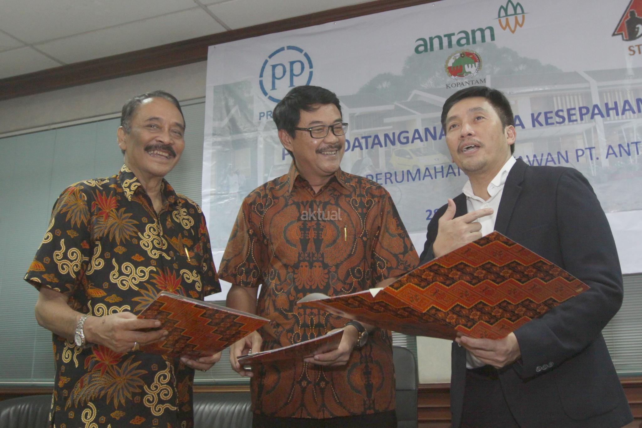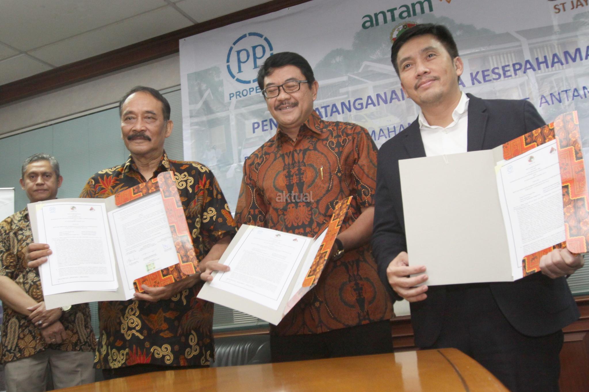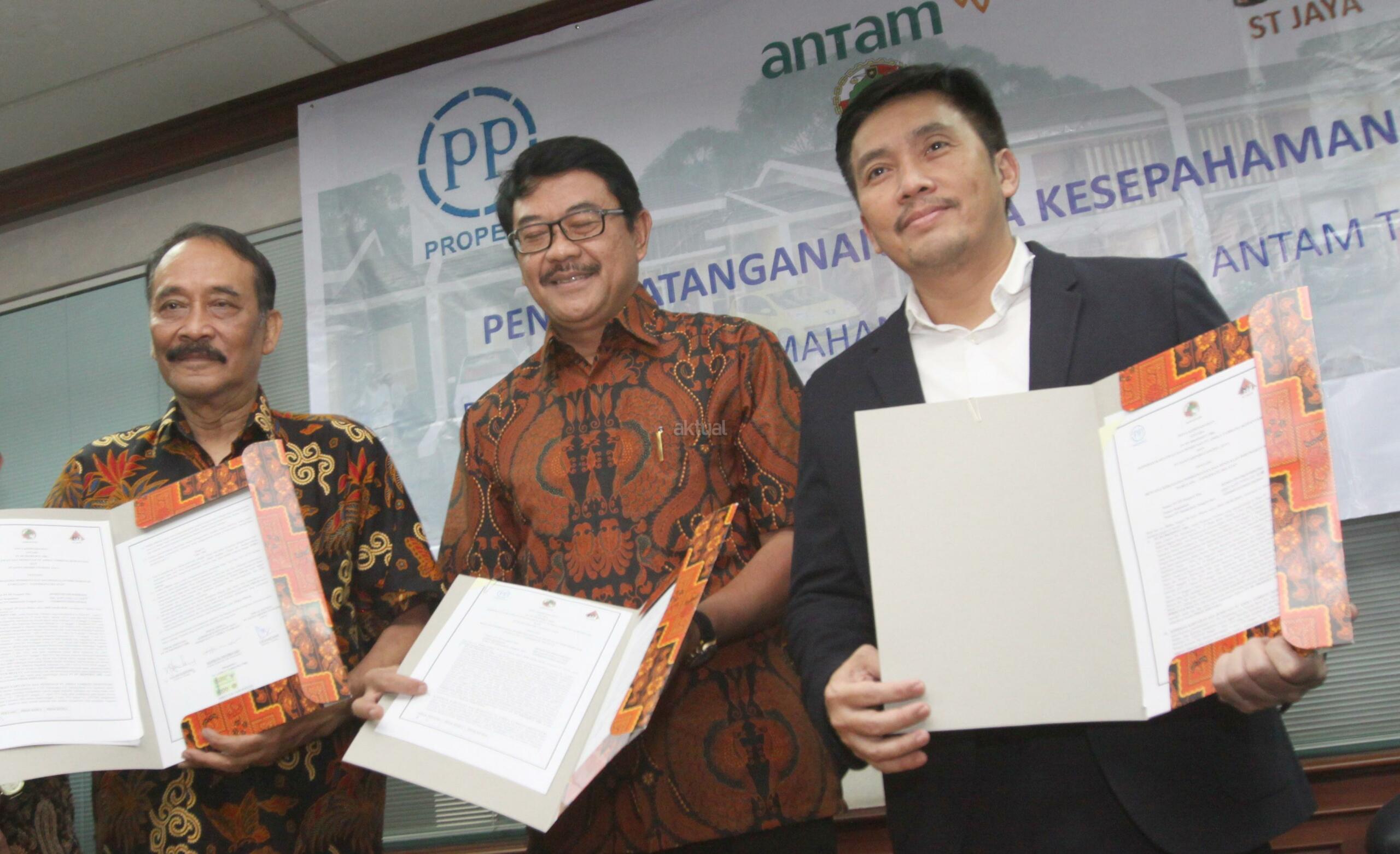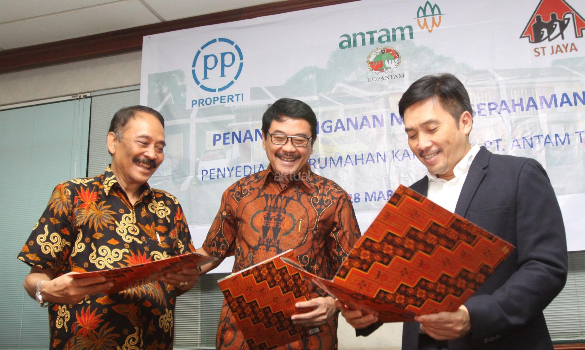 Dari kiri ke kanan, Ketua koperasi dan pensiunan PT Antam Tbk Bambang Hendratho, Dirut PY Sanitarindo Tangsel Jaya S B Hartadji dan Direktur Realti PT PP Properti Tbk Galih Saksono saat penandatanganan nota kesepahaman penyediaan perumahan karyawan Antam di Jakarta, Rabu (28/03/18). PT PP Properti Tbk berkerja sama dengan koperasi karyawan PT Antam Tbk untuk penyediaan perumahan karyawan dengan luas area 2,1 ha dengan perkiraan 200 unit rumah dengan total nilai Rp150 miliar. Lokasi di Pamulang, Tangerang Selatan. AKTUAL/Eko S Hilman