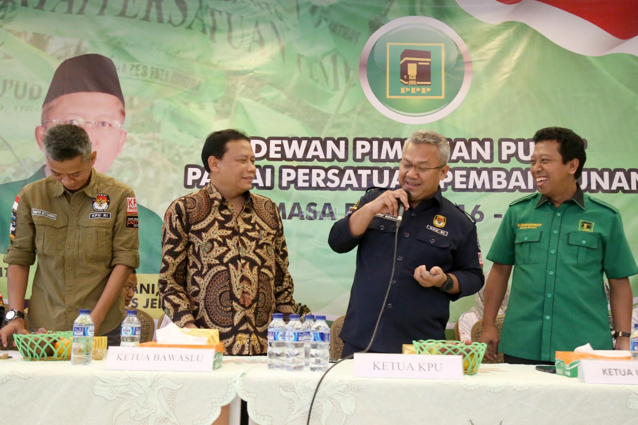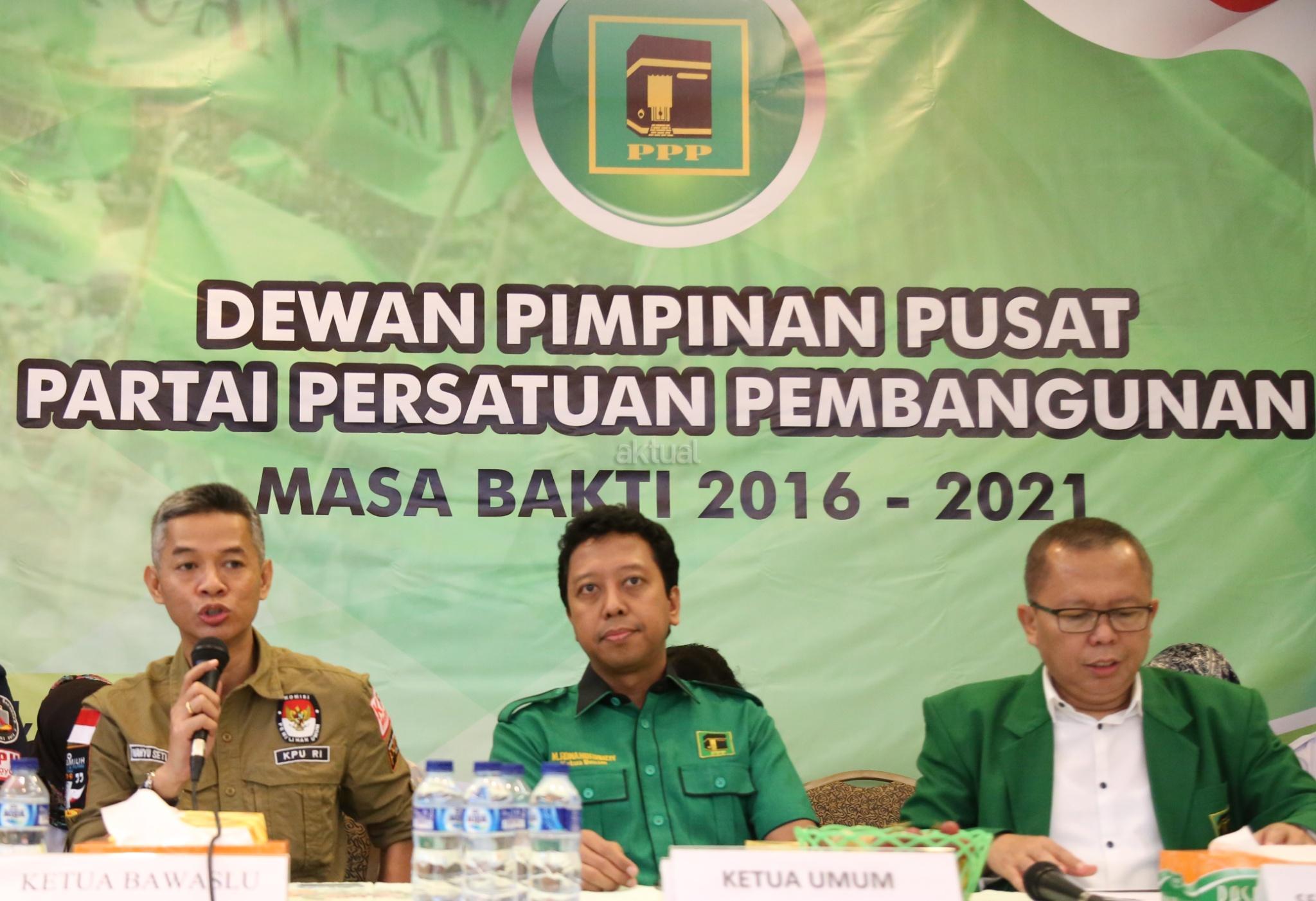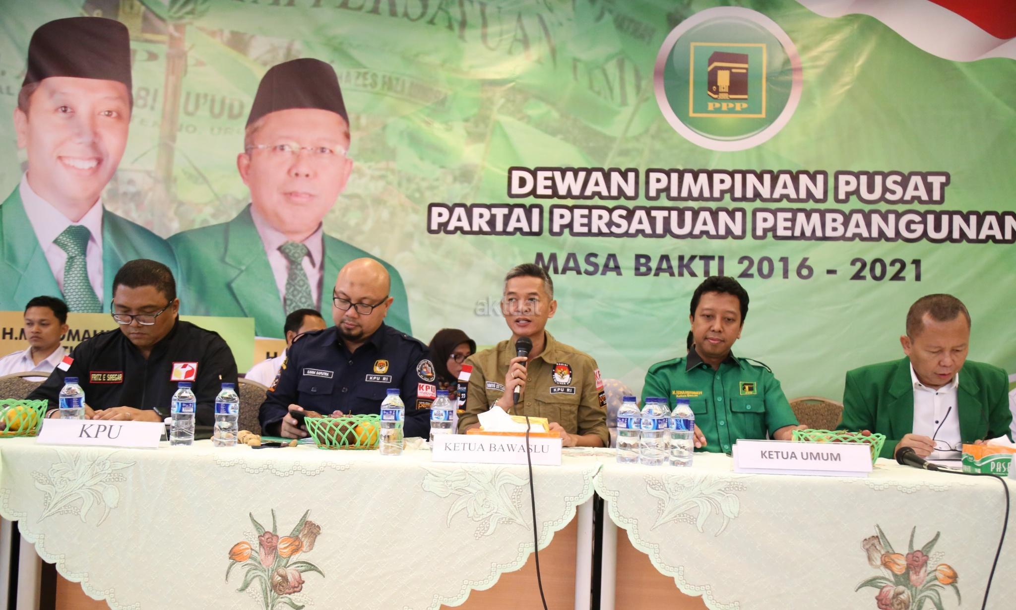 Ketua Umum Dewan Pimpinan Pusat Partai Persatuan Pembangunan (DPP PPP) Romahurmuziy bersalaman dengan Ketua Komisi Pemilihan Umum (KPU) Arief Budiman, saat menyatakan bahwa PPP memenuhi semua syarat verifikasi faktual di tingkat pimpinan pusat di kantor DPP PPP, Jalan Dipenogoro, Jakarta Pusat, Senin (29/1/2018). Ketua KPU menyatakan bahwa PPP memenuhi semua syarat verifikasi faktual. Keputusan itu diambil usai tim KPU bersama Badan Pengawas Pemilu (Pemilu) melakukan proses verifikasi faktual. Ada tiga komponen yang diperiksa oleh KPU, yaitu keanggotaan kepengurusan partai di tingkat pusat, domisili kantor, dan keterwakilan perempuan. AKTUAL/Tino Oktaviano
