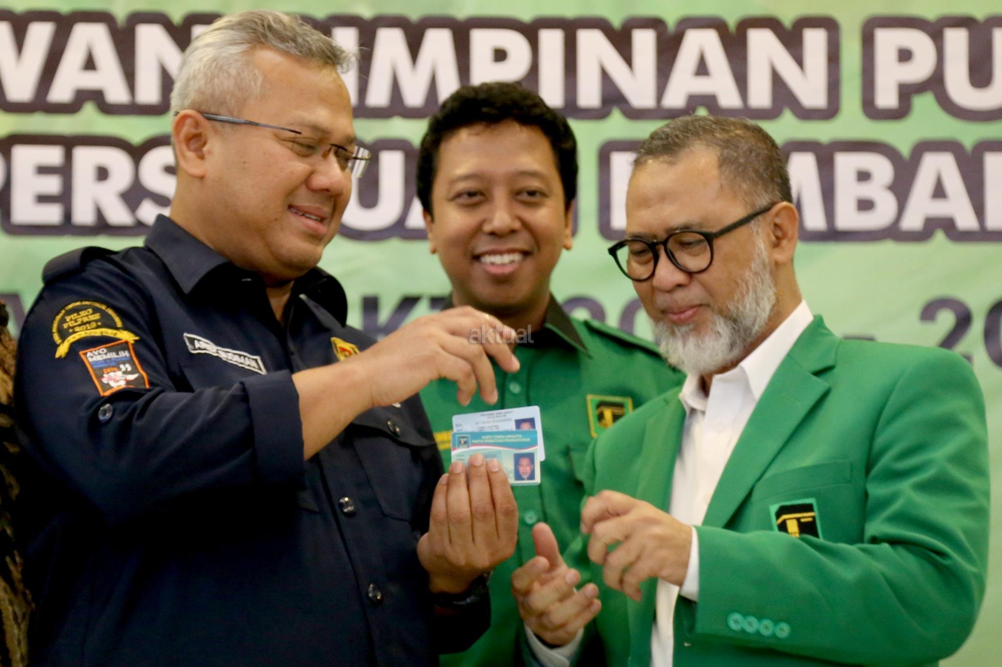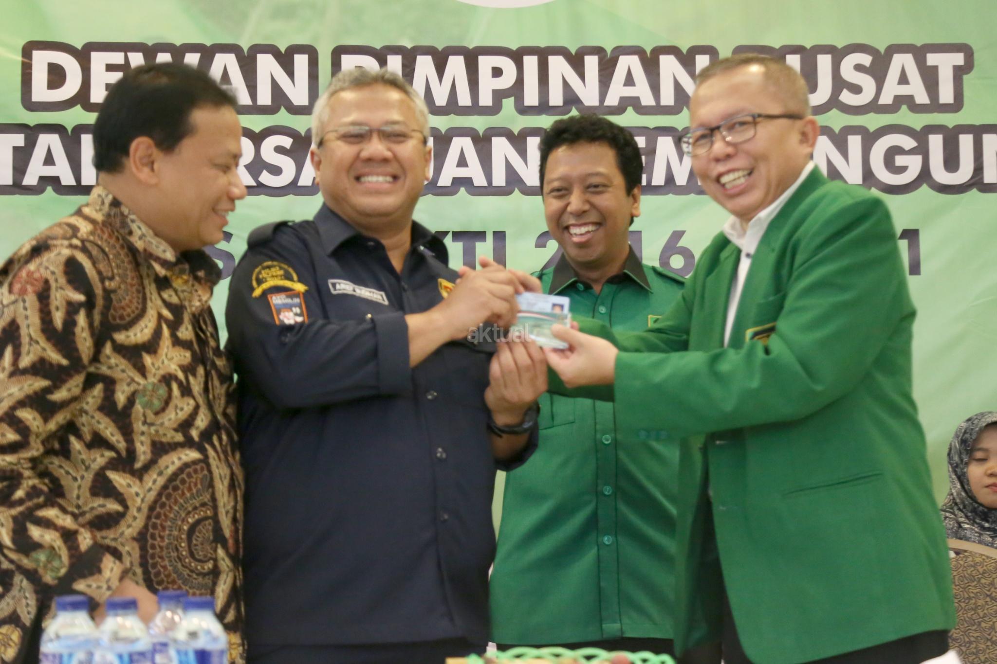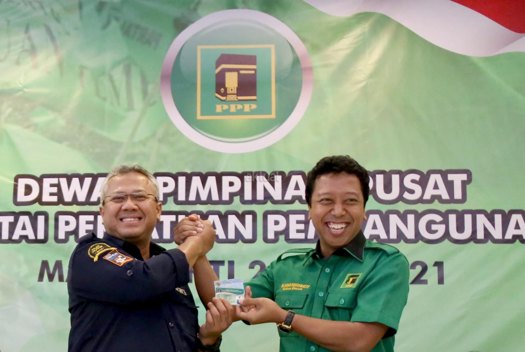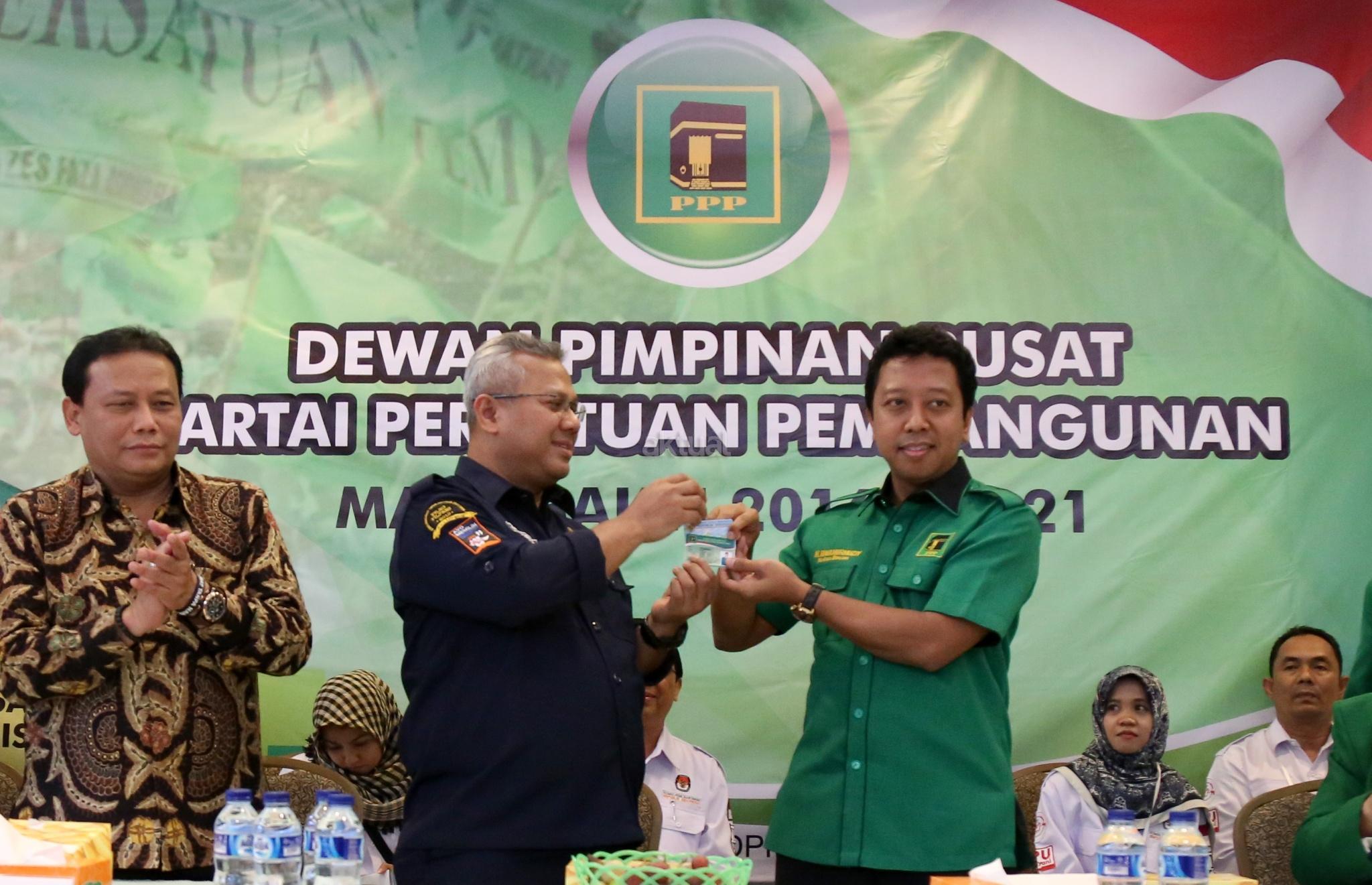 Ketua Umum Dewan Pimpinan Pusat Partai Persatuan Pembangunan (DPP PPP) Romahurmuziy bersalaman dengan Ketua Komisi Pemilihan Umum (KPU) Arief Budiman, saat menyatakan bahwa PPP memenuhi semua syarat verifikasi faktual di tingkat pimpinan pusat di kantor DPP PPP, Jalan Dipenogoro, Jakarta Pusat, Senin (29/1/2018). Ketua KPU menyatakan bahwa PPP memenuhi semua syarat verifikasi faktual. Keputusan itu diambil usai tim KPU bersama Badan Pengawas Pemilu (Pemilu) melakukan proses verifikasi faktual. Ada tiga komponen yang diperiksa oleh KPU, yaitu keanggotaan kepengurusan partai di tingkat pusat, domisili kantor, dan keterwakilan perempuan. AKTUAL/Tino Oktaviano