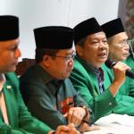 Ketua DPP Partai Persatuan Pembangunan (PPP) Muktamar Jakarta Ibnu Hajar Dewantara didampingi (kiri ke kanan) Ketua DPP PPP Iko Yutrika Saleh, Sekretaris Jenderal PPP Sudarto, Mahkamah Partai DPP PPP Teddy Anwar dan Wakil Sekjen PPP Mimin Austiyana saat konferensi pers seputar penyelenggaraan Musyawarah Kerja Nasional (Mukernas) PPP di Kantor Sekretariat DPP PPP Muktamar Jakarta, Jalan Proklamasi, Jakarta Pusat, Senin (12/11/2018). PPP Muktamar Jakarta akan mengukuhkan Humphrey R. Djemat sebagai pelaksanakan tugas (plt) ketua umum saat Musyawarah Kerja Nasional (Mukernas) 15-16 November 2018. Humphrey Djemat akan menggantikan Djan Faridz yang mengundurkan diri sebagai Ketua Umum PPP Muktamar Jakarta. AKTUAL/Tino Otaviano