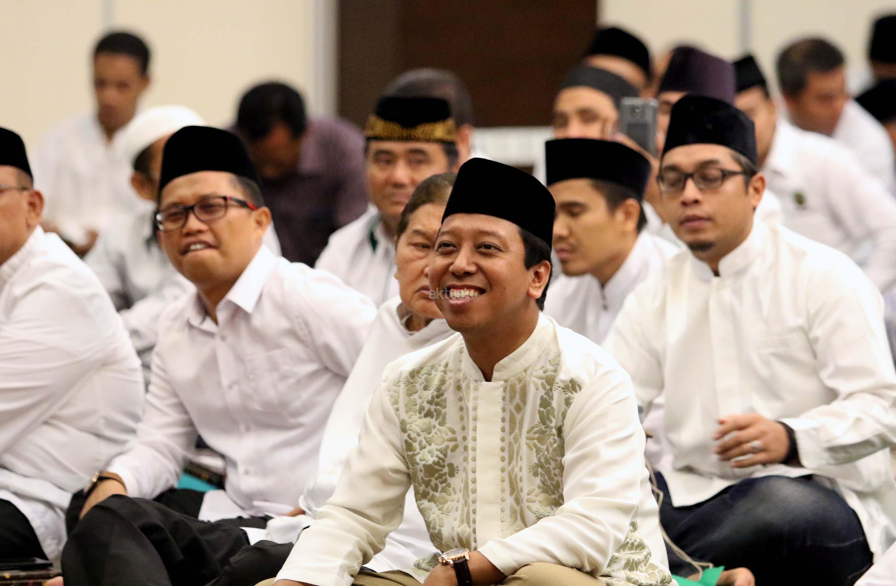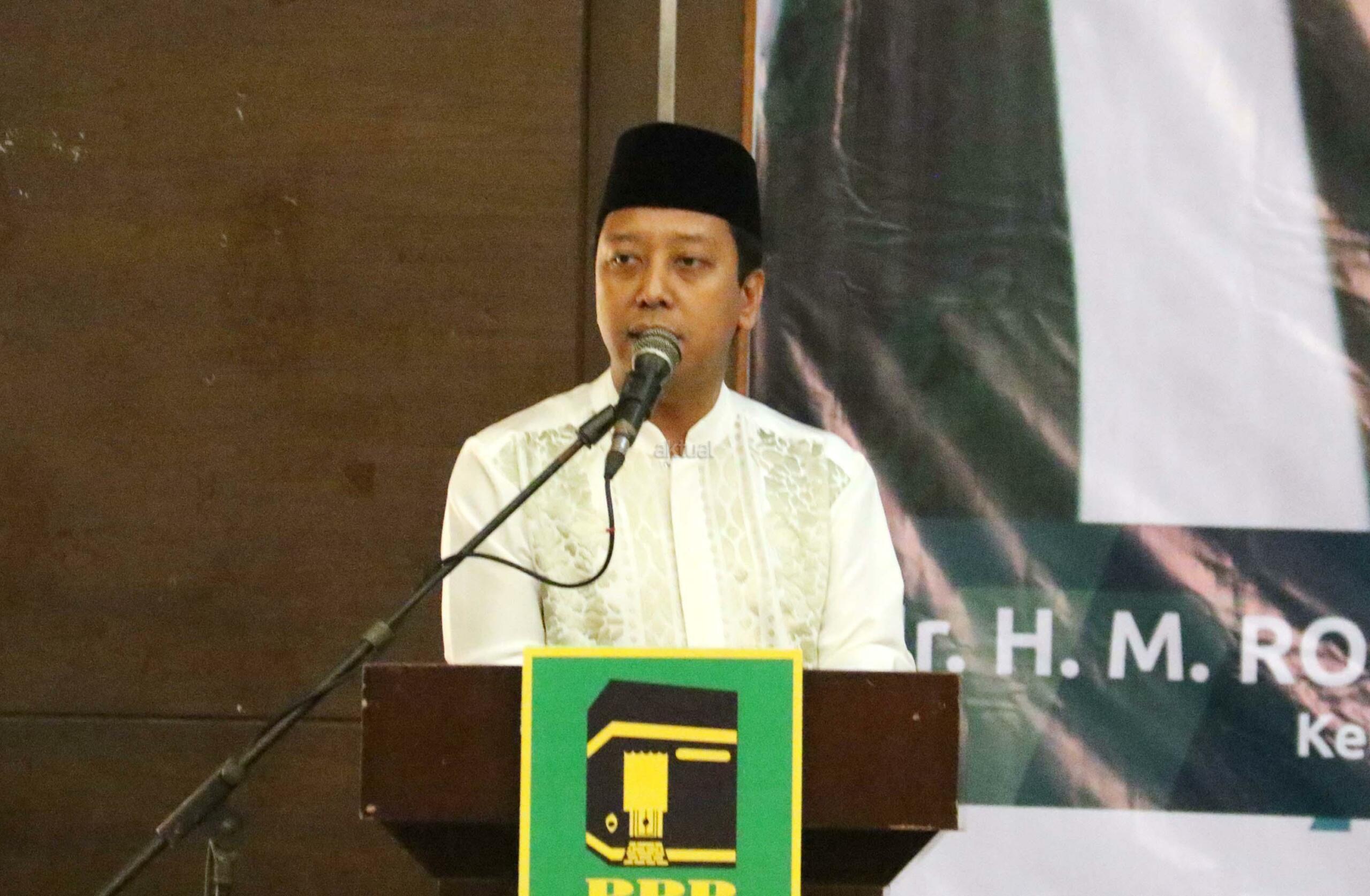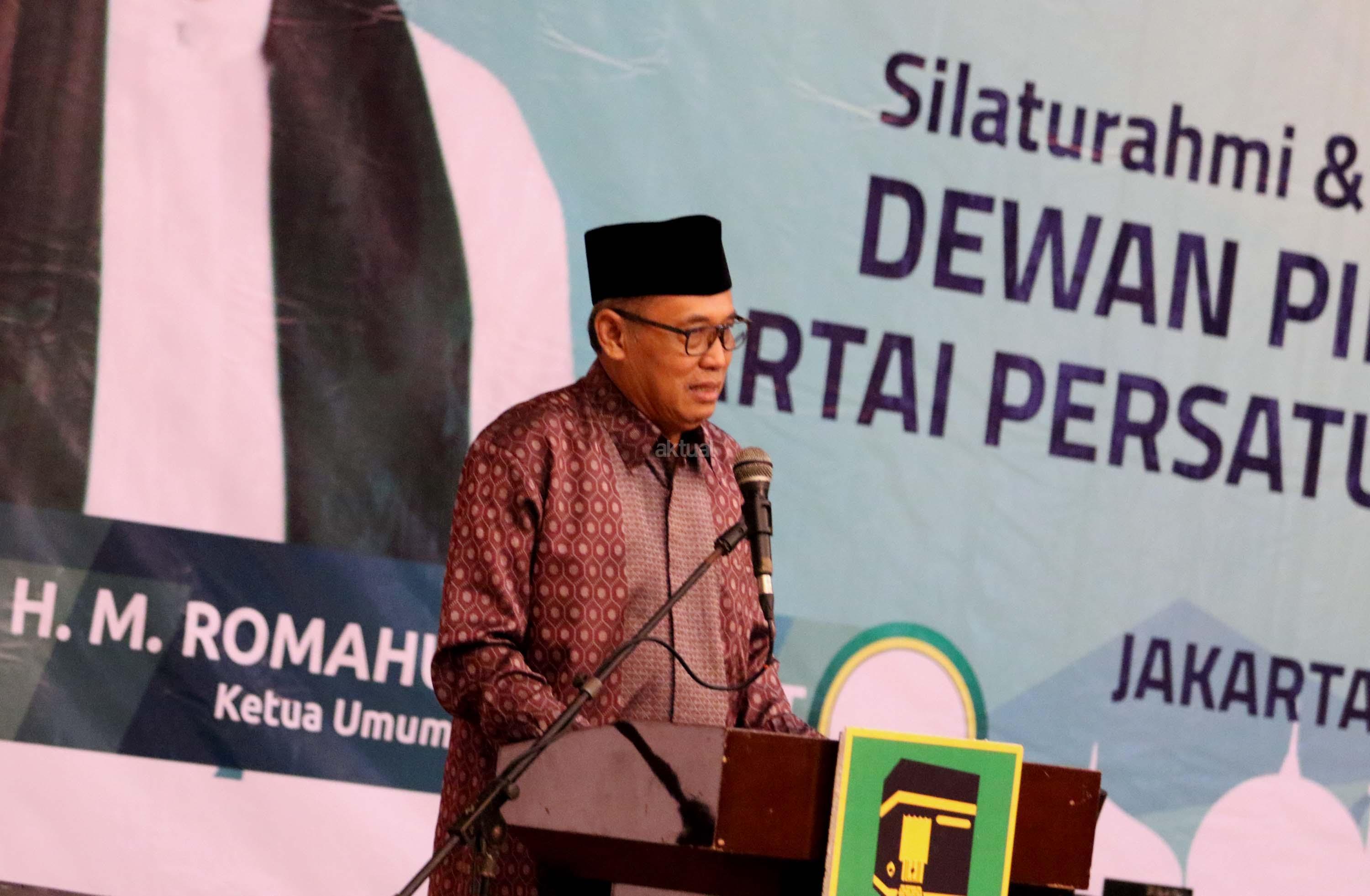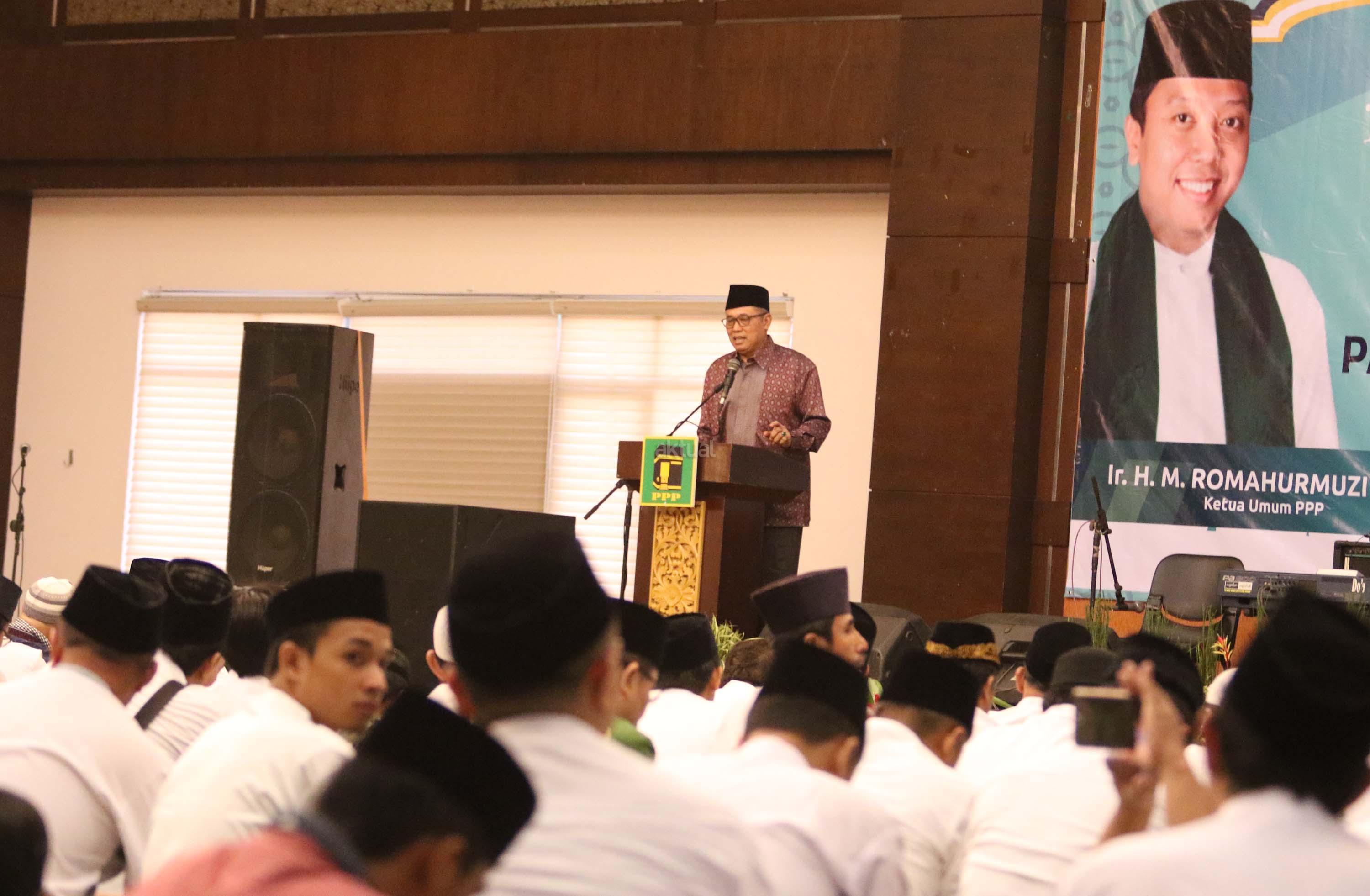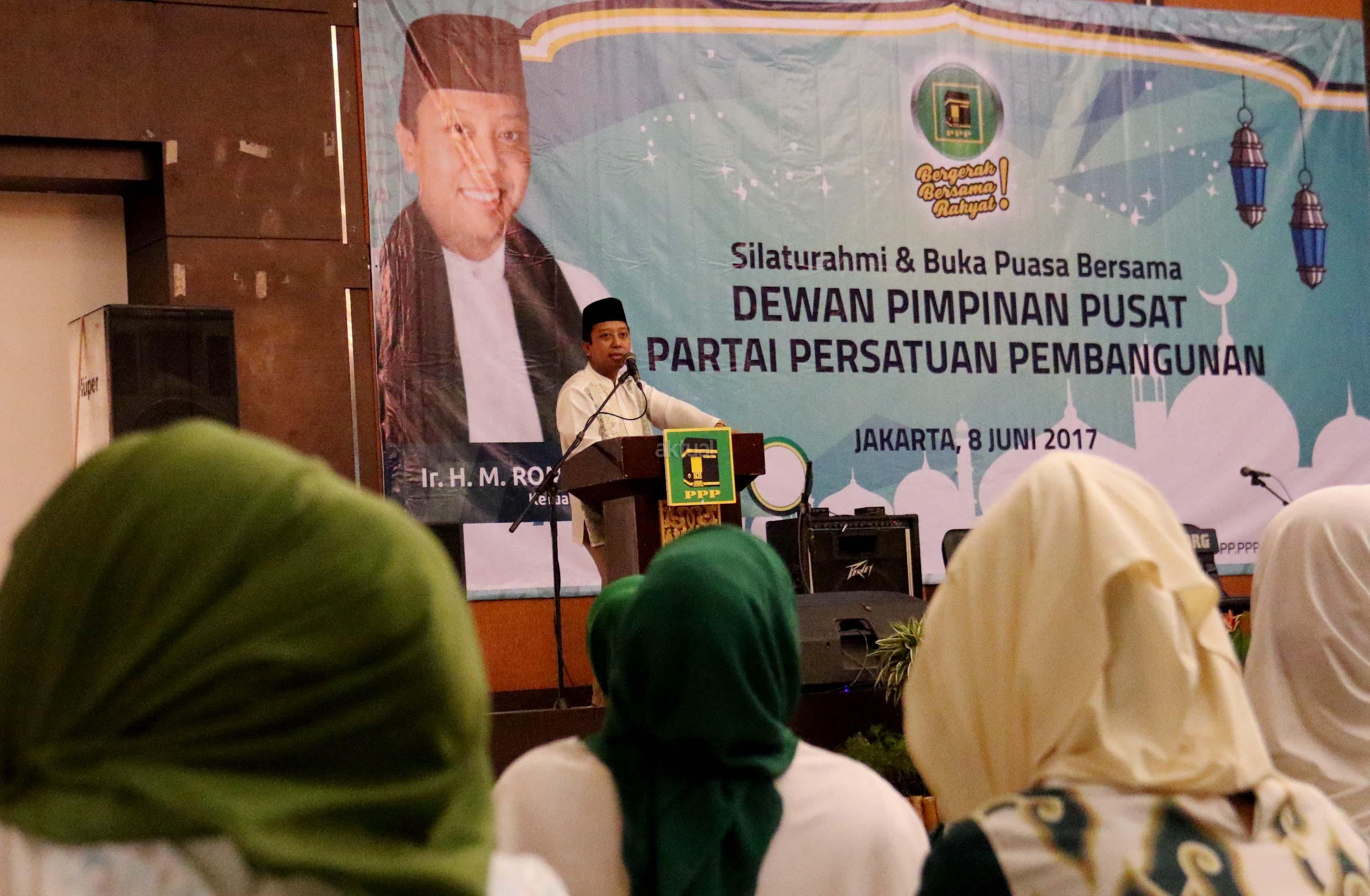 Ketua Umum PPP Romahurmuziy saat memberikan sambutannya dalam acara silaturahmi dan buka puasa bersama di komplek perumahan anggota DPR RI, Jakarta, Kamis (8/6/2017). Dalam acara silahturahmi dan buka bersama DPP PPP yang dihadirin ratusan kader PPP ini mengambil tema Terorisme akar, sebab dan perkembangannya”. AKTUAL/Munzir
