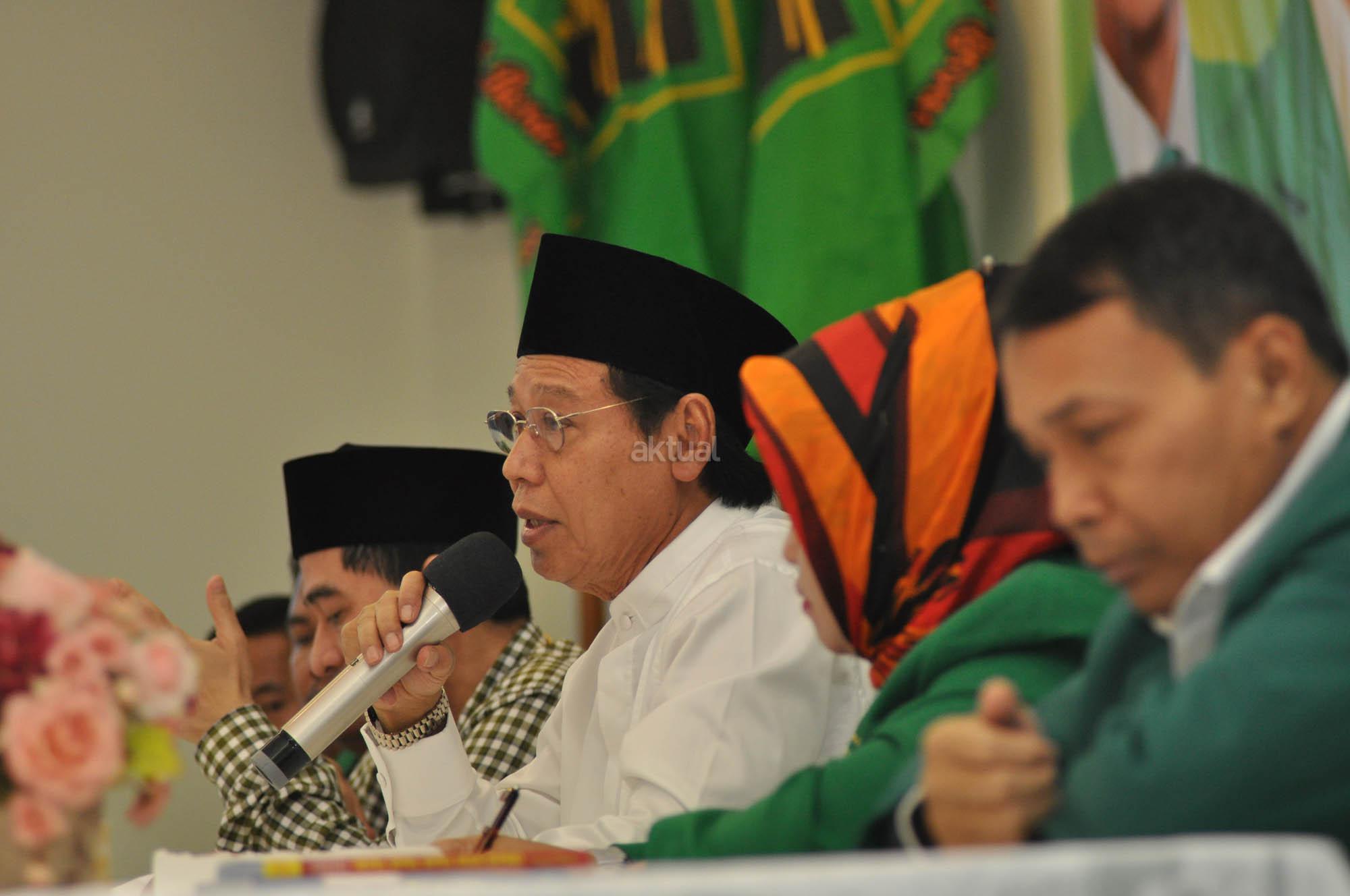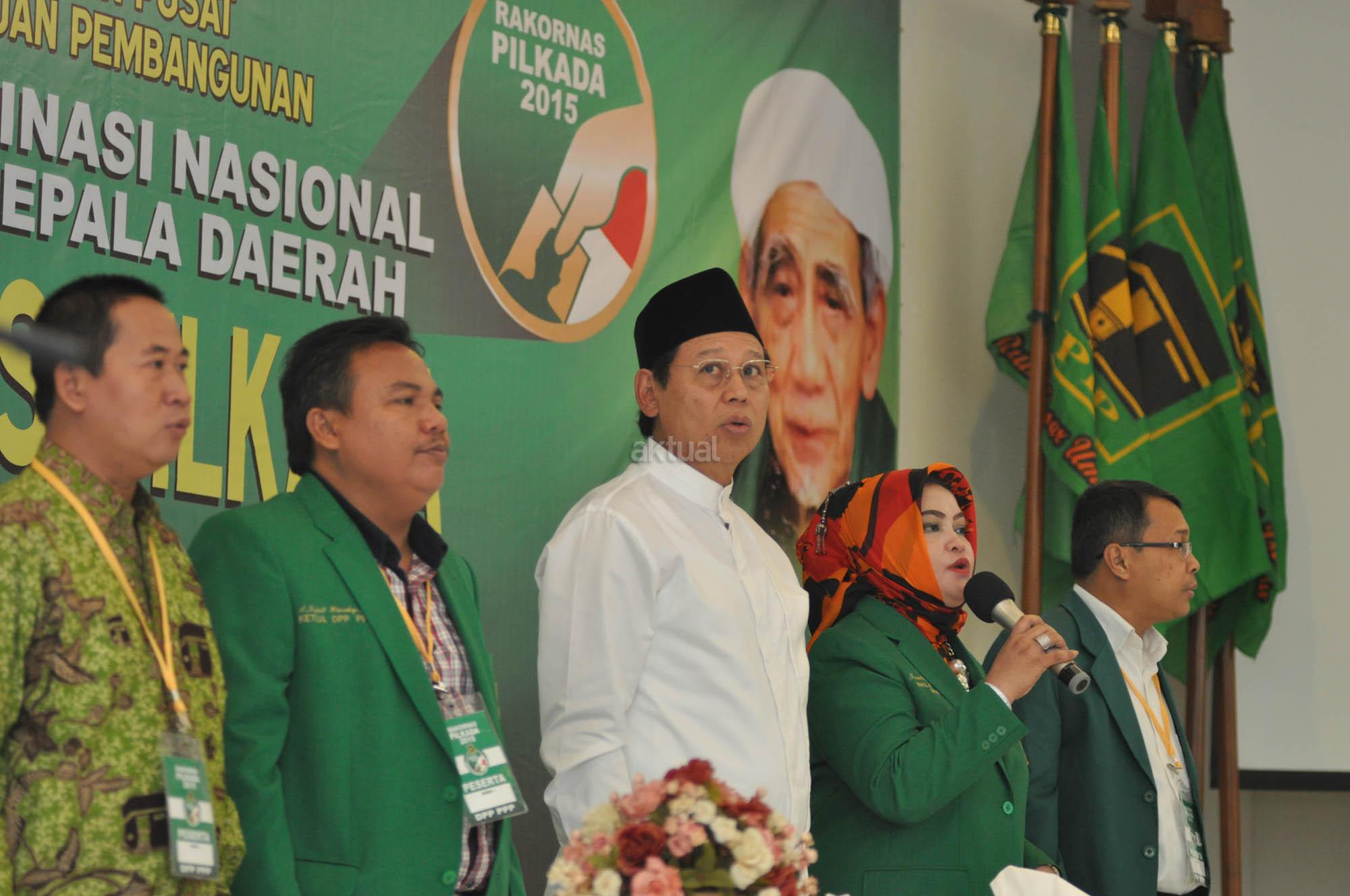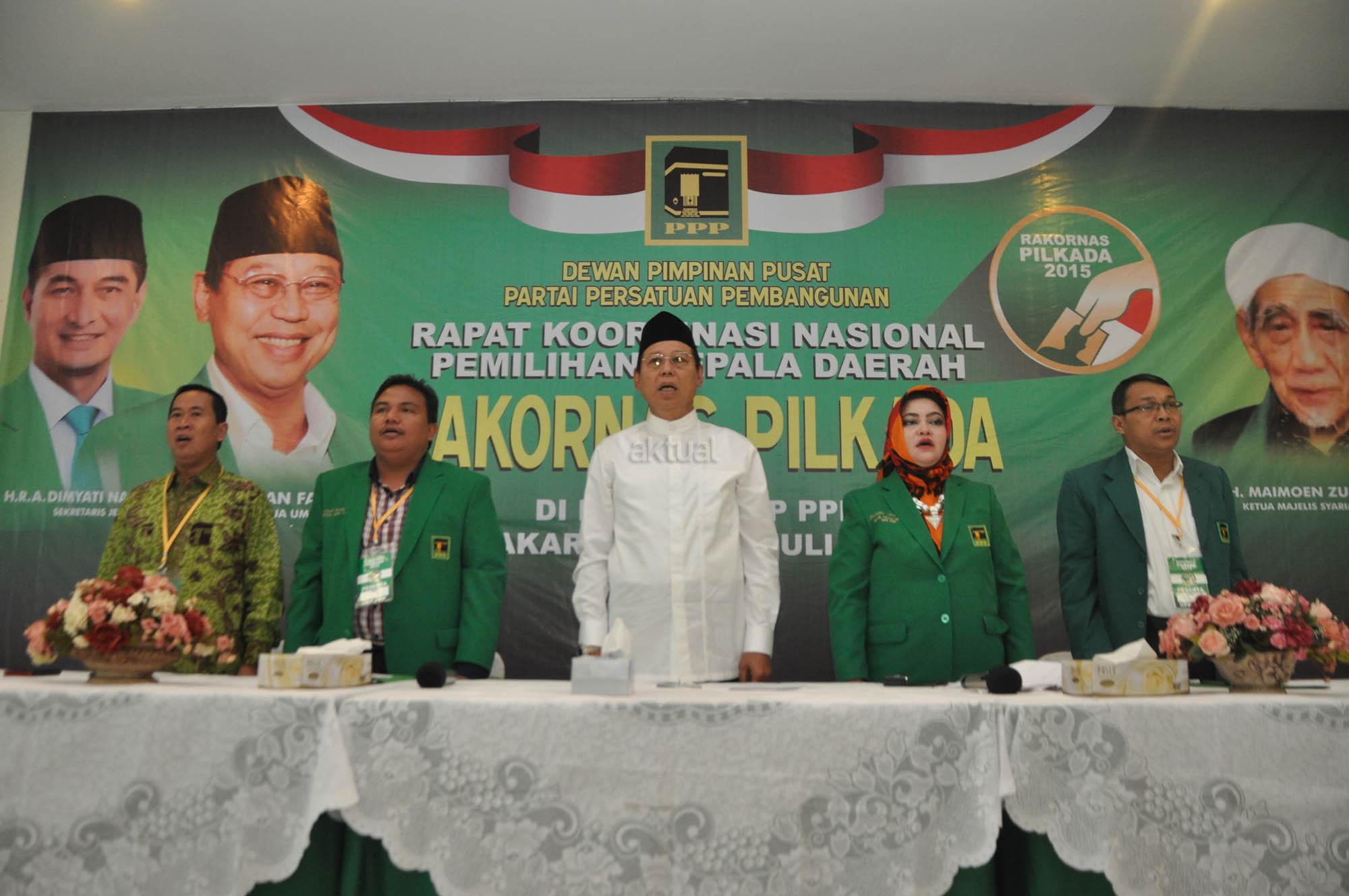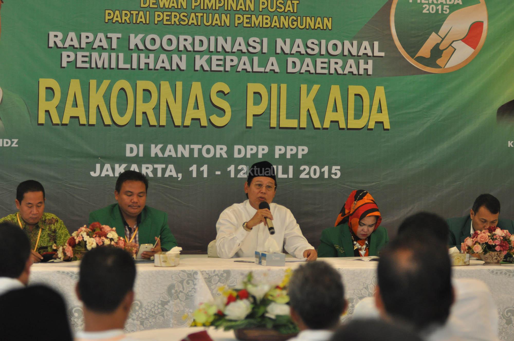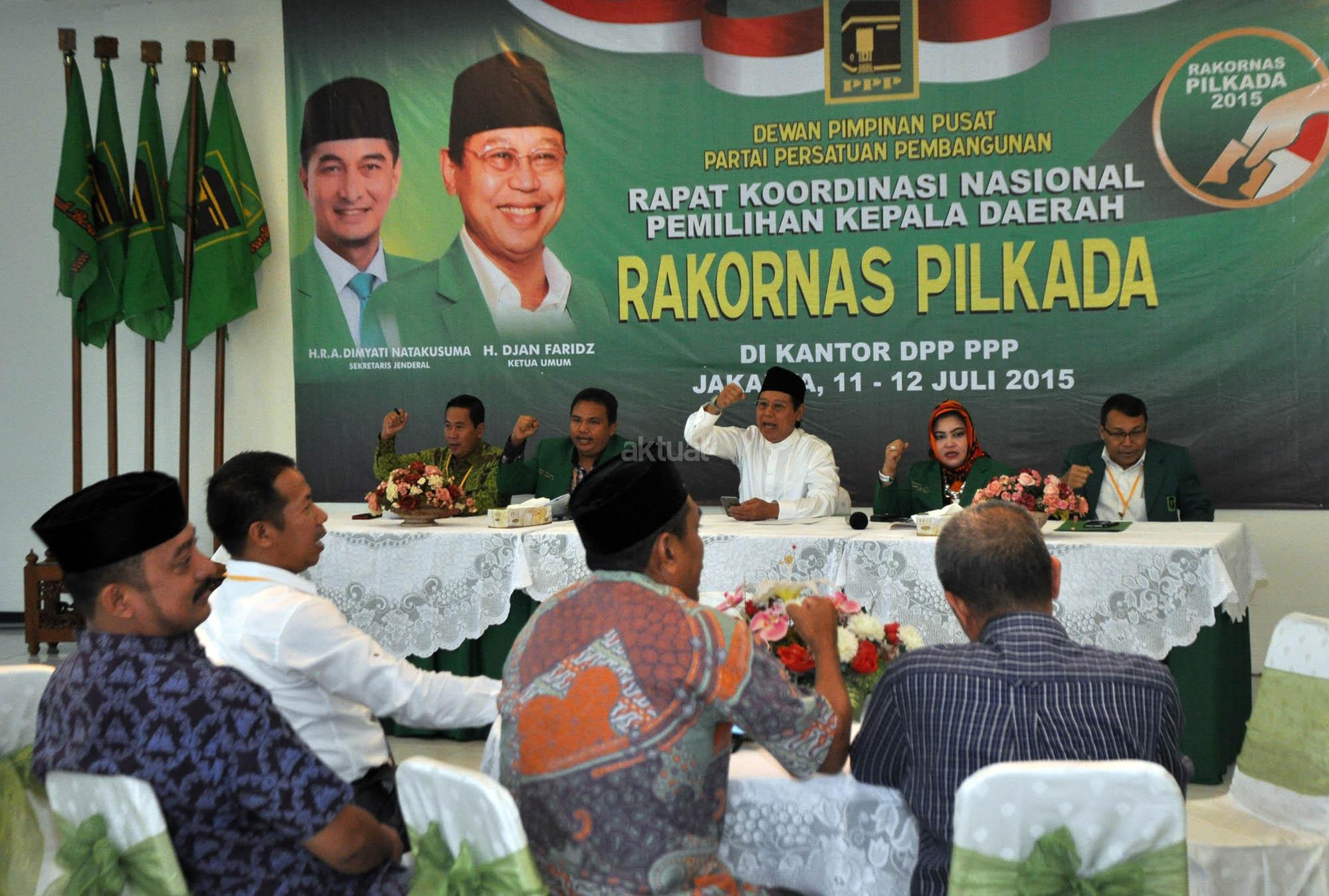 Ketua Umum Partai Persatuan Pembangunan (PPP) Djan Faridz memberikan sambutan sekaligus membuka acara Rakornas Pilkada di Kantpr DPP PPP Jl Diponogoro, Menteng, Jakarta, Sabtu (1/7/2015). Rakornas ini merupakan seleksi tahap awal melalui proses penjaringan yang diikuti lima puluh calon walikota dan bupati di beberapa wilayah di Indonesia.