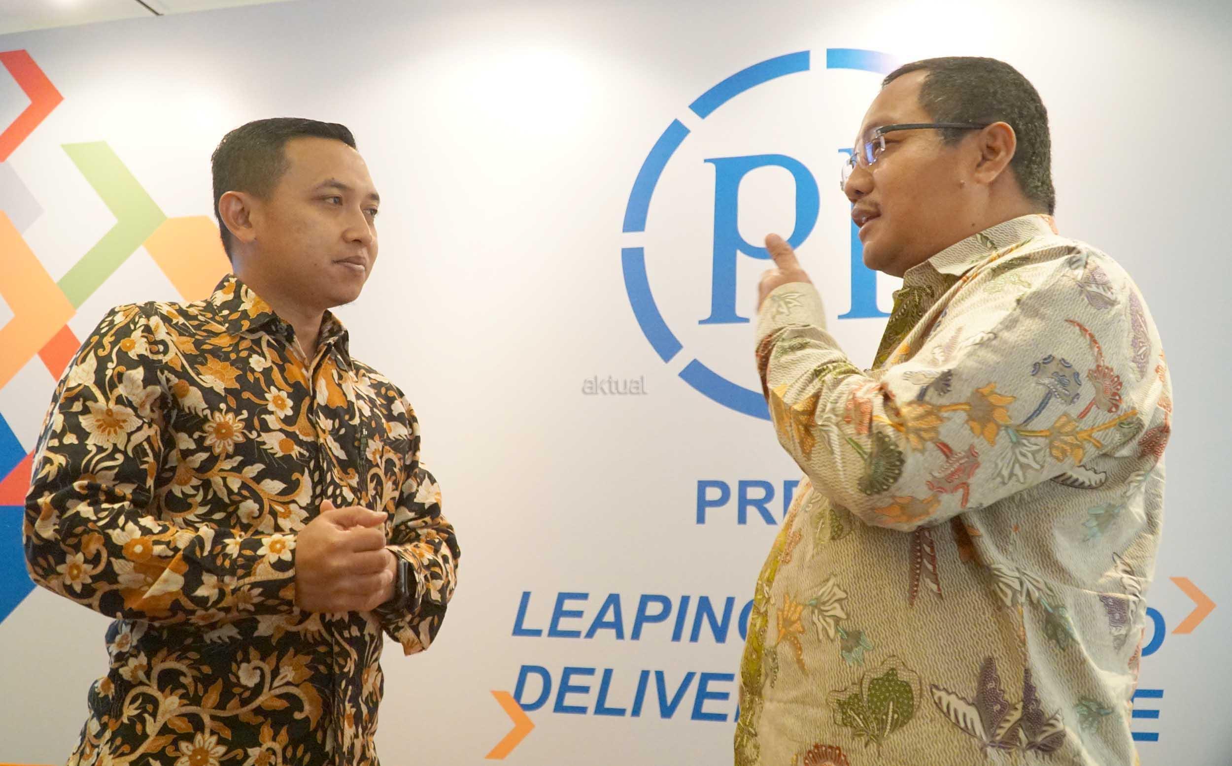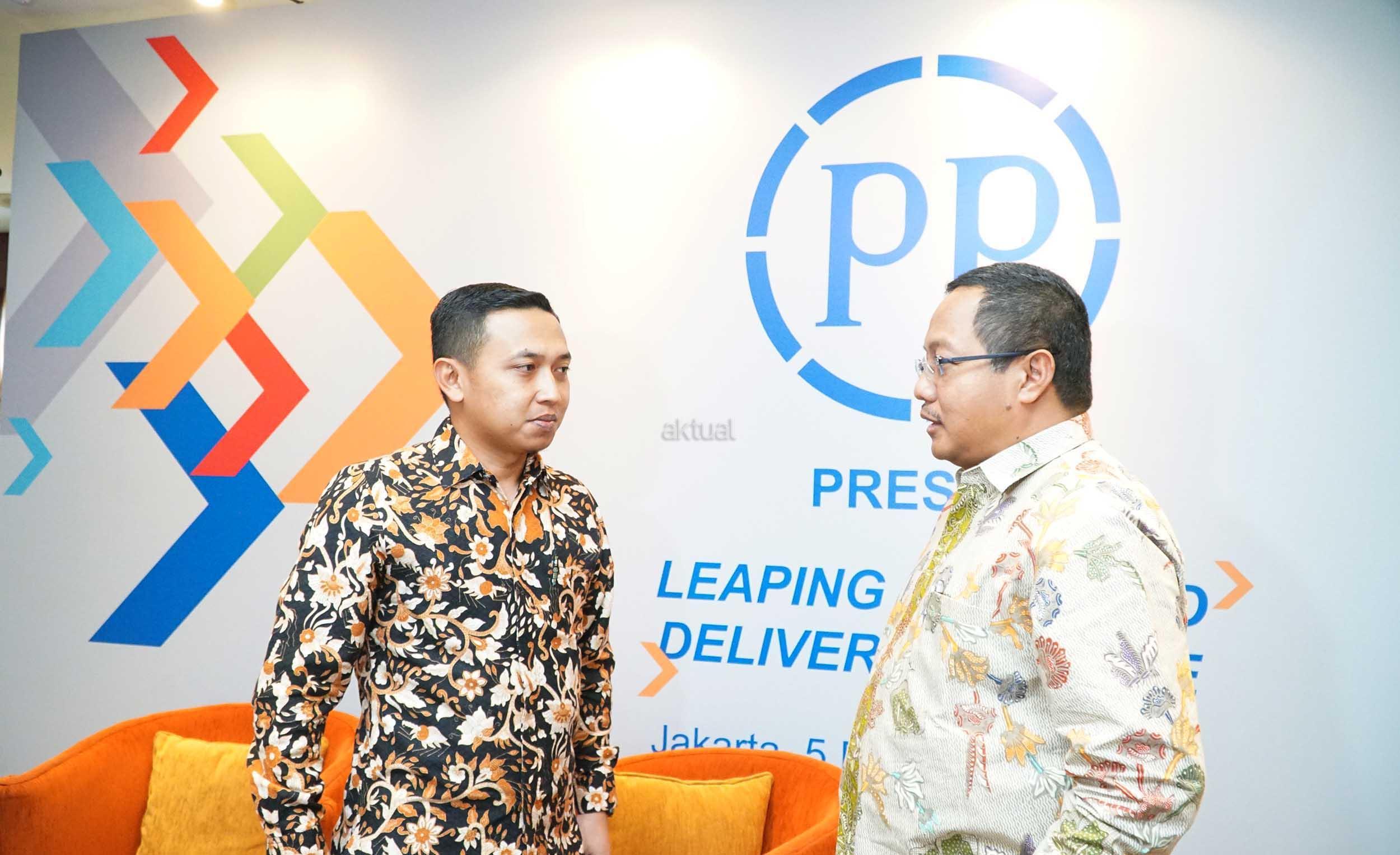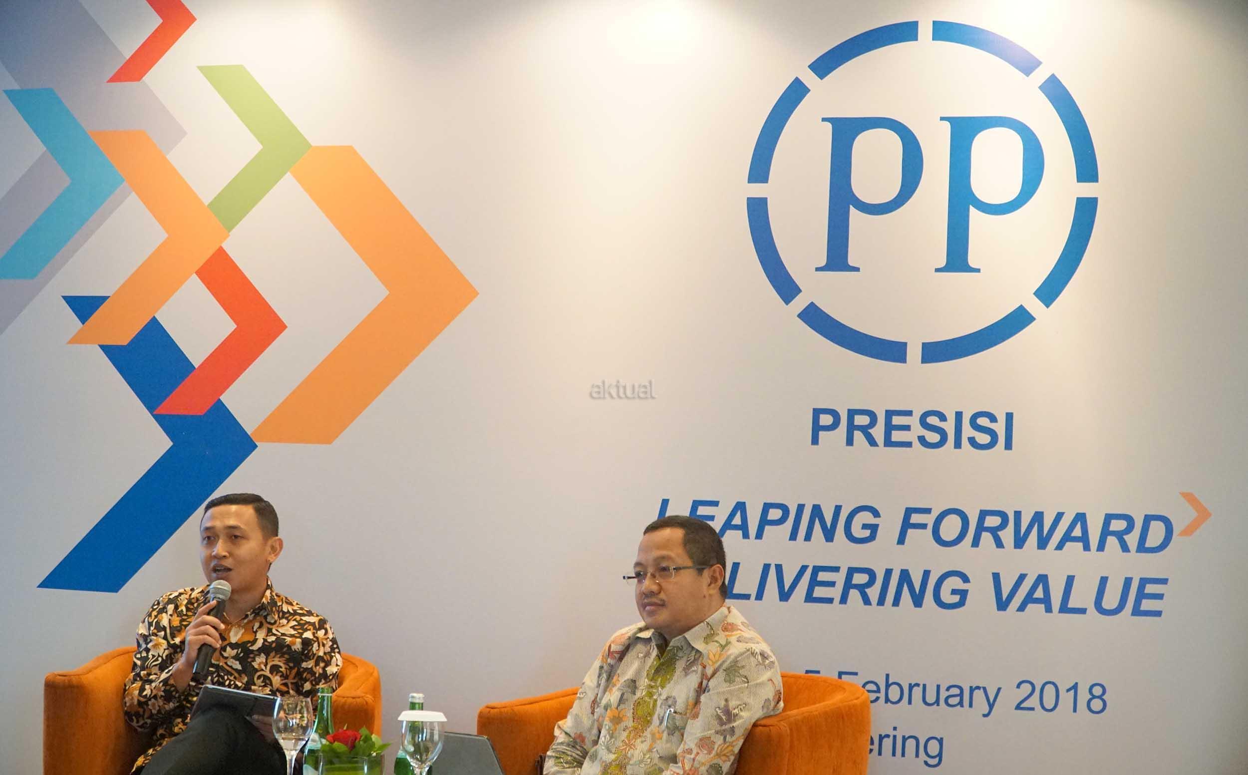 Direktur utama PT Presisi Tbk, Iswanto Amperawan (kanan) berbincang dengan Direktur Keuangan, Benny Pidakso disela media gathering di Jakarta, Senin (5/2). PT PP Presisi Tbk (PPRE), perusahaan konstruksi terintegrasi berbasis alat berat terkemuka di Indonesia, mengestimasikan pendapatan konsolidasian untuk periode yang berakhir pada tanggal 31 Desember 2017 meningkat 389% menjadi sebesar Rp1,8 triliun. Dari total pendaparan PPRE itu,pendapatan civil work memberi kontribusi sebesar 78%.Pendapatan di segmen ini meroket 1.051% menjadi Rp 1,4 triliun pada tahun 2017 dibandingkan tahun sebelumnya sebesar Rp 122,7 miliar. Sementara itu, laba bersih tahun berjalan, PPRE sepanjang tahun 2017 diestimasikan sebesar Rp 240 miliar atau melonjak sebesar 490% dibandingkan raihan pada tahun sebelumnya Rp 41 miliar.Sedangkan EBITDA perusahaan pada tahun lalu mencapai Rp 575 miliar atau naik 317% secara year on year. dan arus kas yang diperoleh dari operasi diestimasikan surplus sebesar Rp 240 miliar. AKTUAL/Eko S Hilman
