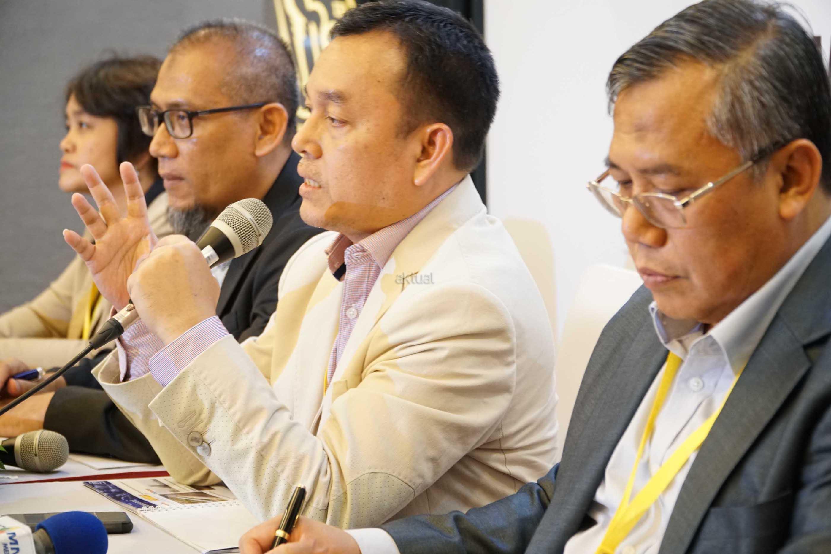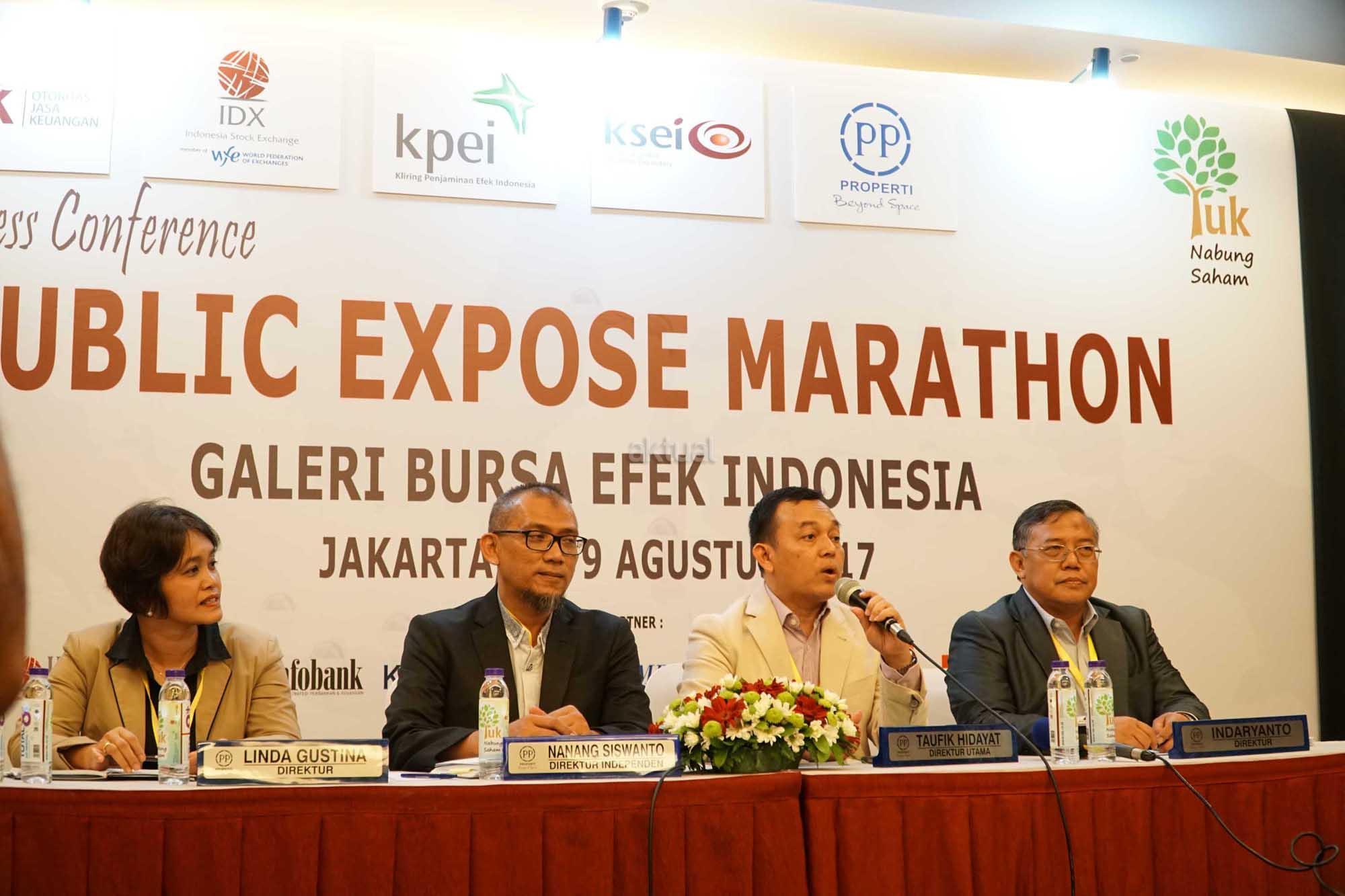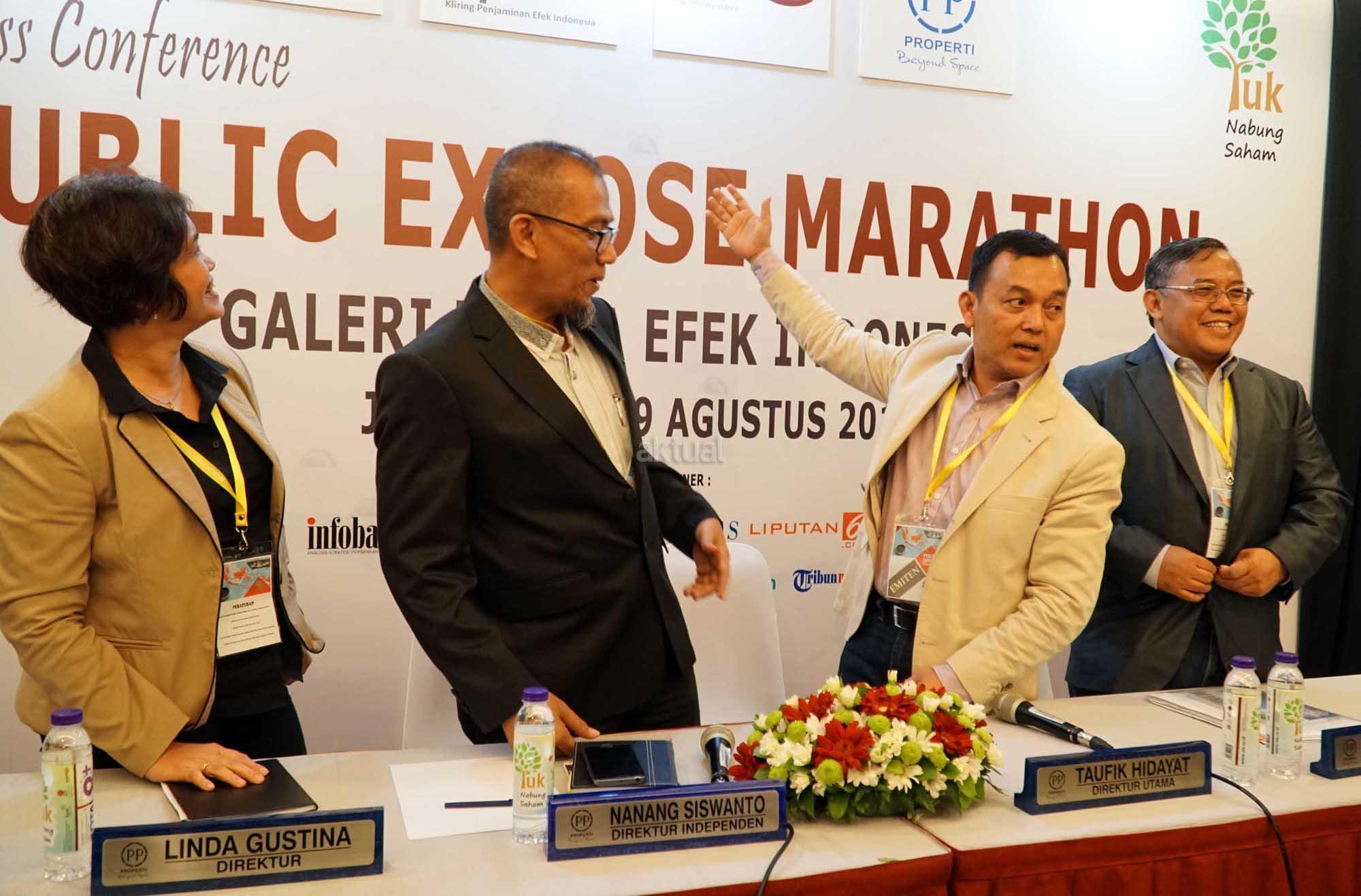 (dari kiri ke kanan) Direktur PT PP Properti Tbk (PPRO), Linda Gustina, Direktur Independen,Nanang Siswanto, Direktur Utama, Taufik Hidayat, Direktur, Indaryanto berbincang sesaat sebelum paparan publik di Jakarta, Selasa (8/8).Pengembang properti terkemuka di Tanah Air PT PP Properti Tbk. (kode saham: PPRO) sukses meraih marketing sales Rp1,97 triliun sepanjang Januari-Juli 2017, atau meningkat pesat sebesar 87% dari periode yang saham tahun lalu Rp1,05 triliun.melonjaknya marketing sales perseroan merupakan bukti bahwa produk-produk yang ditawarkan PPRO diterima dengan sangat baik oleh konsumen Berkat hasil positif marketing sales tersebut, pendapatan PPRO selama Januari-Juli 2017 naik 28% menjadi Rp1,32 triliun dari periode yang sama tahun lalu Rp1,04 triliun. Sementara laba bersih juga meningkat 25% dari Rp160 miliar menjadi Rp200 miliar. Pada tahun ini, perseroan menetapkan sejumlah target kinerja. Marketing sales PPRO dipatok naik 24% menjadi Rp3,1 triliun dari Rp2,5 triliun pada tahun lalu. Perseroan juga menargetkan penjualan naik 19% menjadi Rp2,5 triliun sementara laba bersih naik 20% menjadi Rp438 miliar. Kenaikan ini ditopang oleh rencana ekspansi perseroan untuk mengembangkan sejumlah proyek baru dan gencar melakukan akuisisi lahan. Untuk akuisisi lahan, PPRO menargetkan dapat memiliki cadangan lahan 280 hektare pada tahun ini, atau melonjak lebih dari 3 kali lipat dibandingkan tahun 2016 seluas 70 hektare. Dengan rencana ekspansi itu, PPRO memperkirakan pertumbuhan aset mencapai 48% menjadi Rp13,1 triliun pada tahun ini dari Rp8,8 triliun pada tahun lalu, sementara ekuitas melonjak 100% menjadi Rp5,8 triliun dari Rp2,9 triliun. AKTUAL/Eko S Hilman