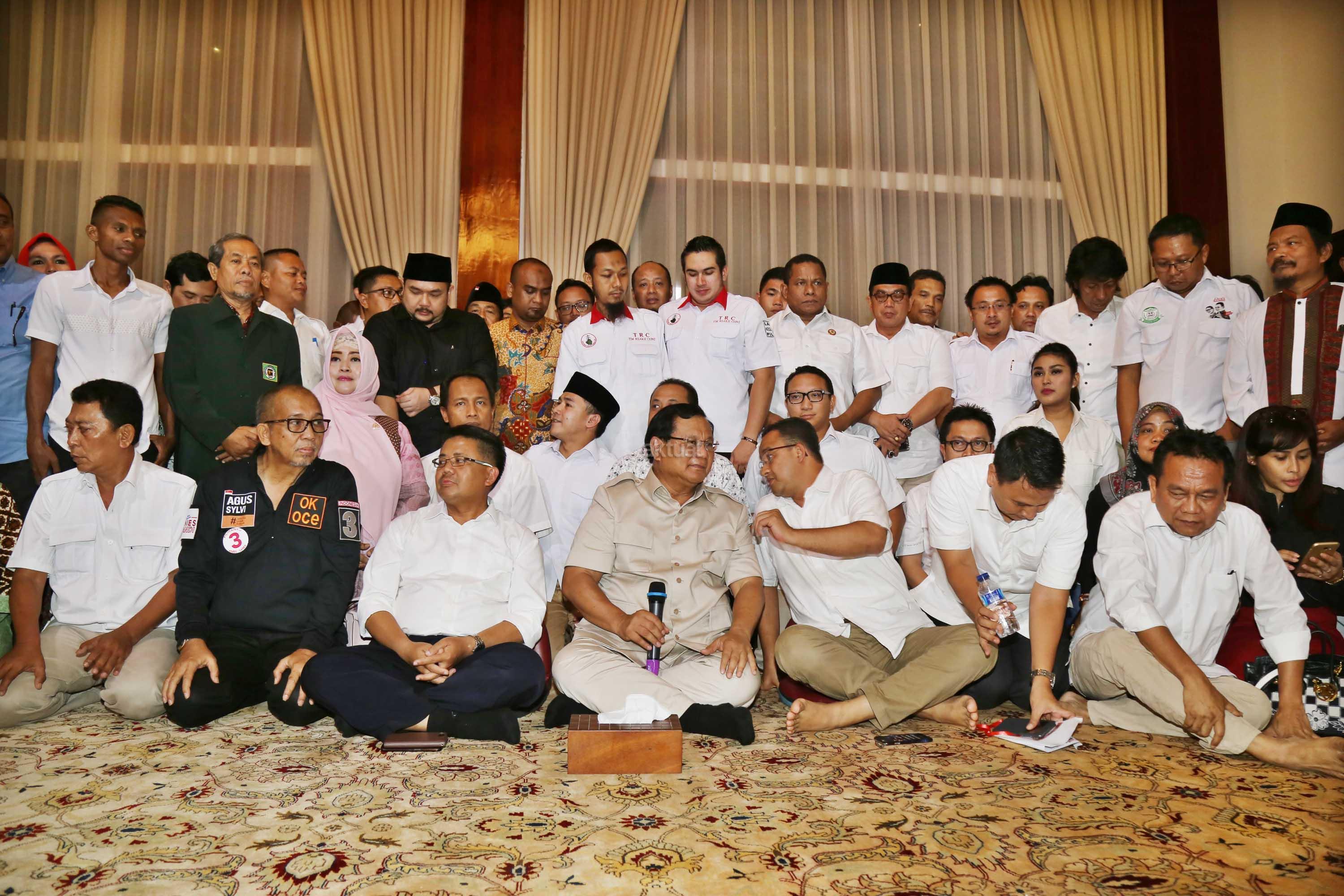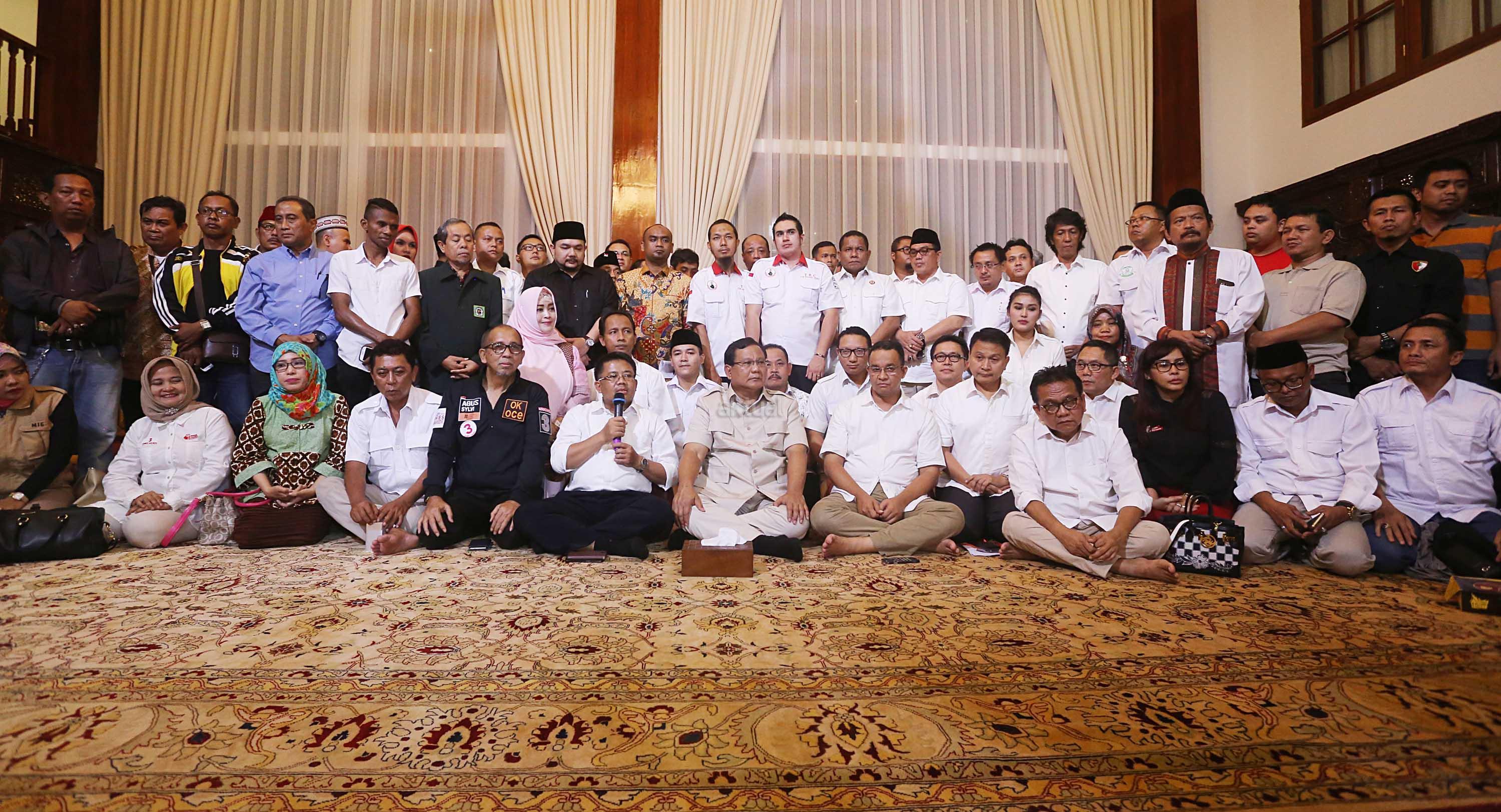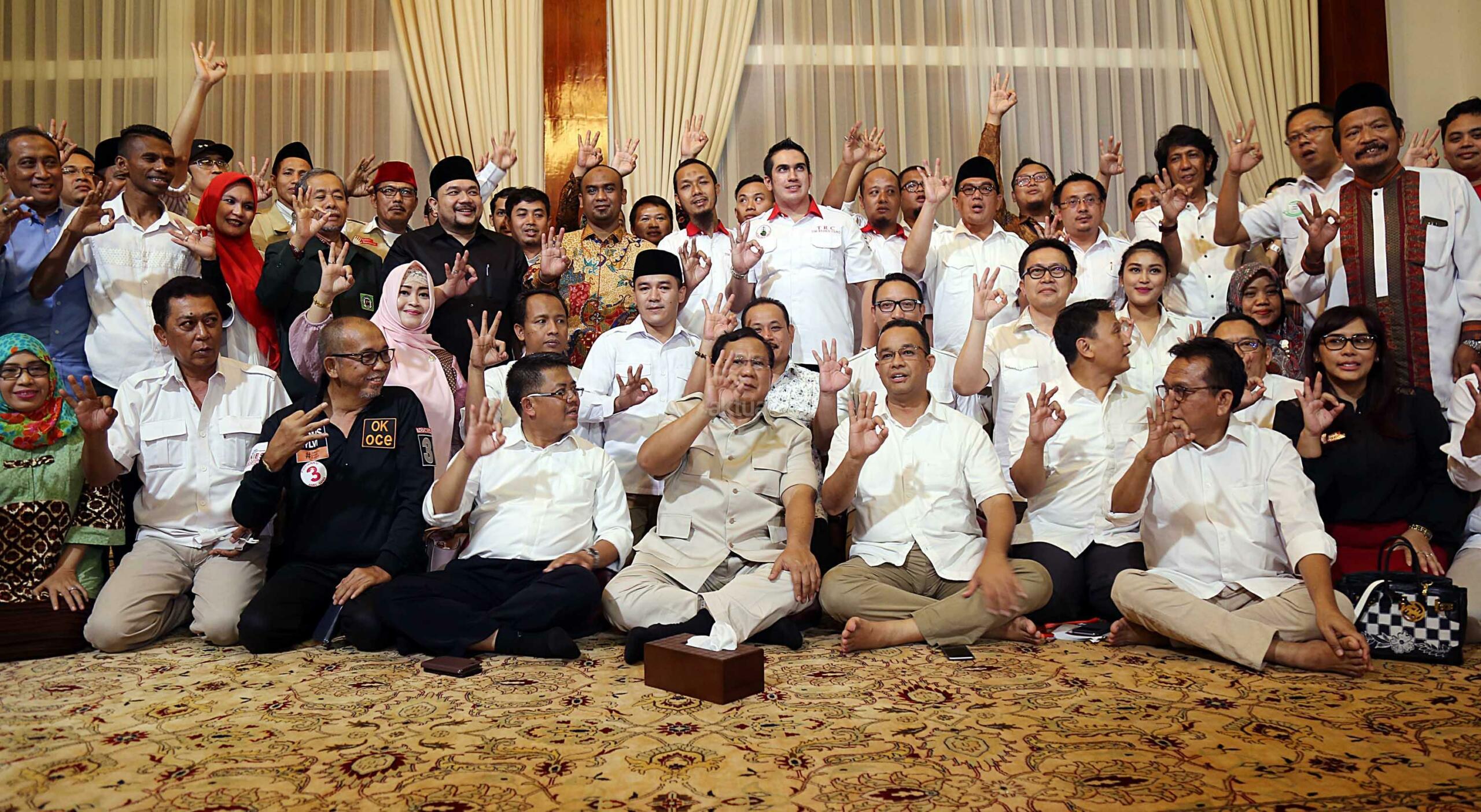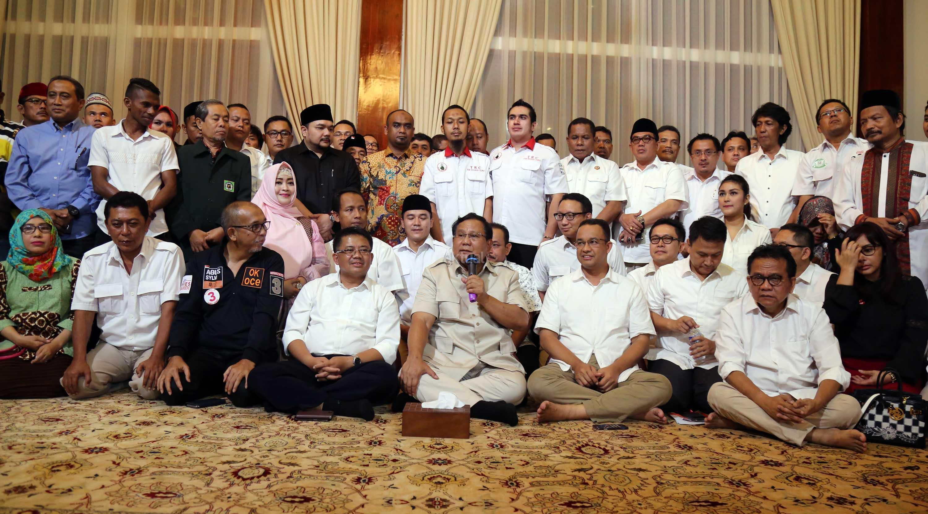 Ketua Umum Partai Gerindra Prabowo Subianto didampingi Calon Gubernur DKI Jakarta Anies Baswedan beserta tim pemenangan Cagub-cawagub Anies-Sandi usai menggelar pertemuan terakhir konsolidasi sebelum memasuki masa tenang Pilgub DKI Jakarta di Kediaman Prabowo, Jalan Kertanegara, Jakarta Selatan, Sabtu (15/4) malam. Prabowo kembali menyebut warga Jakarta menghendaki Anies Rasyid Baswedan dan Sandiaga Salahuddin Uno memenangi pesta demokrasi itu. Prabowo juga berharap penyelenggaraan Pilgub DKI nanti berjalan dengan damai. Dia ingin kesejahteraan dan perdamaian baru terwujud bagi warga Ibu Kota. AKTUAL/Tino Oktaviano