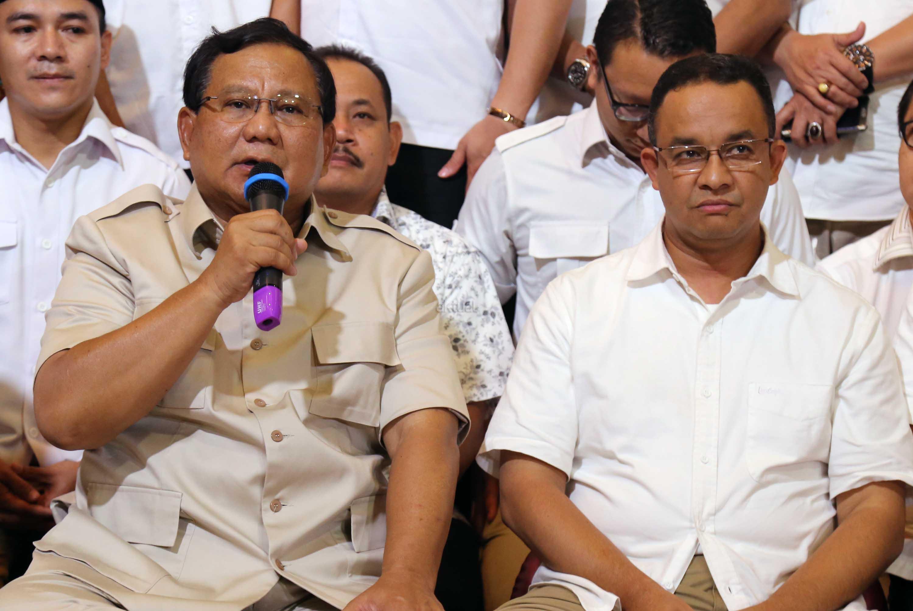Ketua Umum Partai Gerindra Prabowo Subianto didampingi Calon Gubernur DKI Jakarta Anies Baswedan dan Ketua Tim Pemenangan Anies-Sandi, Mardani Ali Sera beserta tim pemenangan Cagub-cawagub Anies-Sandi usai menggelar pertemuan terakhir konsolidasi sebelum memasuki masa tenang Pilgub DKI Jakarta di Kediaman Prabowo, Jalan Kertanegara, Jakarta Selatan, Sabtu (15/4) malam. Prabowo kembali menyebut warga Jakarta menghendaki Anies Rasyid Baswedan dan Sandiaga Salahuddin Uno memenangi pesta demokrasi itu. Prabowo juga berharap penyelenggaraan Pilgub DKI nanti berjalan dengan damai. Dia ingin kesejahteraan dan perdamaian baru terwujud bagi warga Ibu Kota. AKTUAL/Tino Oktaviano