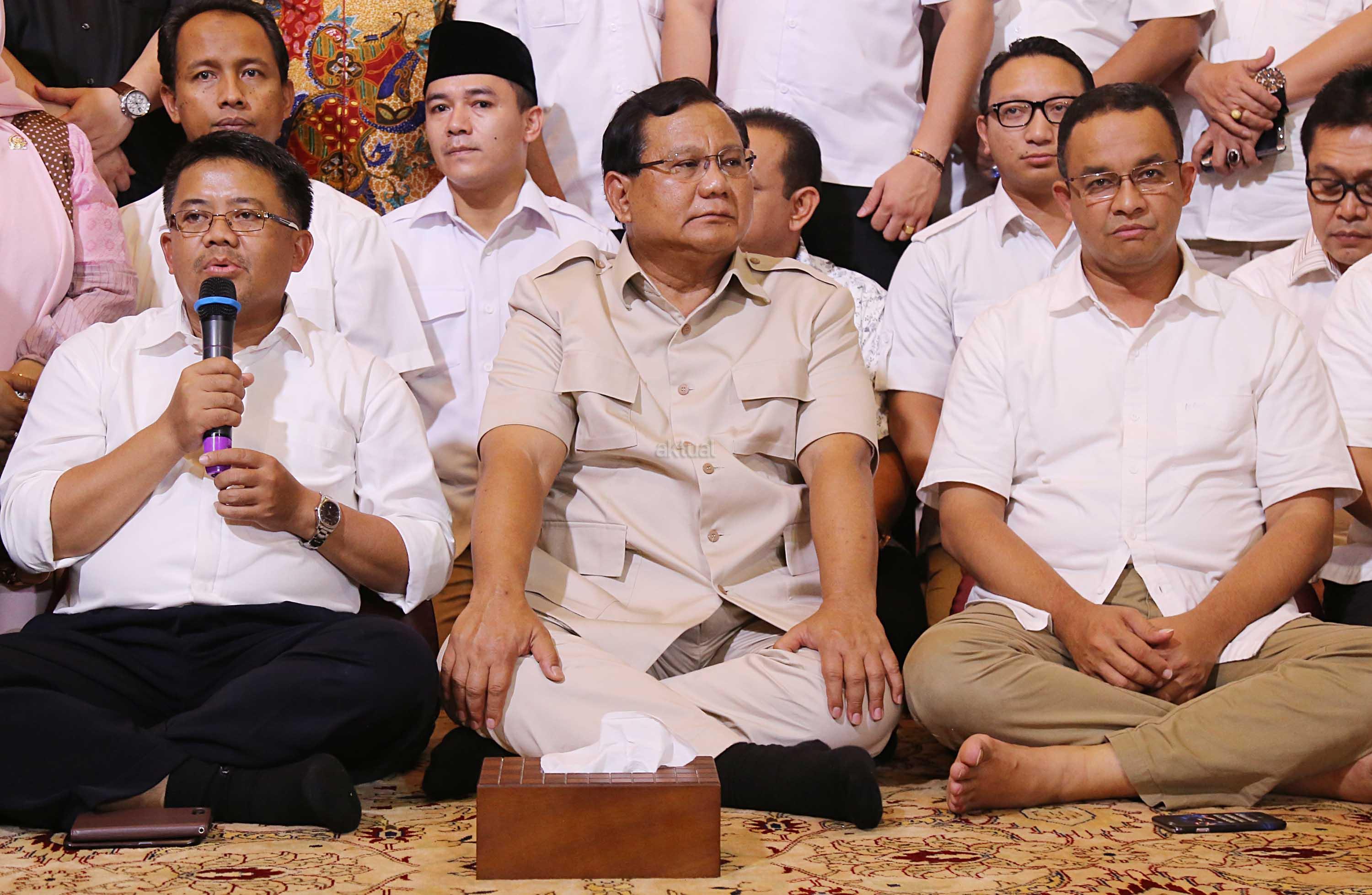 Ketua Umum Partai Gerindra Prabowo Subianto didampingi Presiden Partai Keadilan Sejahtera Sohibul Iman dan Calon Gubernur DKI Jakarta Anies Baswedan beserta tim pemenangan Cagub-cawagub Anies-Sandi usai menggelar pertemuan terakhir konsolidasi sebelum memasuki masa tenang Pilgub DKI Jakarta di Kediaman Prabowo, Jalan Kertanegara, Jakarta Selatan, Sabtu (15/4) malam. Prabowo kembali menyebut warga Jakarta menghendaki Anies Rasyid Baswedan dan Sandiaga Salahuddin Uno memenangi pesta demokrasi itu. Prabowo juga berharap penyelenggaraan Pilgub DKI nanti berjalan dengan damai. Dia ingin kesejahteraan dan perdamaian baru terwujud bagi warga Ibu Kota. AKTUAL/Tino Oktaviano