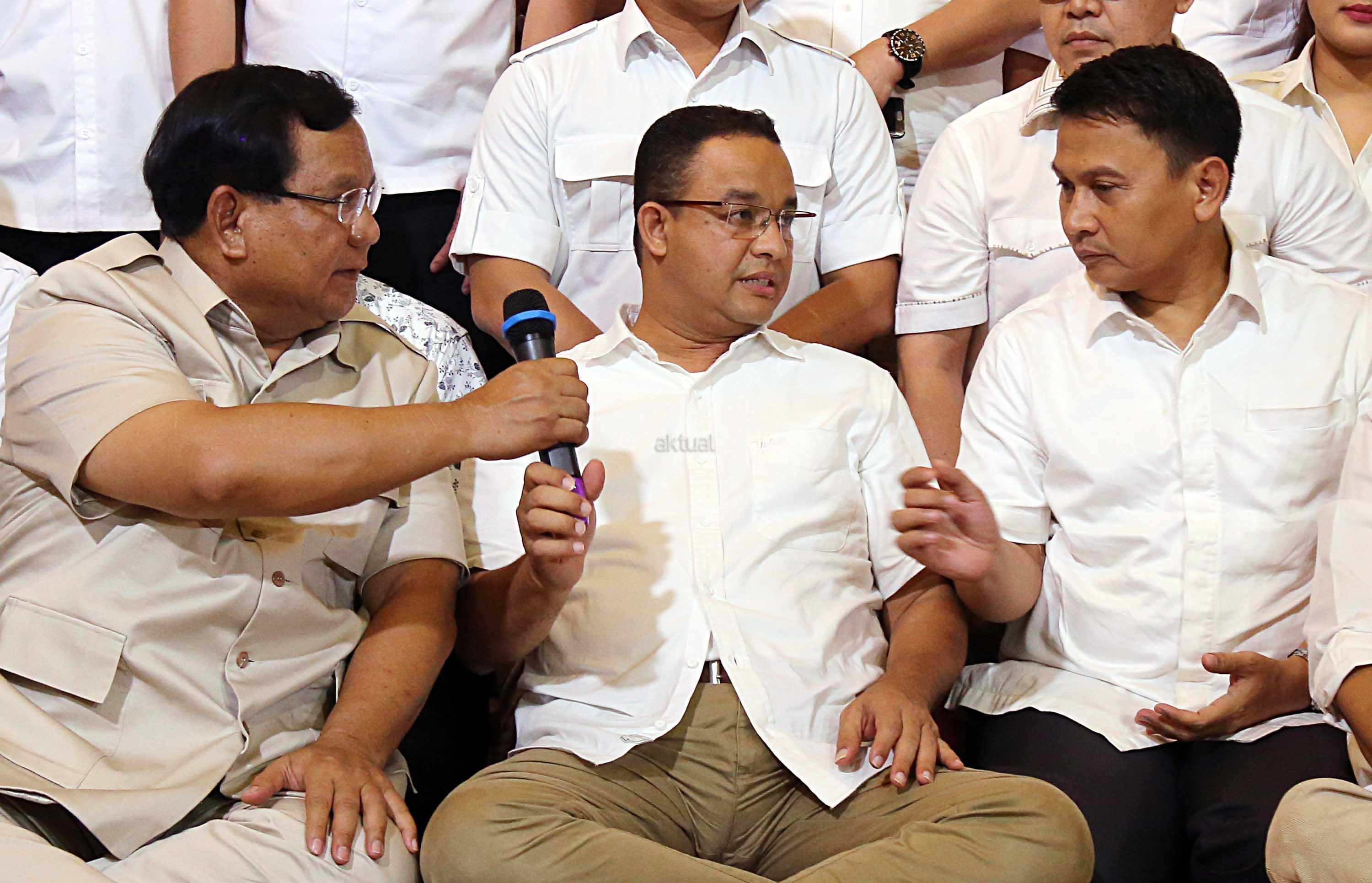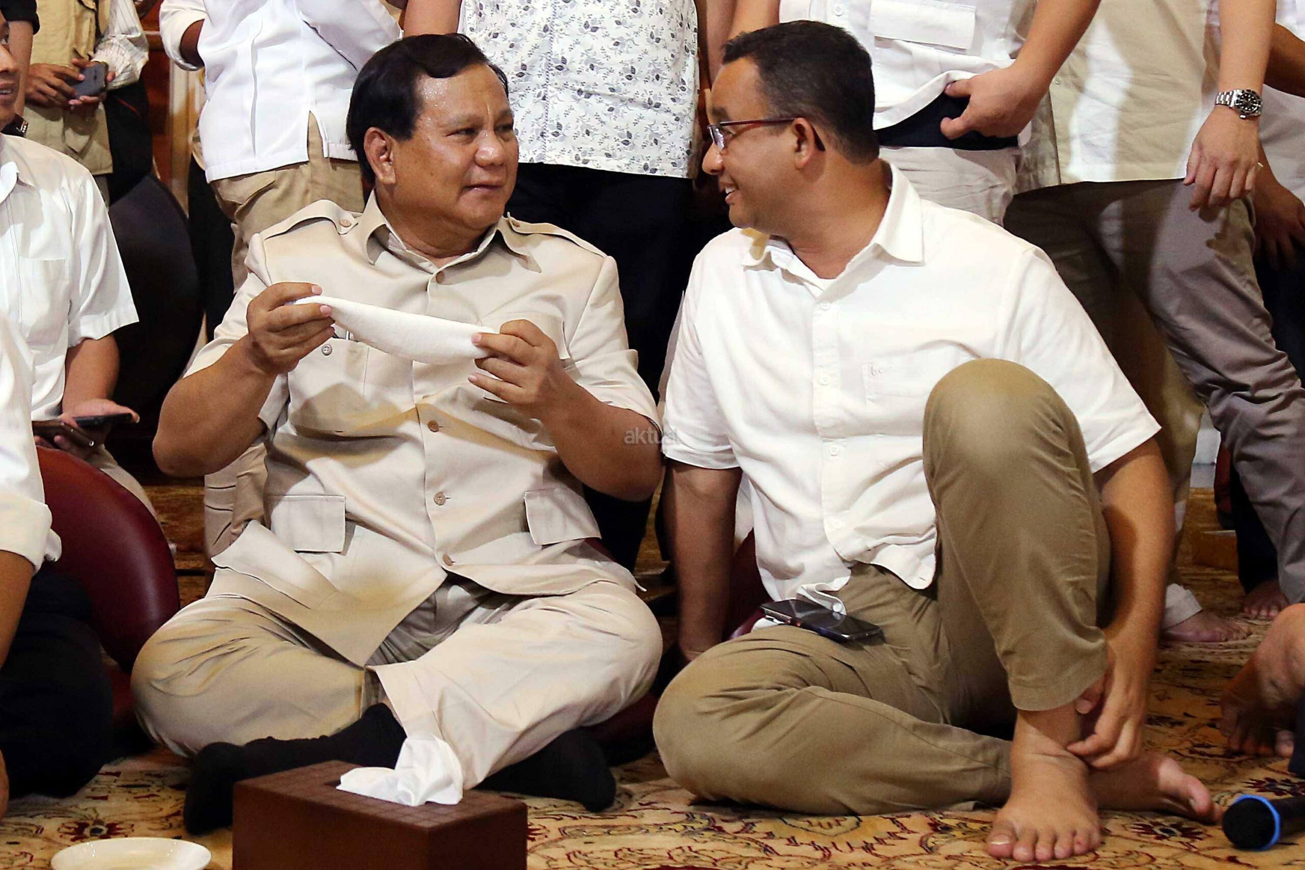 Ketua Umum Partai Gerindra Prabowo berbincang dengan Calon Gubernur DKI Jakarta Anies Baswedan saat pertemuan terakhir konsolidasi sebelum memasuki masa tenang Pilgub DKI Jakarta di Kediaman Prabowo, Jalan Kertanegara, Jakarta Selatan, Sabtu (15/4) malam. Prabowo kembali menyebut warga Jakarta menghendaki Anies Rasyid Baswedan dan Sandiaga Salahuddin Uno memenangi pesta demokrasi itu. Prabowo juga berharap penyelenggaraan Pilgub DKI nanti berjalan dengan damai. Dia ingin kesejahteraan dan perdamaian baru terwujud bagi warga Ibu Kota. AKTUAL/Tino Oktaviano
