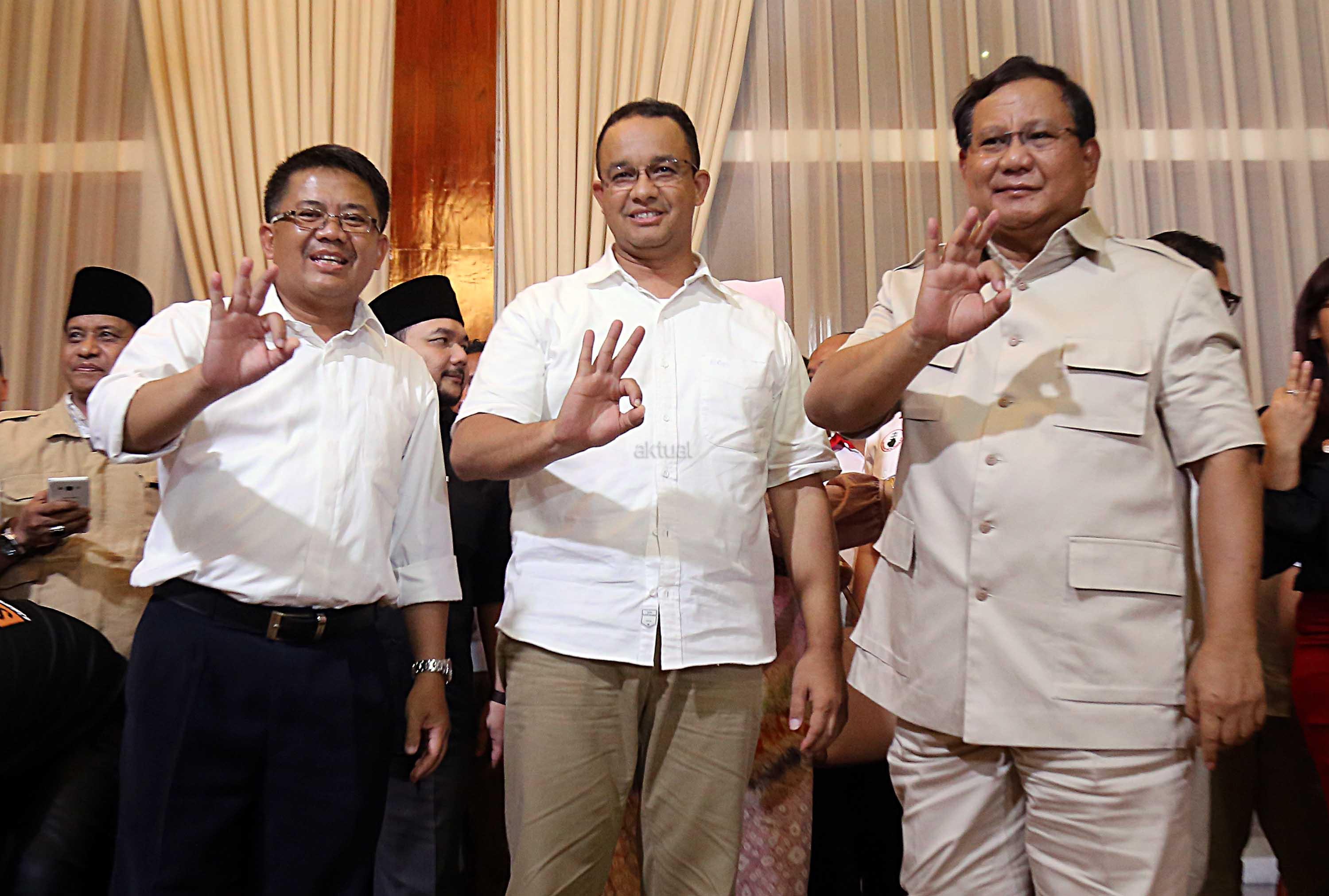 Ketua Umum Partai Gerindra Prabowo Subianto didampingi Presiden Partai Keadilan Sejahtera Sohibul Iman dan Calon Gubernur DKI Jakarta Anies Baswedan mengangkat tangan usai menggelar pertemuan terakhir konsolidasi sebelum memasuki masa tenang Pilgub DKI Jakarta di Kediaman Prabowo, Jalan Kertanegara, Jakarta Selatan, Sabtu (15/4) malam. Prabowo kembali menyebut warga Jakarta menghendaki Anies Rasyid Baswedan dan Sandiaga Salahuddin Uno memenangi pesta demokrasi itu. Prabowo juga berharap penyelenggaraan Pilgub DKI nanti berjalan dengan damai. Dia ingin kesejahteraan dan perdamaian baru terwujud bagi warga Ibu Kota. AKTUAL/Tino Oktaviano