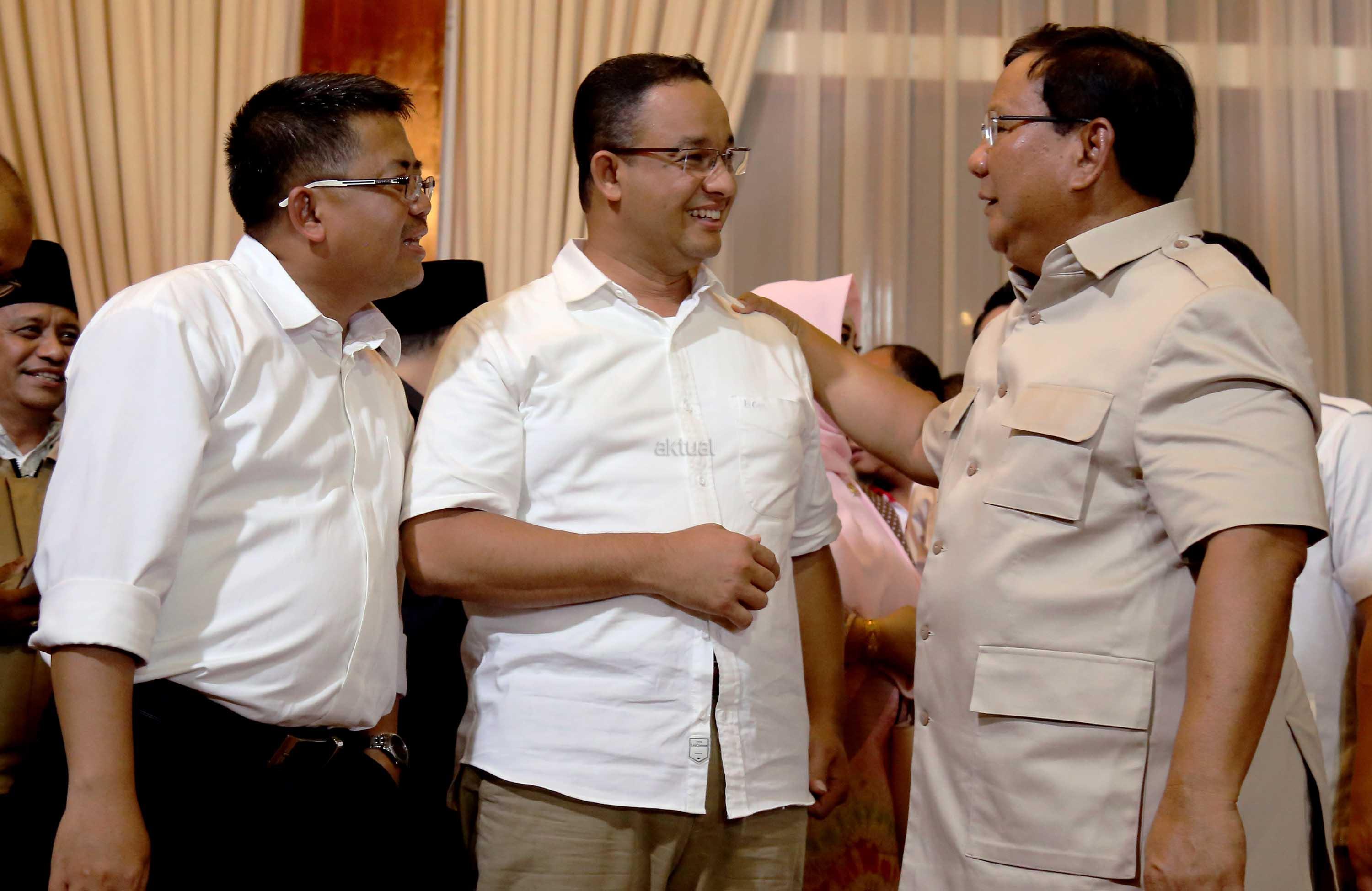 Ketua Umum Partai Gerindra Prabowo Subianto berbincang dengan Presiden Partai Keadilan Sejahtera Sohibul Iman dan Calon Gubernur DKI Jakarta Anies Baswedan usai menggelar pertemuan terakhir konsolidasi sebelum memasuki masa tenang Pilgub DKI Jakarta di Kediaman Prabowo, Jalan Kertanegara, Jakarta Selatan, Sabtu (15/4) malam. Prabowo kembali menyebut warga Jakarta menghendaki Anies Rasyid Baswedan dan Sandiaga Salahuddin Uno memenangi pesta demokrasi itu. Prabowo juga berharap penyelenggaraan Pilgub DKI nanti berjalan dengan damai. Dia ingin kesejahteraan dan perdamaian baru terwujud bagi warga Ibu Kota. AKTUAL/Tino Oktaviano