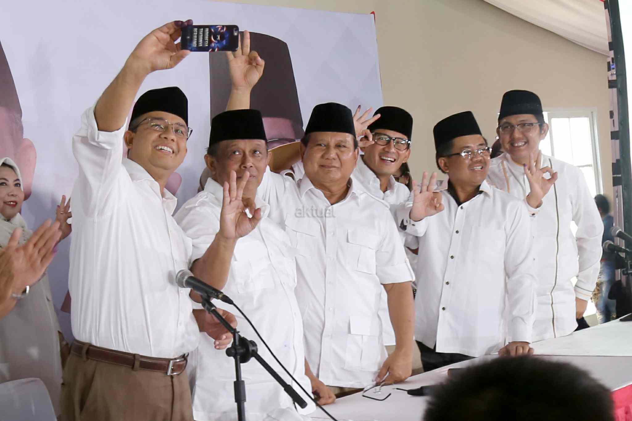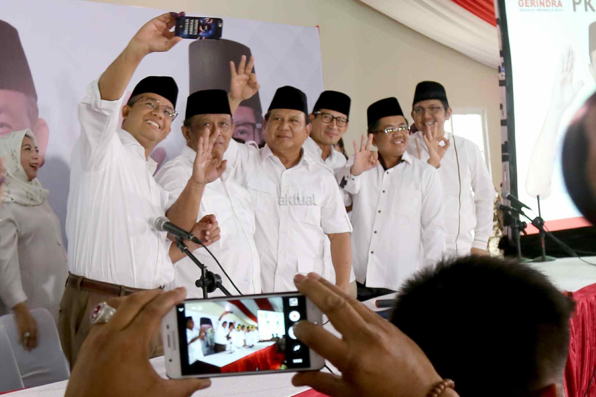 Calon gubernur dan wakil gubernur DKI, Anies Baswedan dan Sandiaga Uno melakukan foto selfie bersama Ketua Umum Partai Gerindra Prabowo Subianto dan Presiden PKS M Sohibul Iman usai memberikan keterangan di DPP Gerindra, Jakarta, Rabu (15/2). Menurut Prabowo, Pilkada DKI merupakan simbol 'pertarungan' dua kekuatan. "Pilkada, DKI khususnya sudah menjadi simbol pertarungan antara yang ingin memperjuangkan keadilan, kebenaran, kejujuran dan yang ingin membuktikan bahwa uang bisa menjajah seluruh rakyat Indonesia. AKTUAL/Tino Oktaviano
